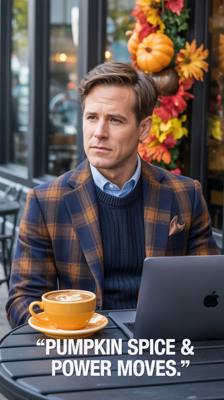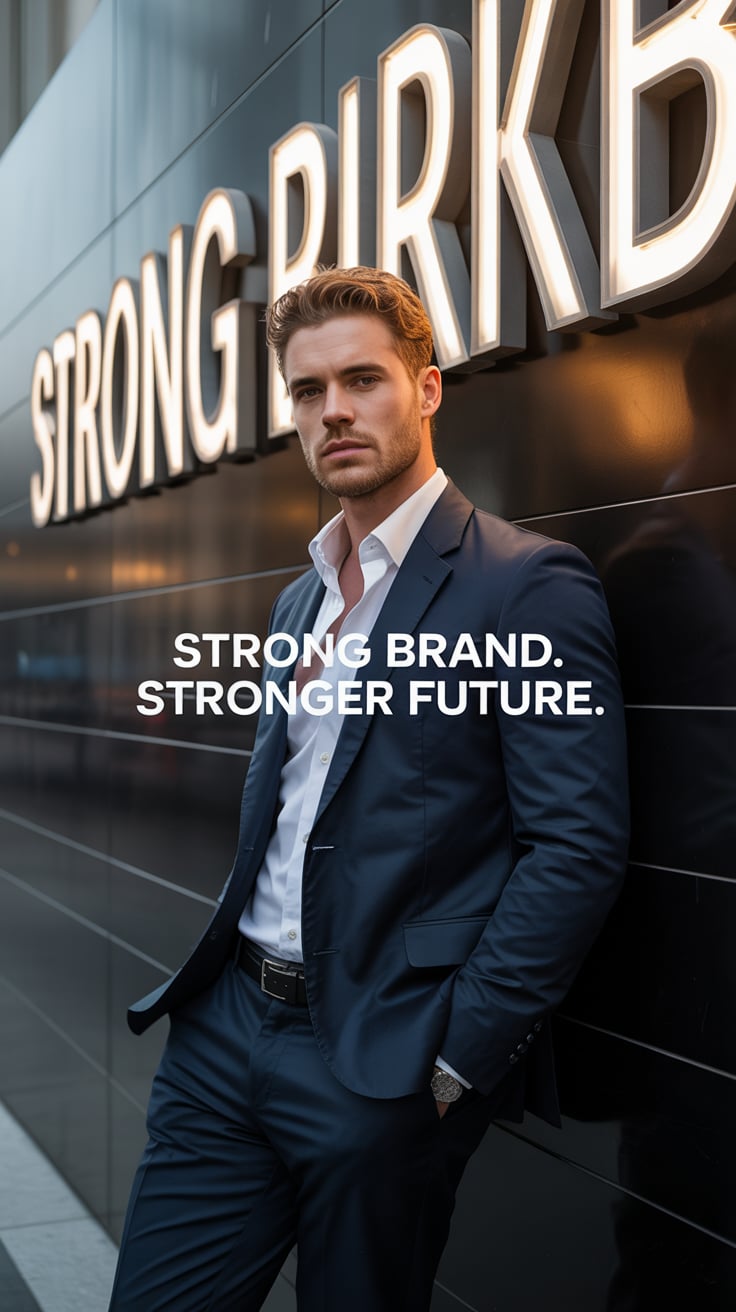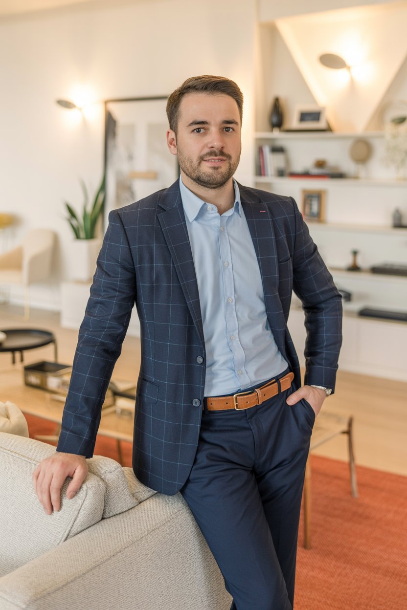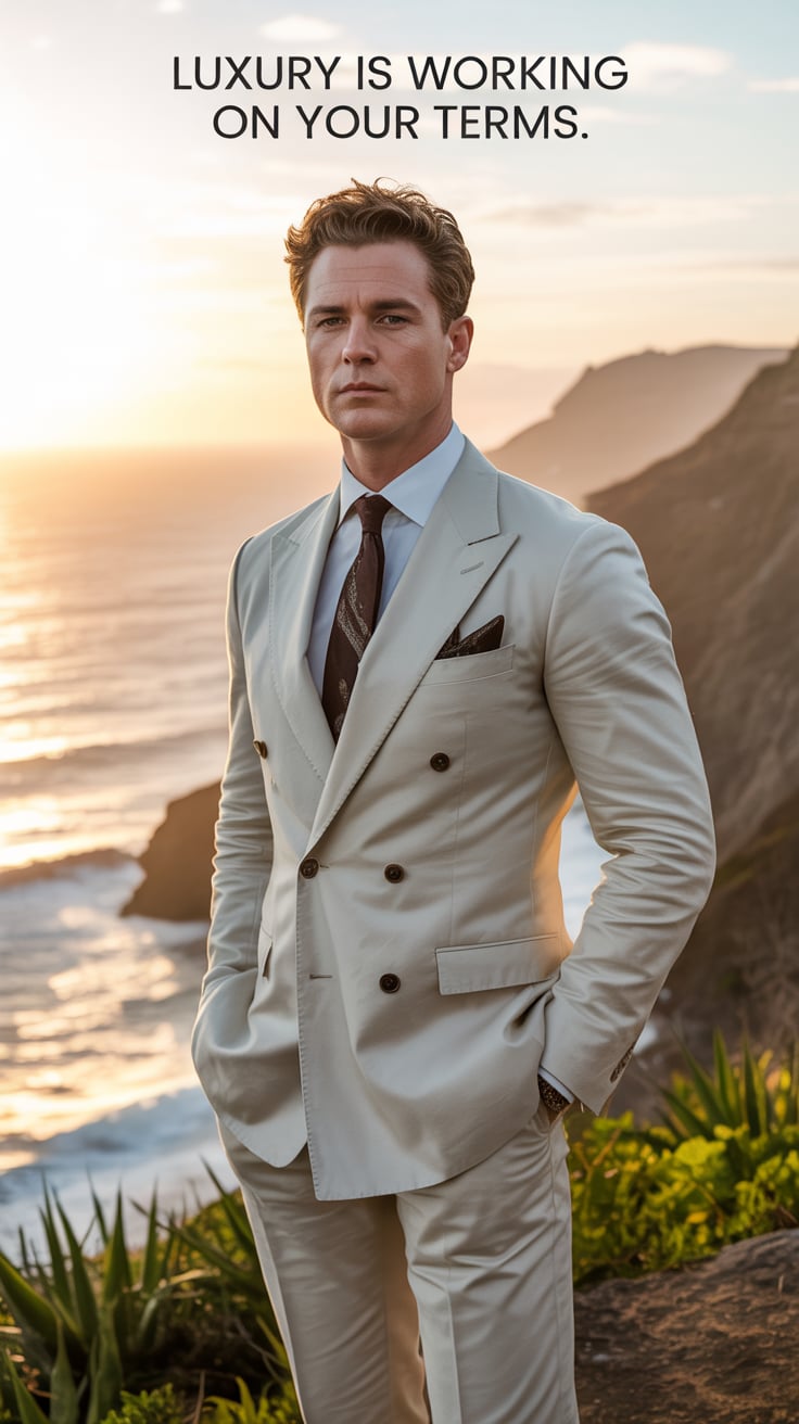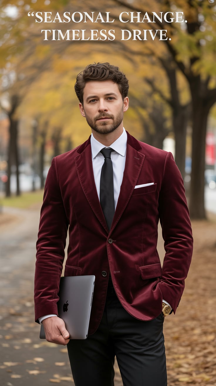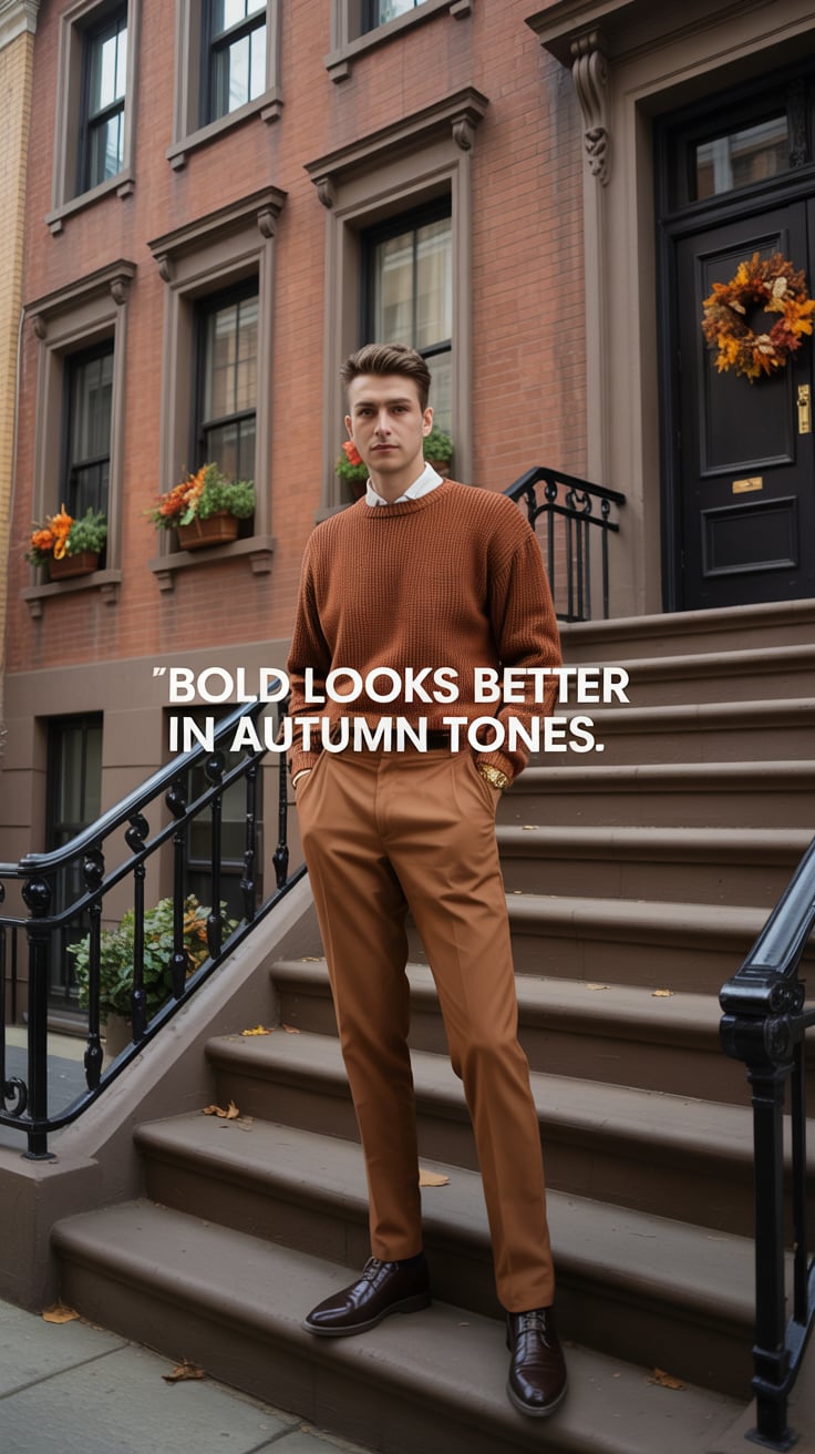 A cinematic editorial of a (skin tone) male in a rust-colored blazer and dark trousers, leaning on a...