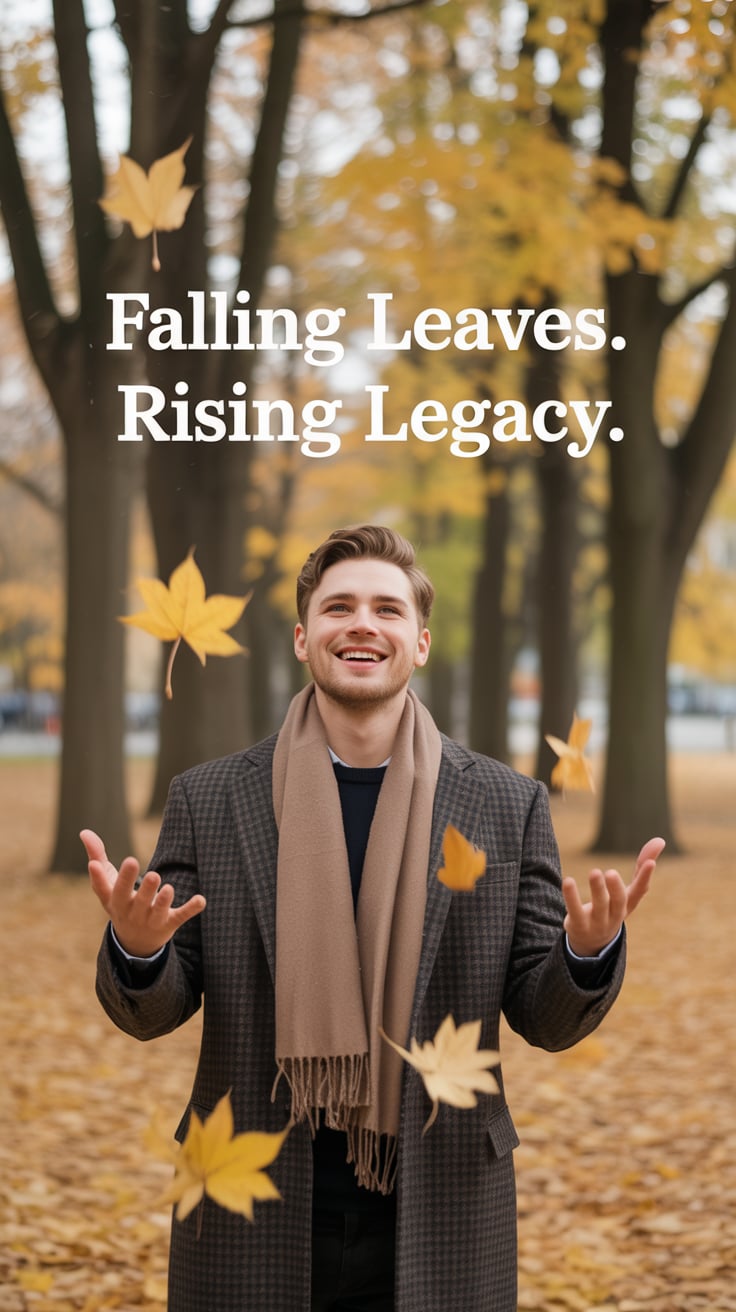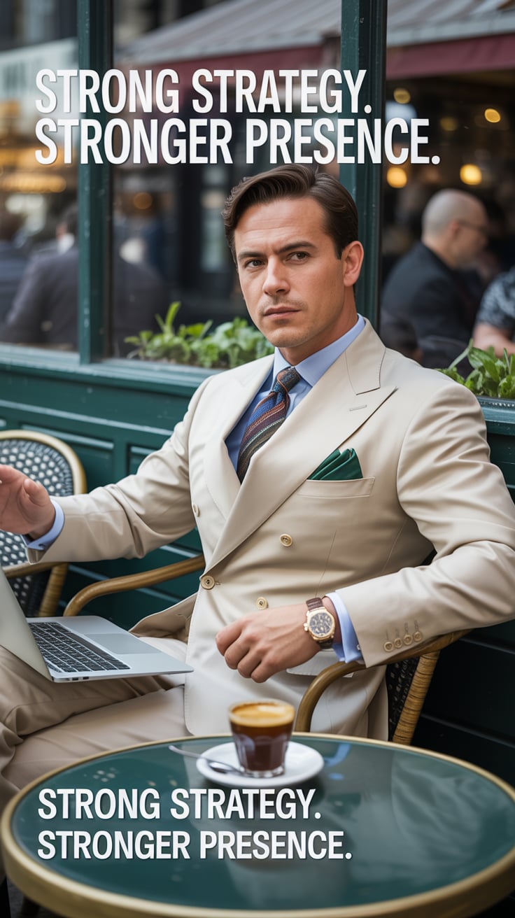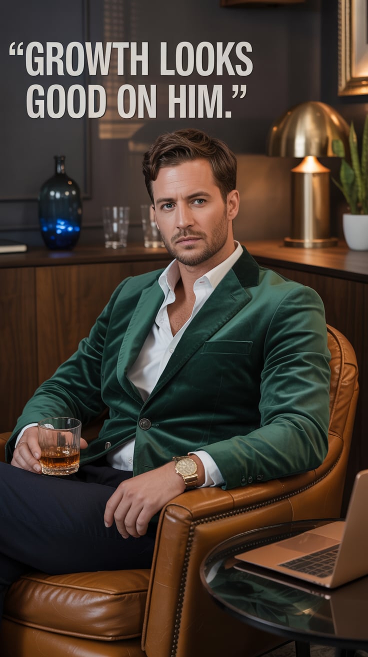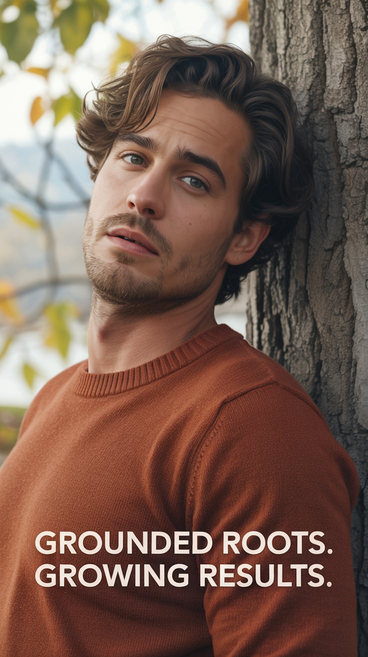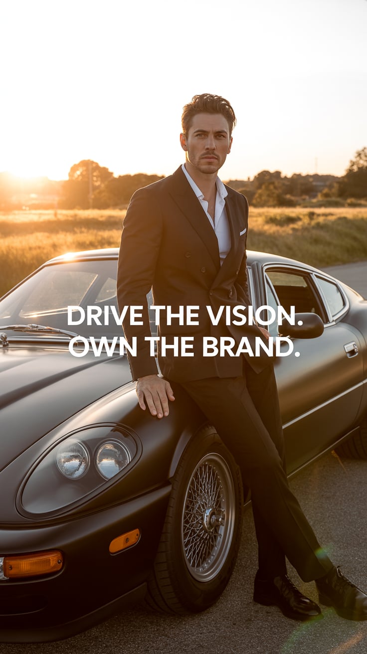 A cinematic editorial of a (skin tone) male in a rust-colored blazer and dark trousers, leaning on a...