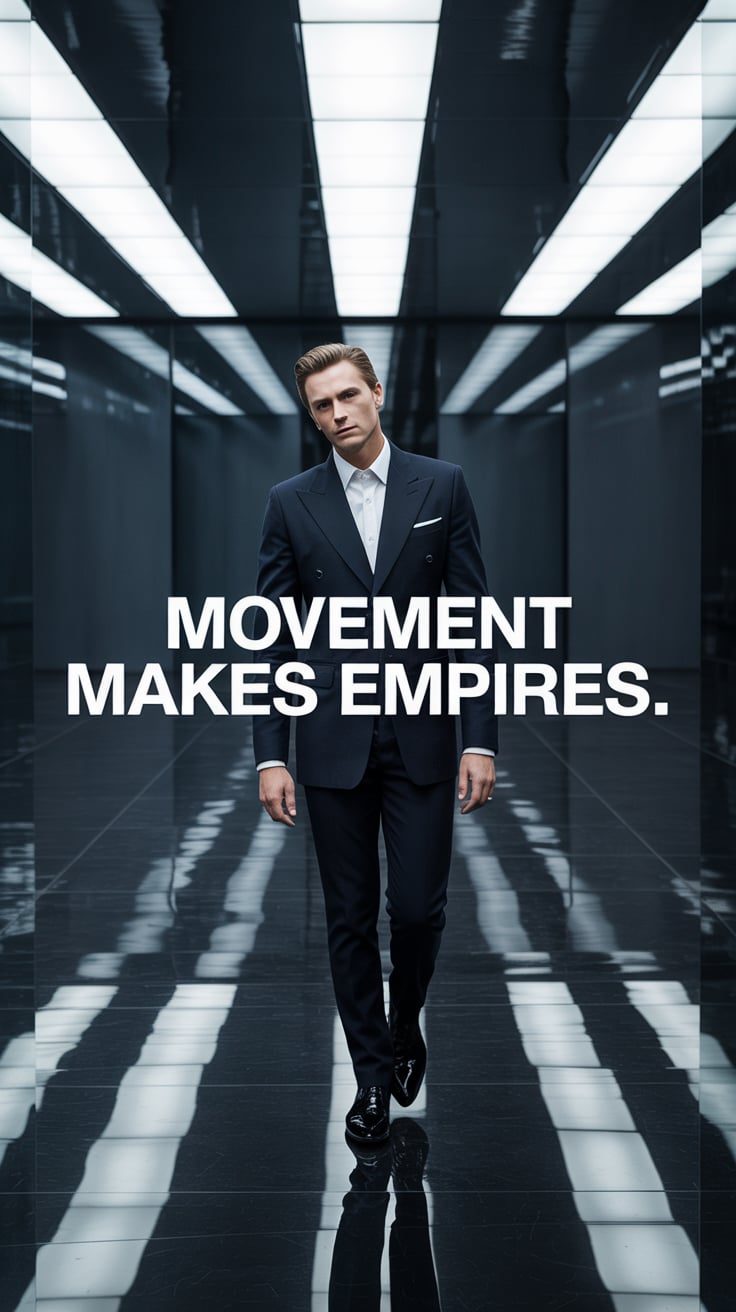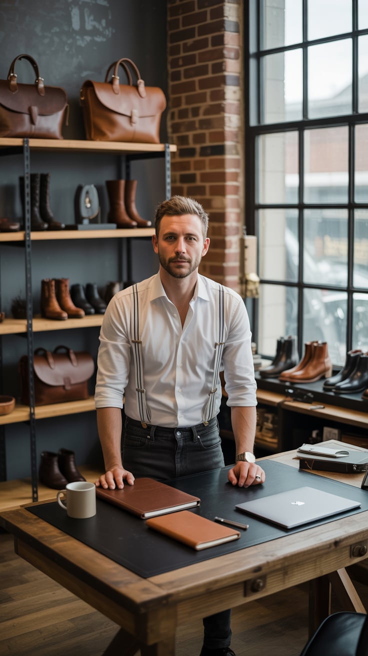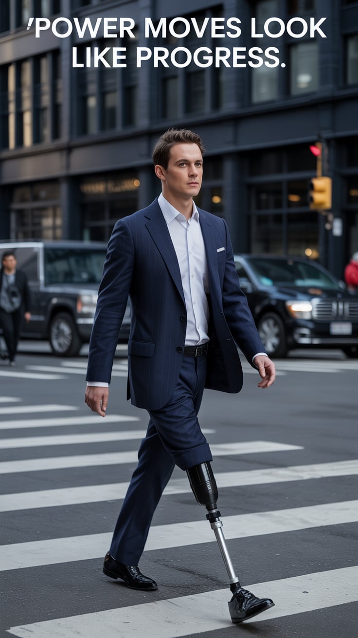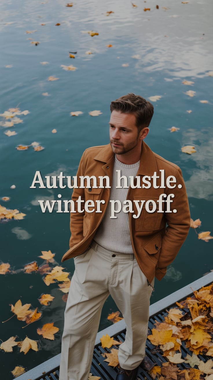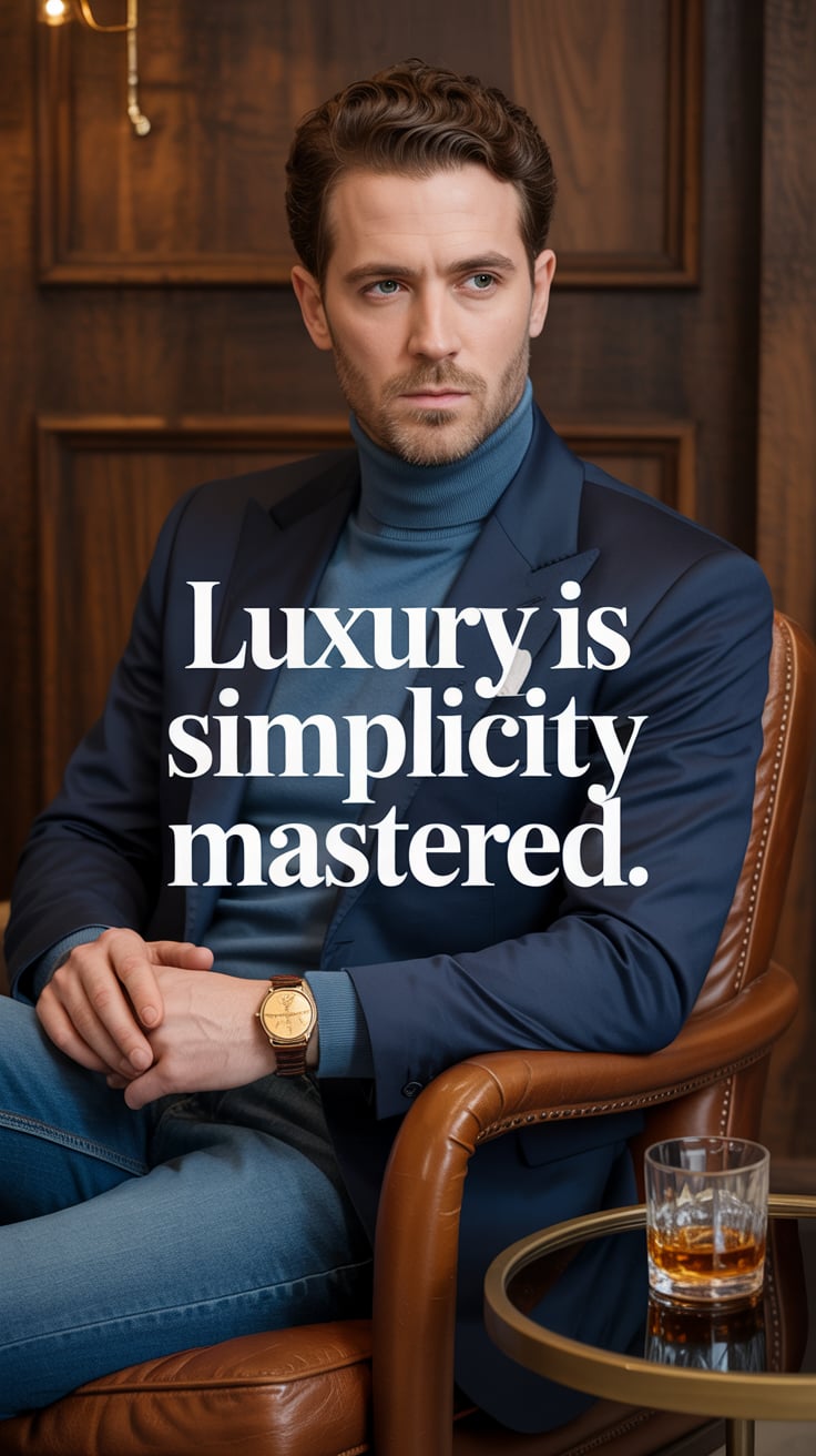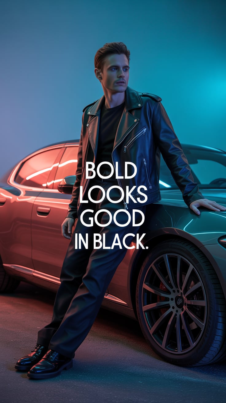 A cinematic editorial of a (skin tone) male in a rust-colored blazer and dark trousers, leaning on a...