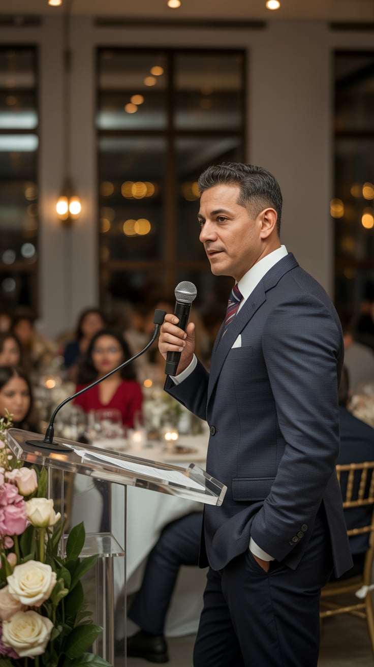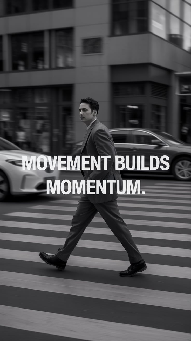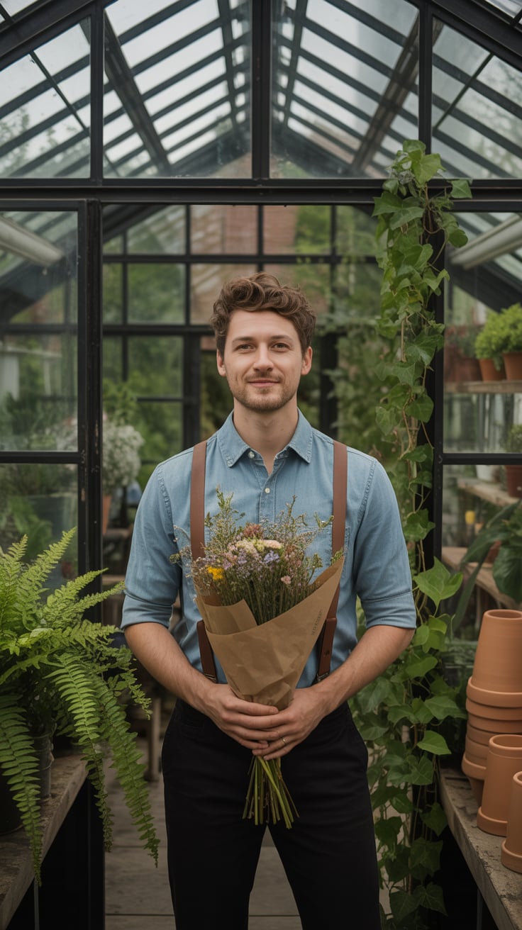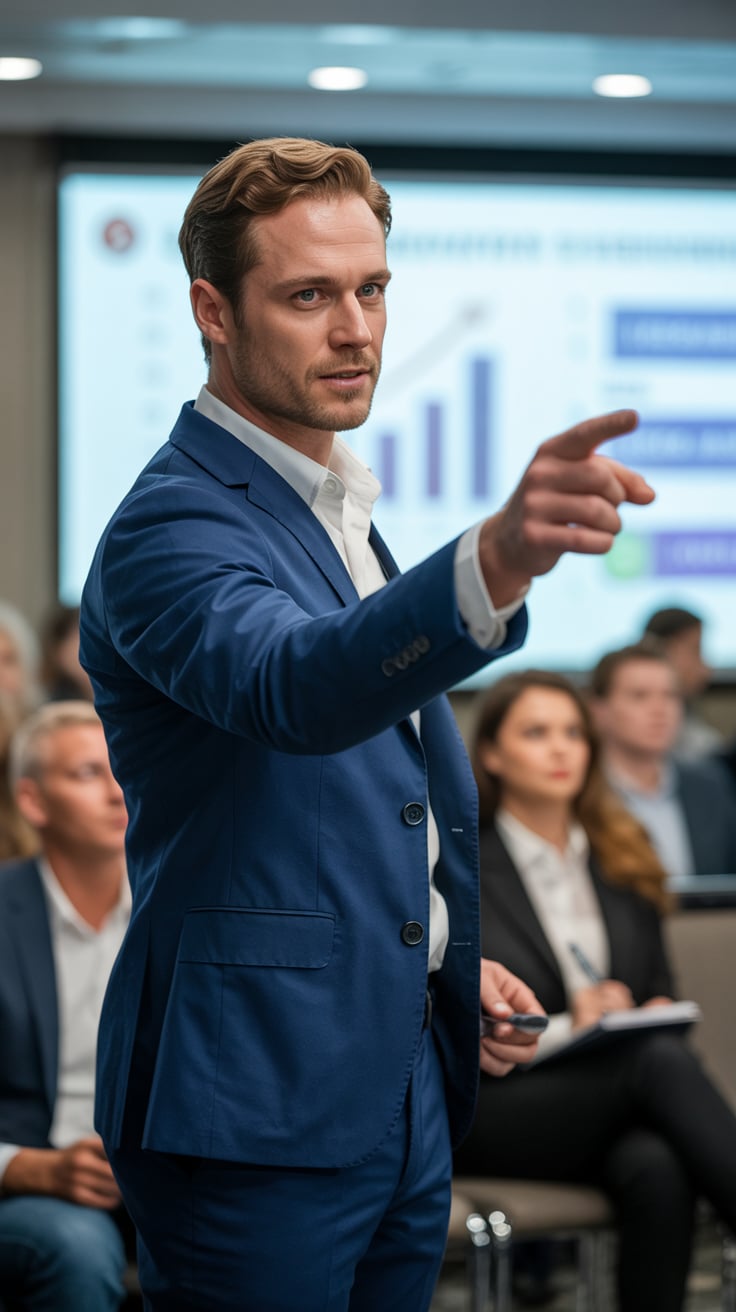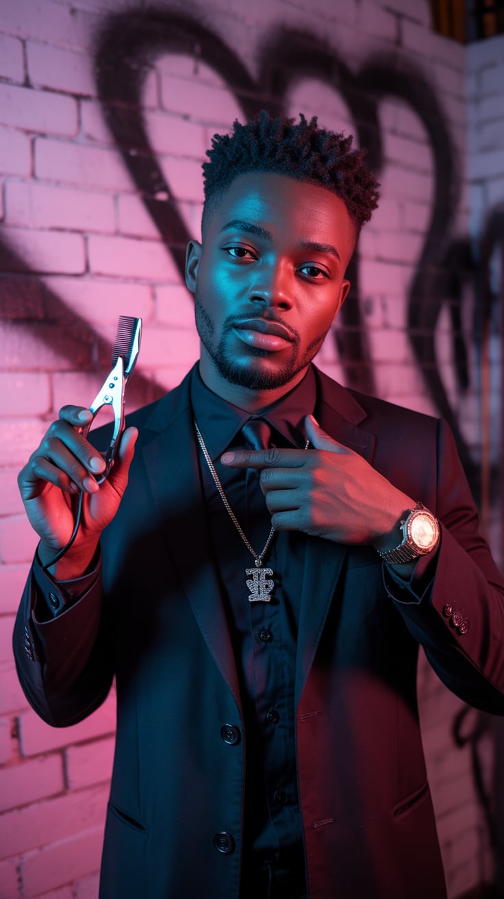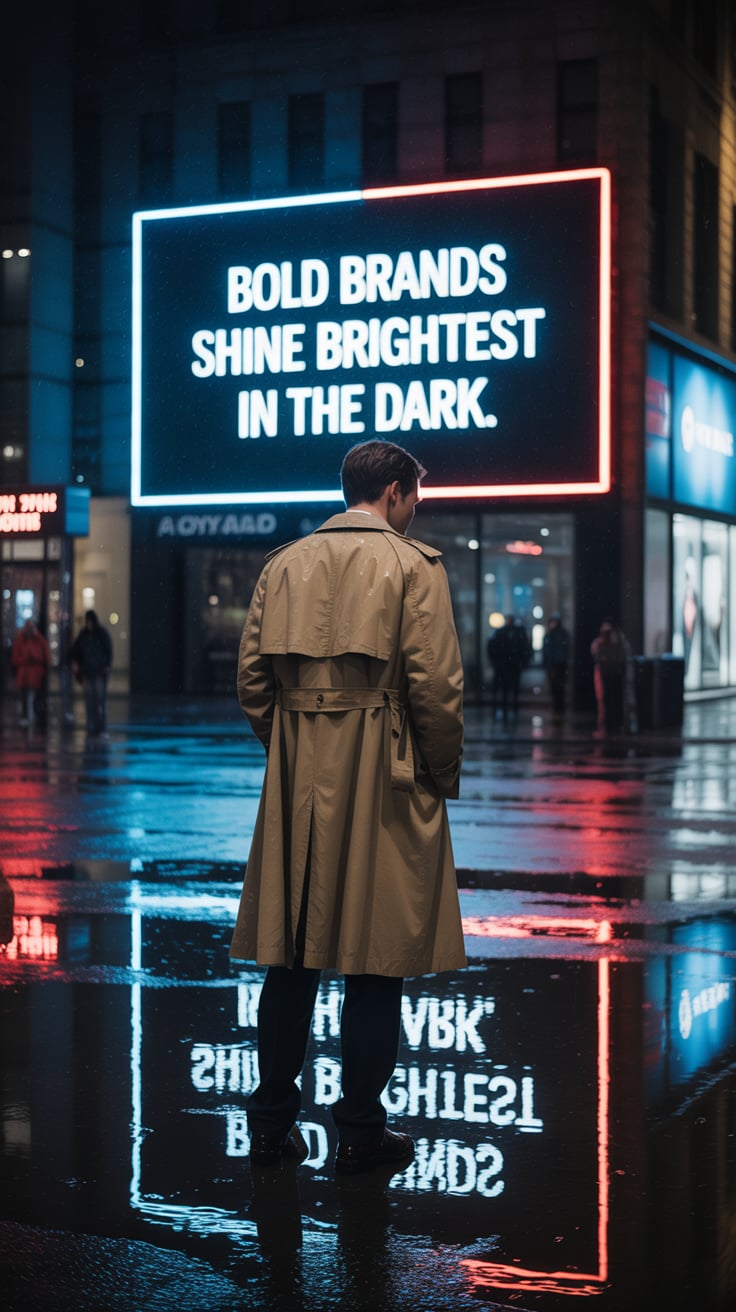 A cinematic editorial of a (skin tone) male in a rust-colored blazer and dark trousers, leaning on a...