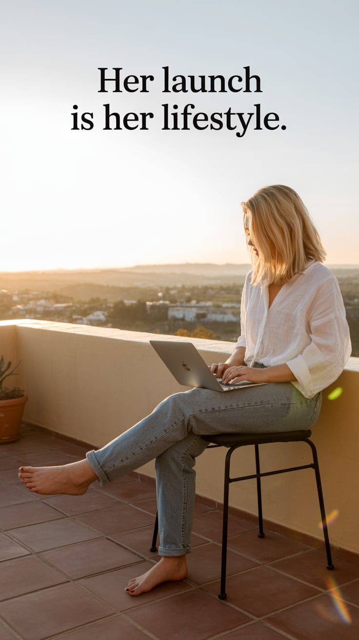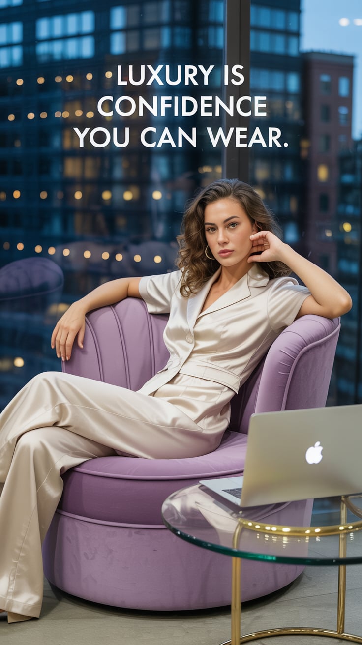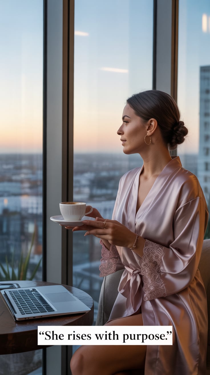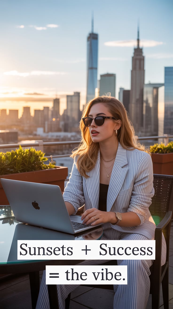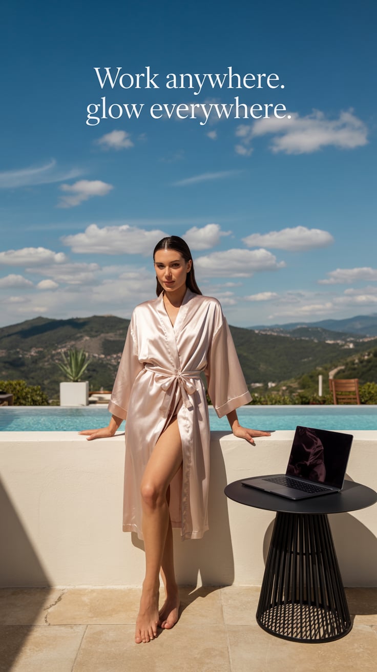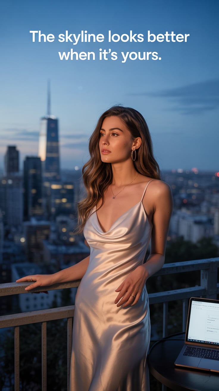 A cinematic rooftop terrace shot of a (skin tone) female in a silk robe, laptop on a side table, inf...