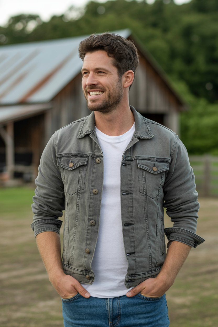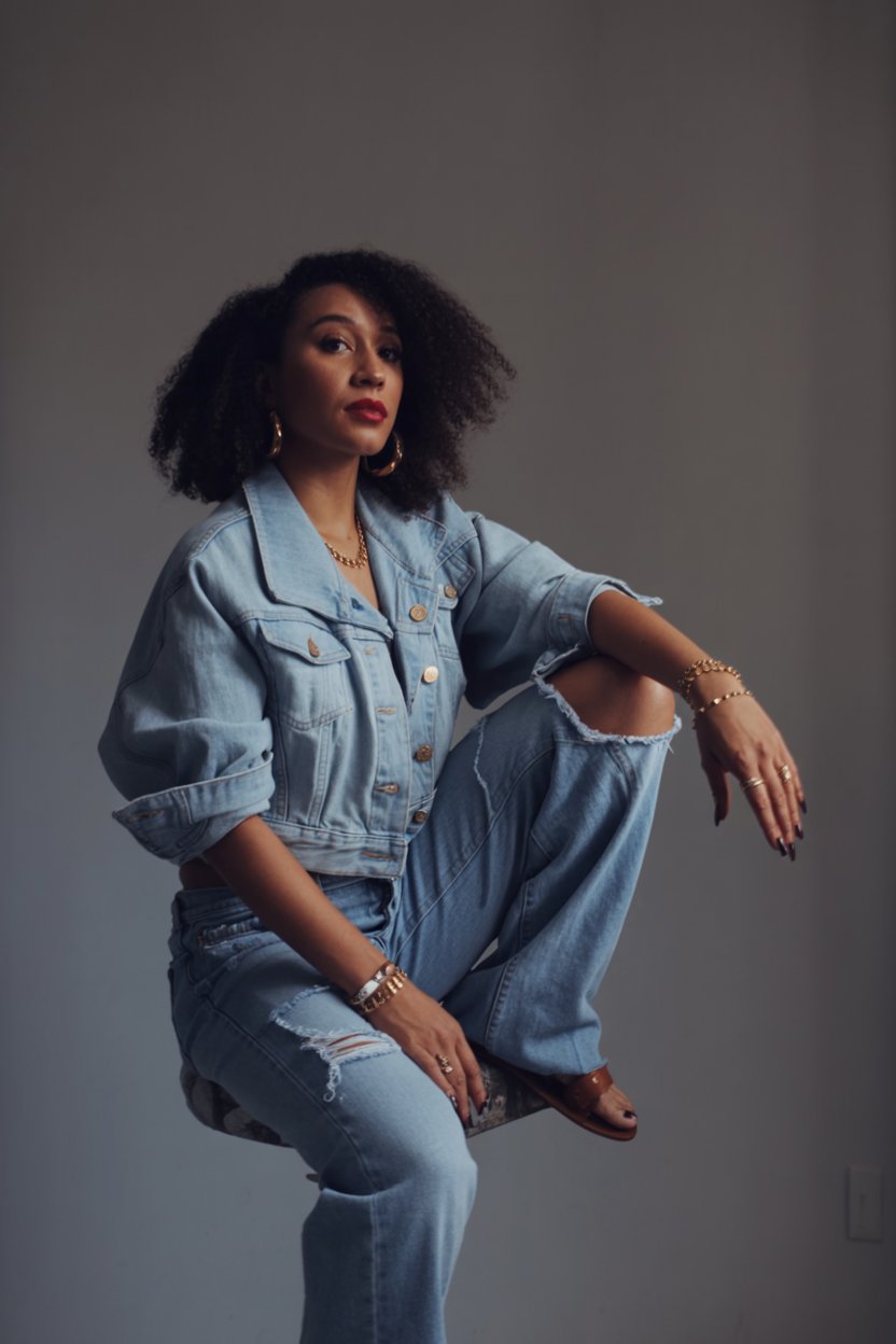 Studio portrait on neutral backdrop. A (skin color) (gender/subject) styled in double denim: light-w...