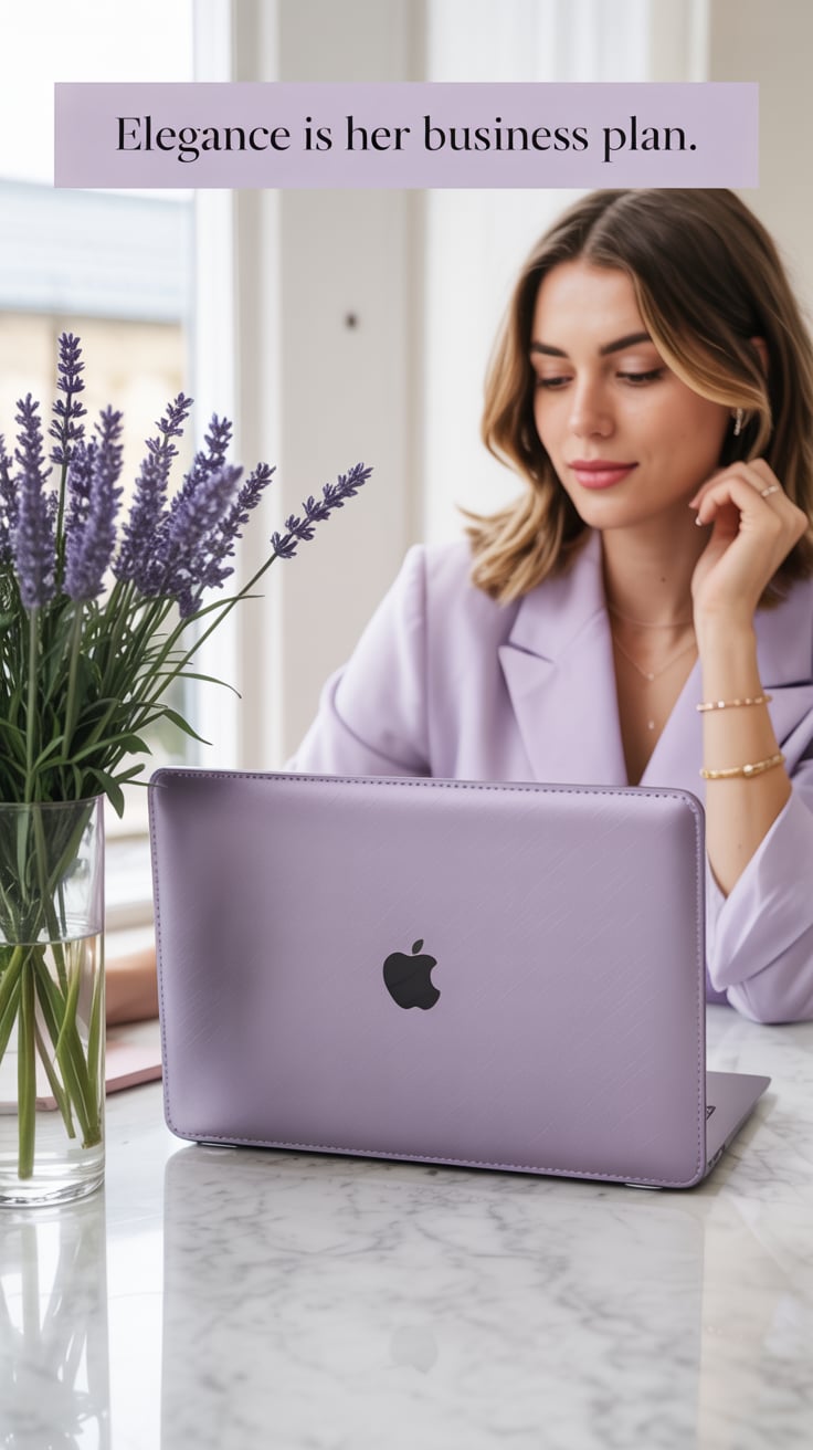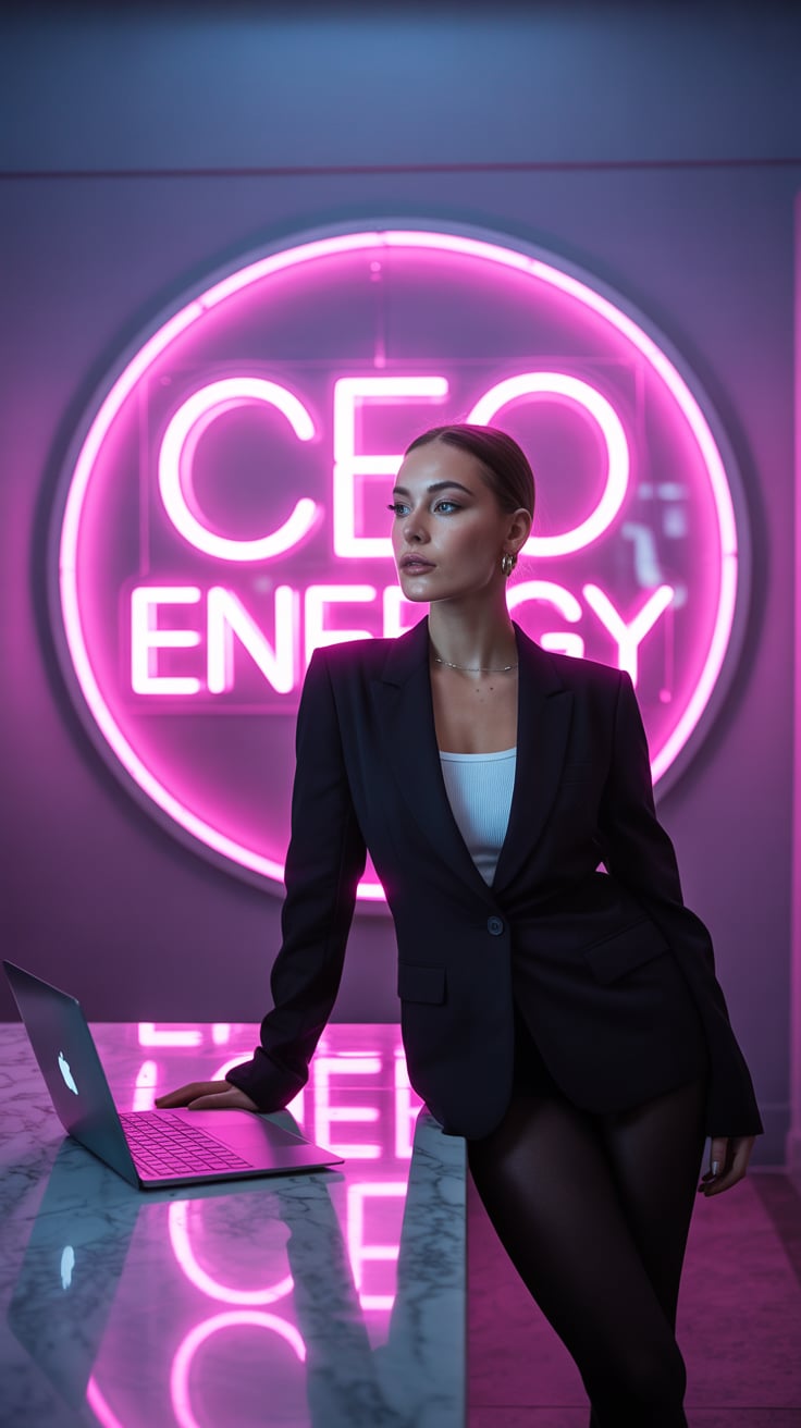 A high-fashion indoor image of a (skin tone) female seated at a polished marble table with a laptop ...