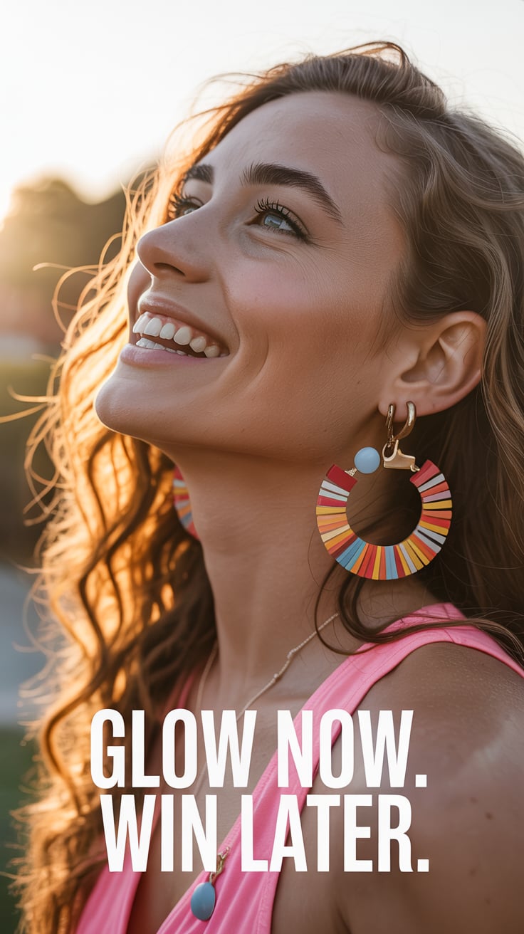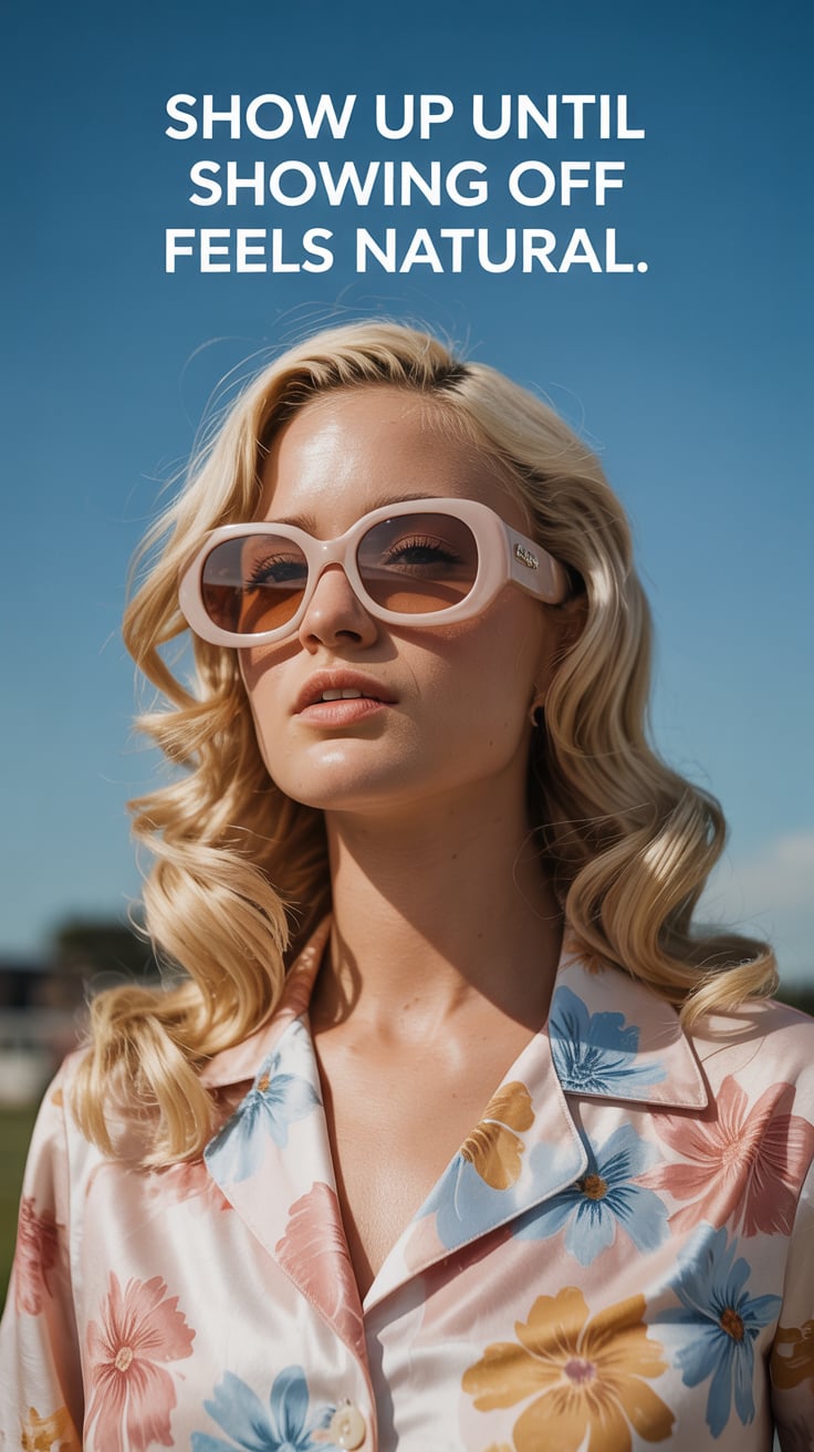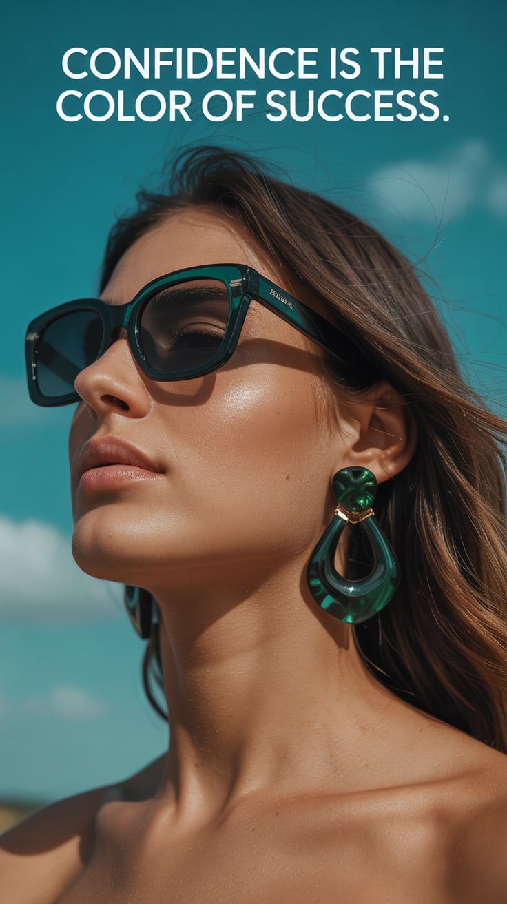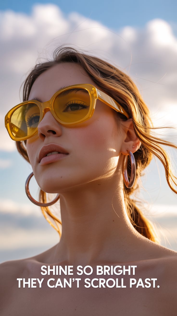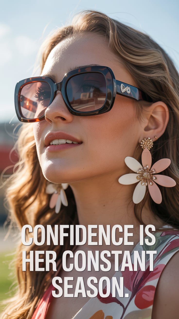 Editorial close-up of a (skin tone) woman in oversized sunglasses with floral earrings, glowing spri...