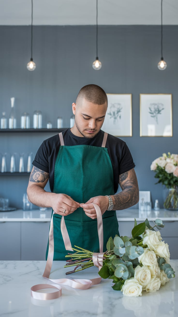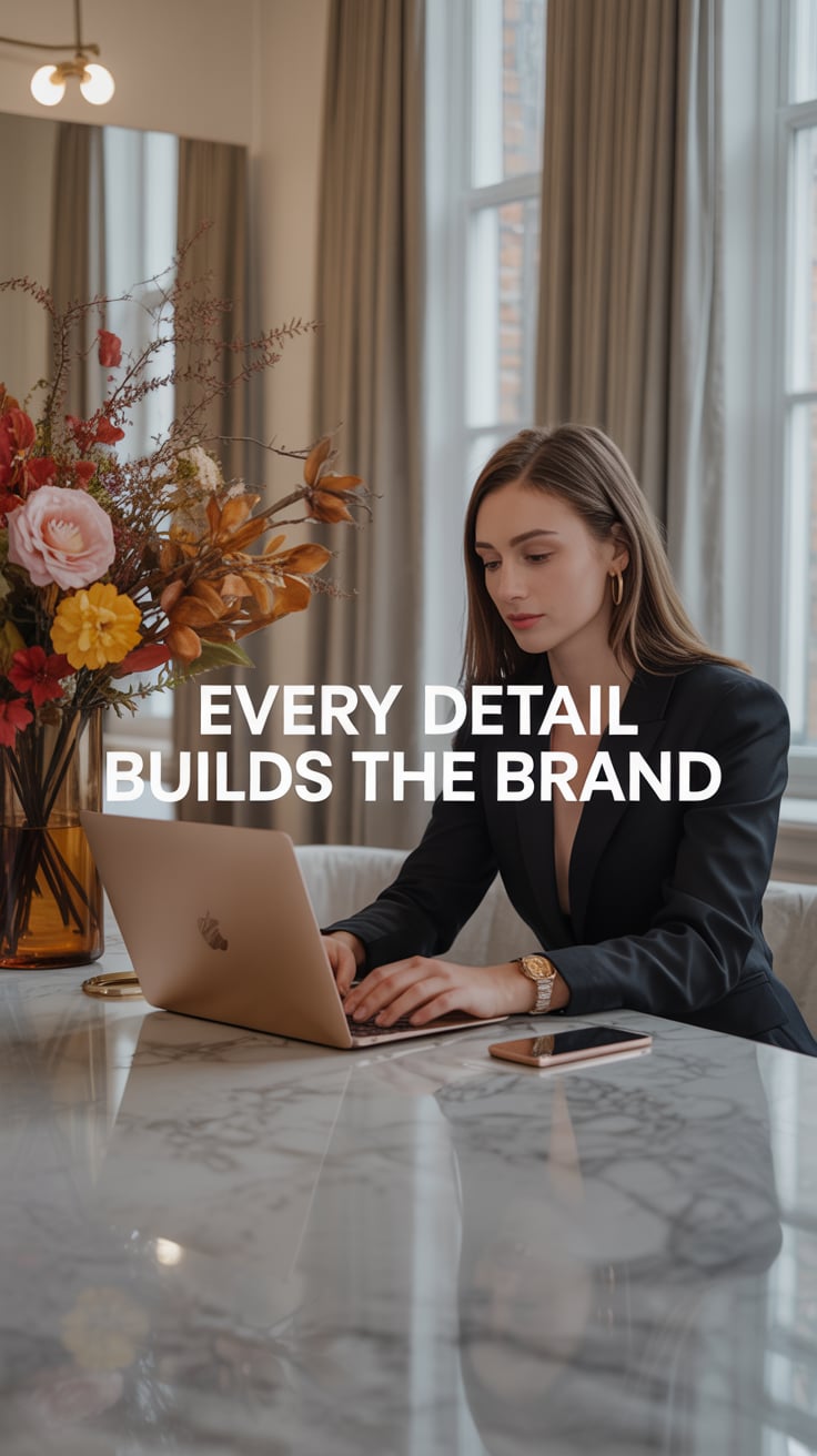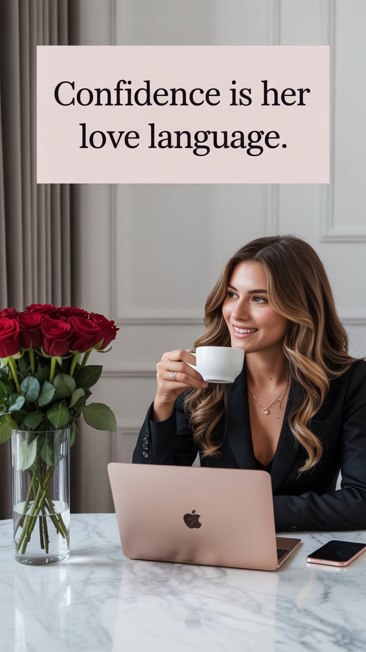 Luxury lifestyle image of a (skin tone) female at a marble desk with a laptop and a vase of red rose...
