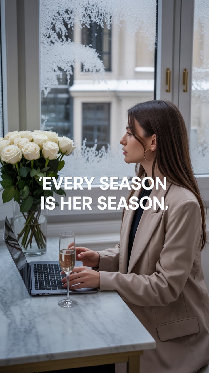 A luxury lifestyle image of a (skin tone) female seated at a marble desk with white roses, snow show...