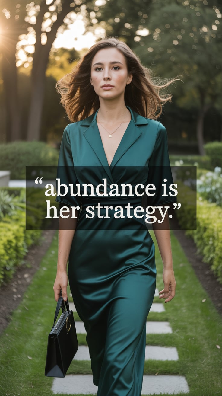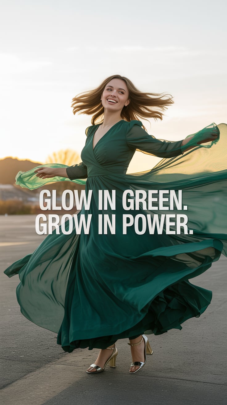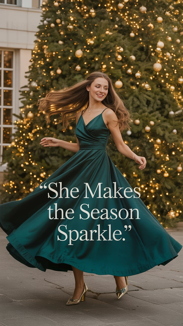 Christmas theme: Fashion-inspired wide shot of a (skin tone) woman in an emerald satin gown twirling...