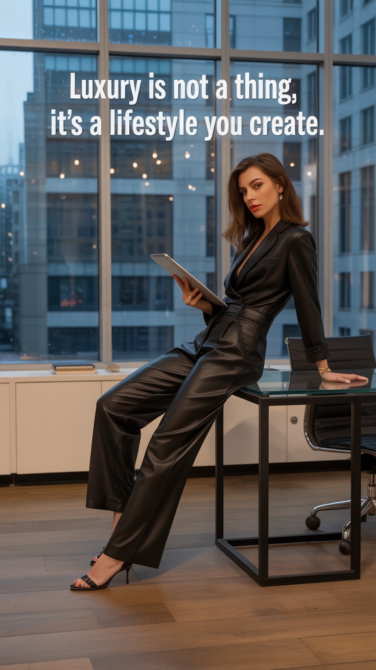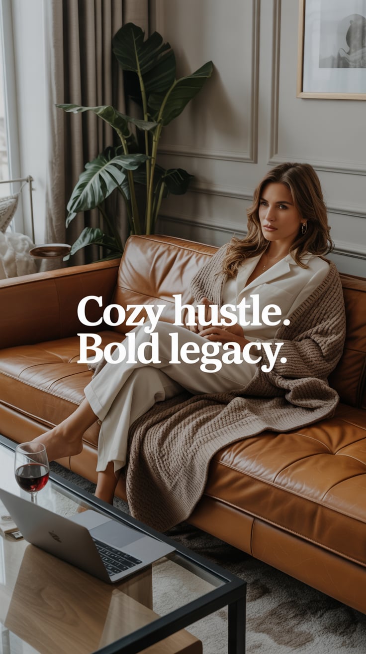 A luxury fashion image of a (skin tone) female reclining on a leather sofa with an oversized knit bl...