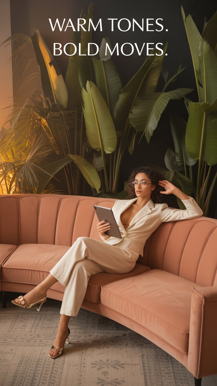 A lifestyle portrait of a (skin color) (gender/subject) sitting cross-legged on a (cream sofa). Outf...