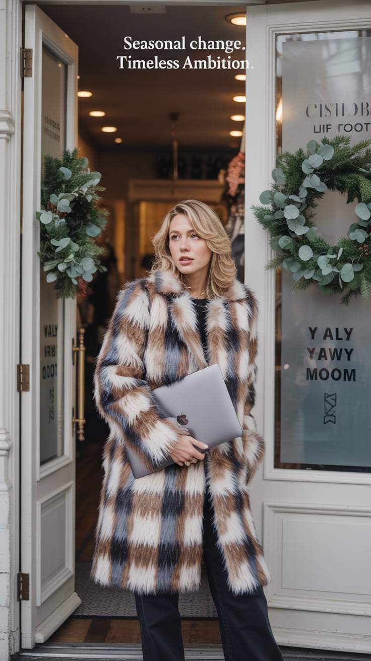 An editorial portrait of a (skin tone) female in a luxurious faux-fur coat, laptop tucked under her ...