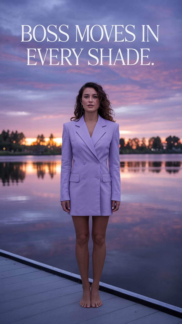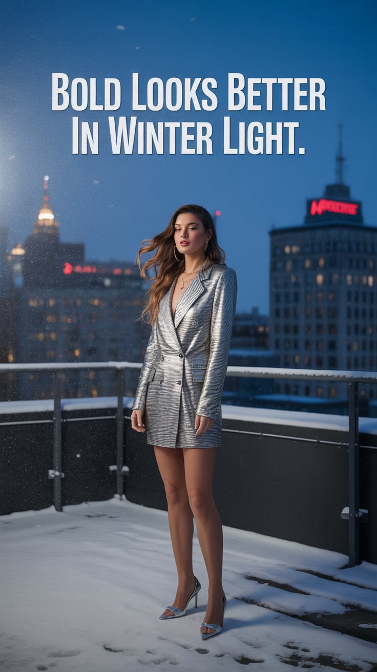 A dreamy rooftop photo of a (skin tone) female in a silver blazer dress, heels glinting, standing un...