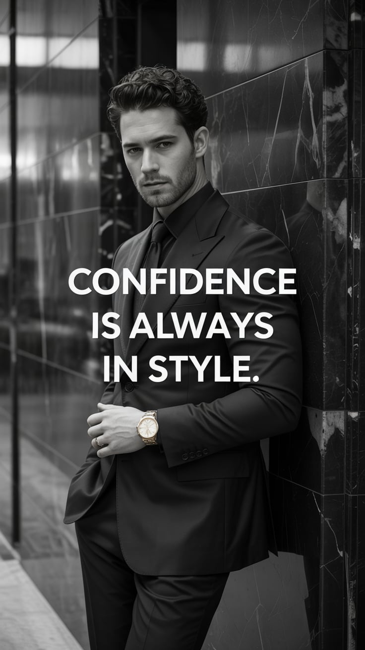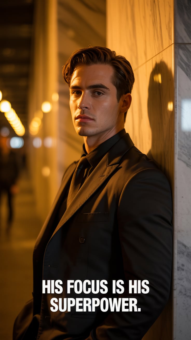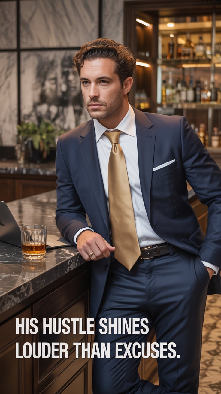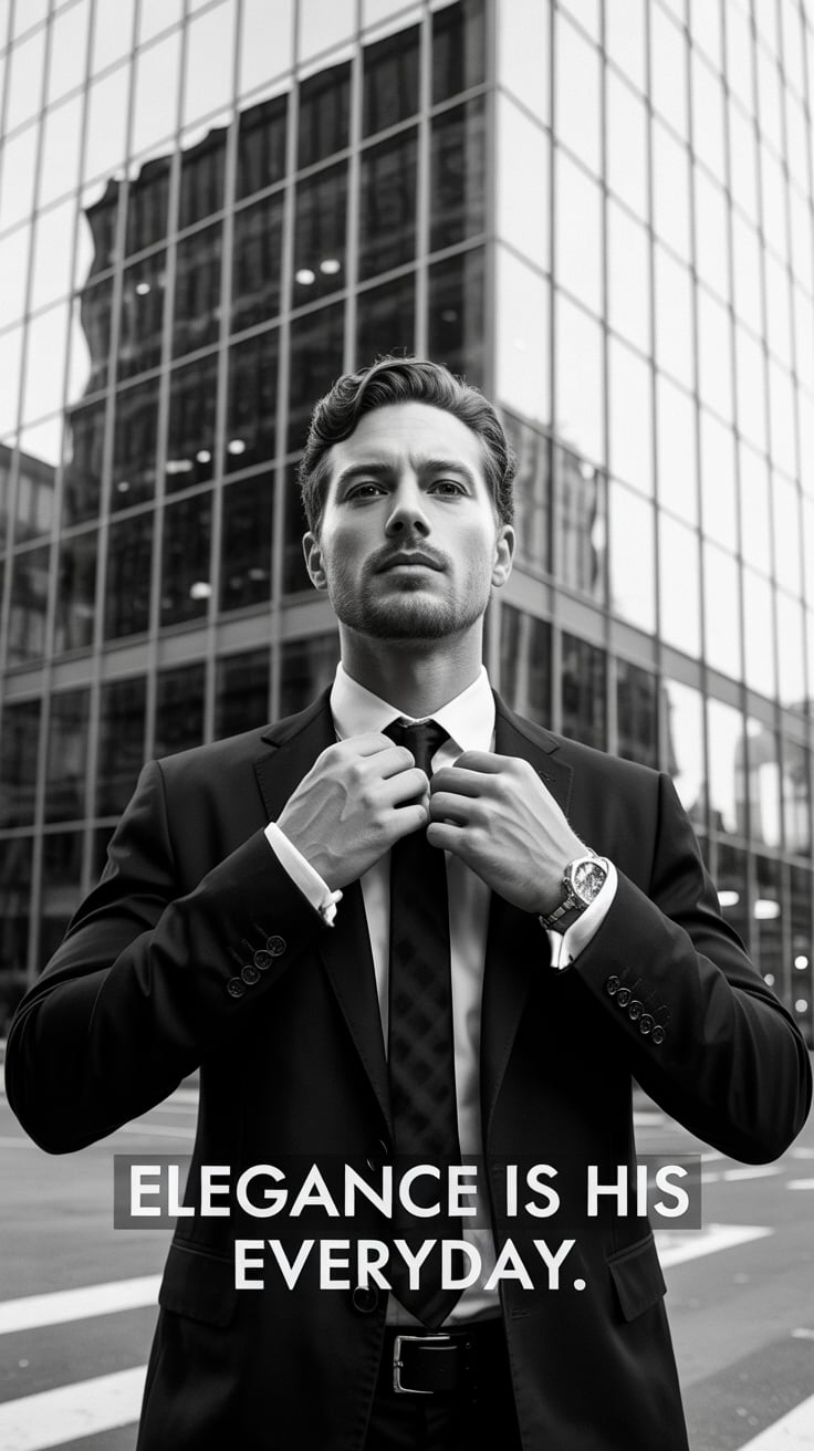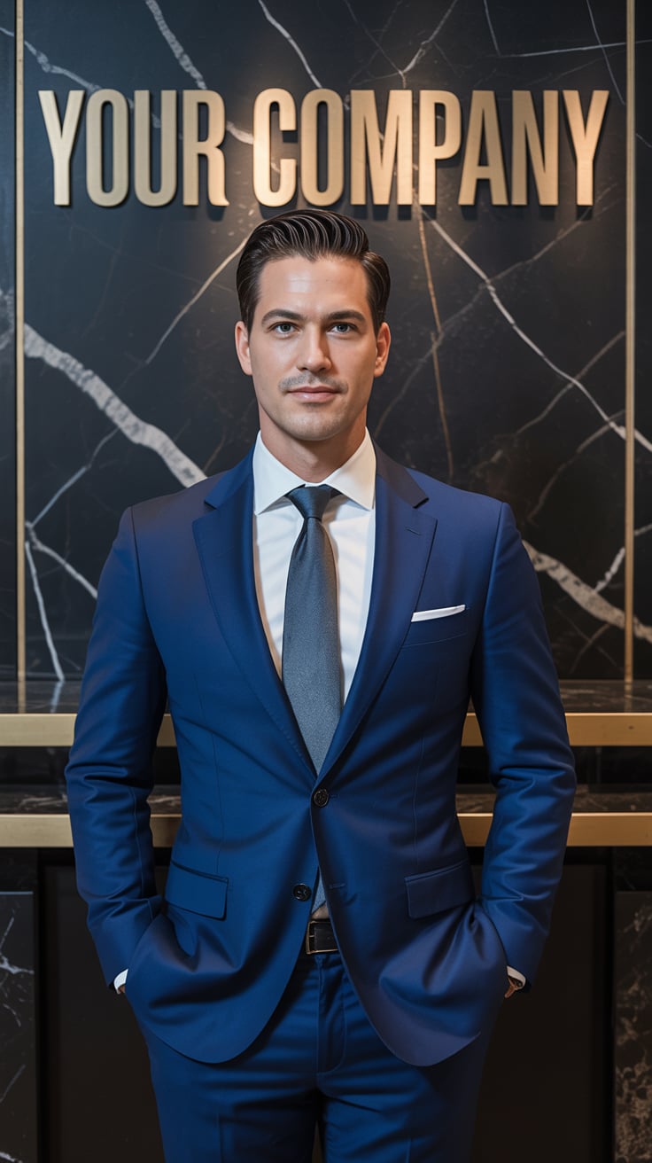 A luxury lifestyle image of a (skin tone) male in a tailored suit with a silver tie, leaning against...