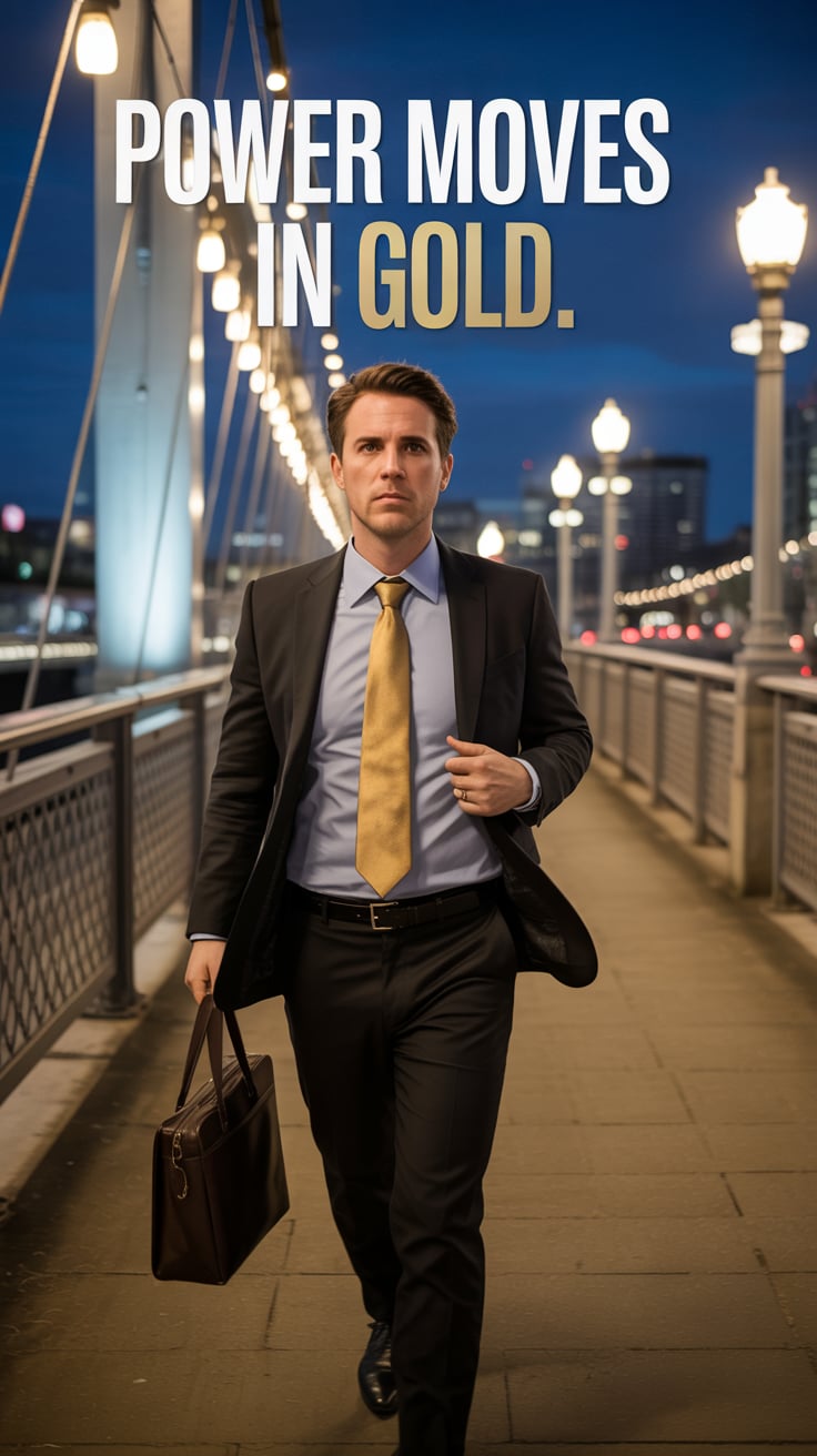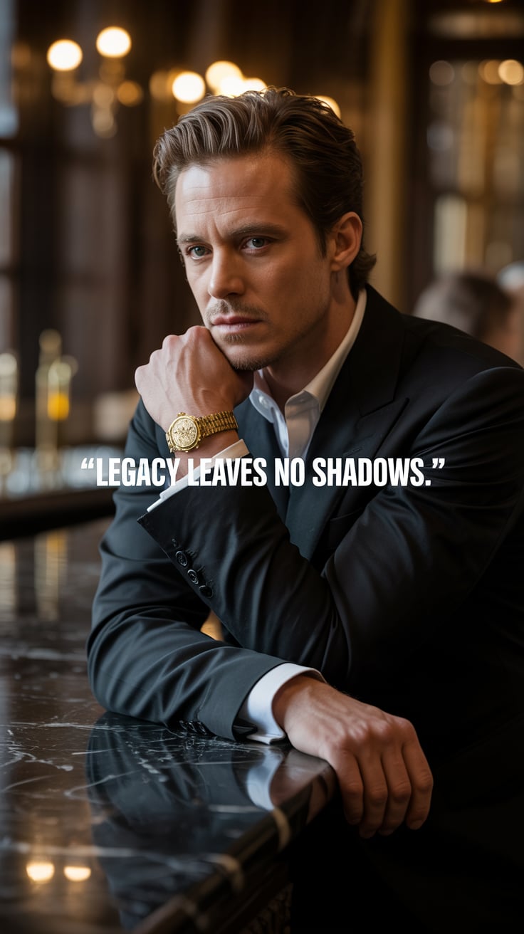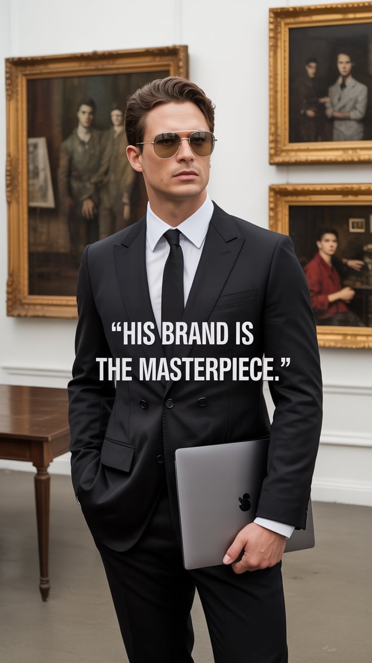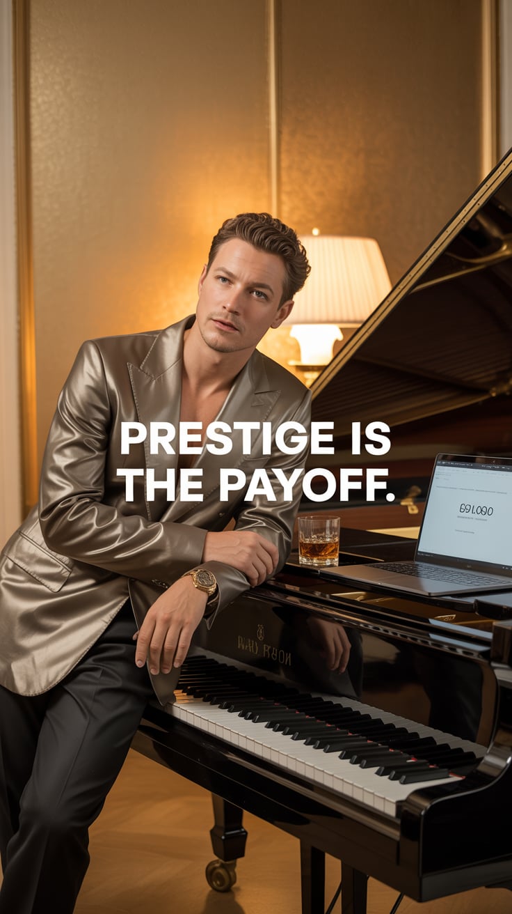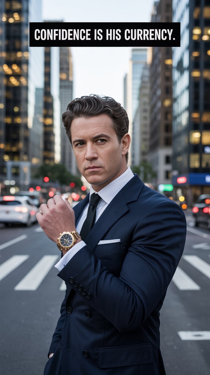 A luxury lifestyle image of a (skin tone) male in a tailored suit with a silver tie, leaning against...