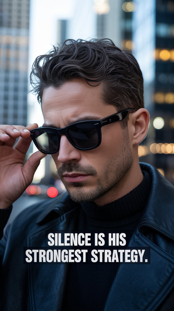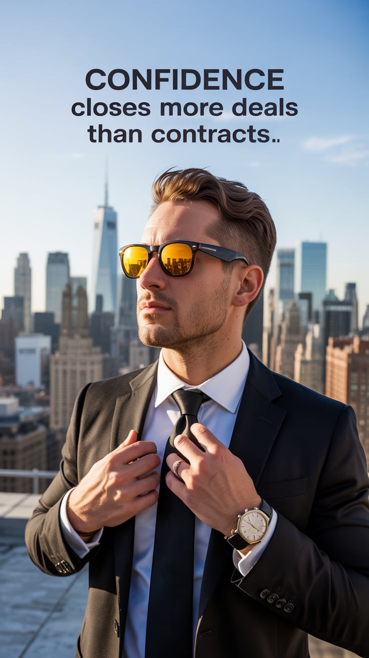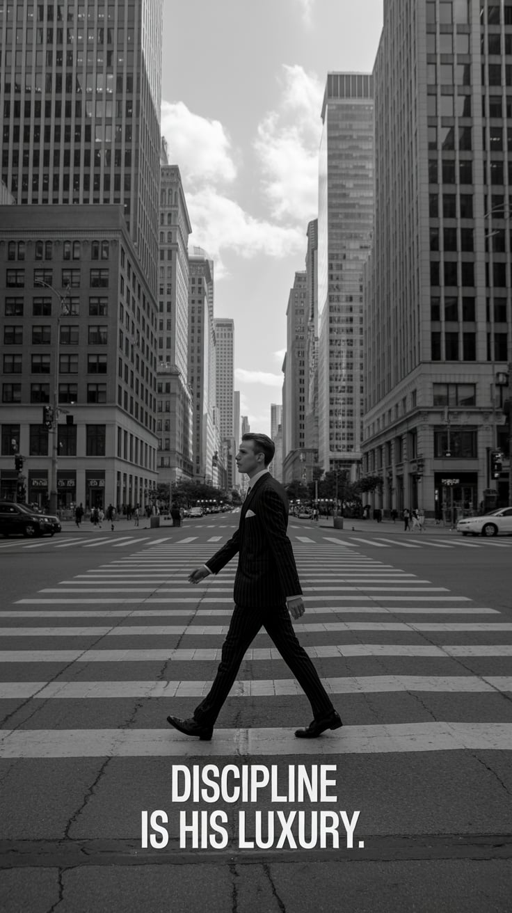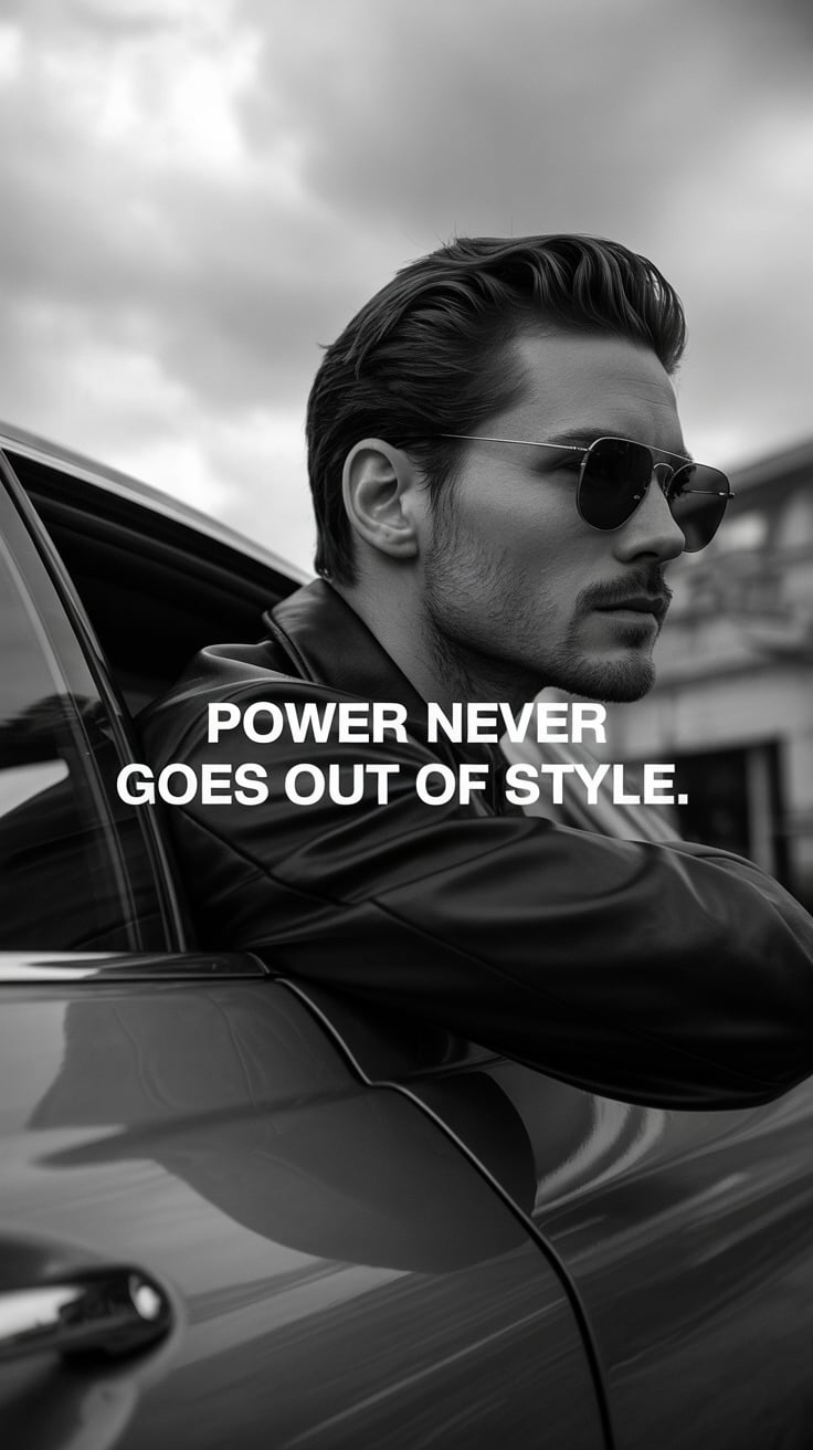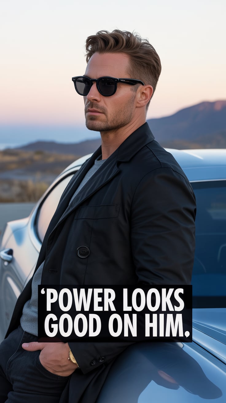 A luxury lifestyle image of a (skin tone) male in a tailored suit with a silver tie, leaning against...