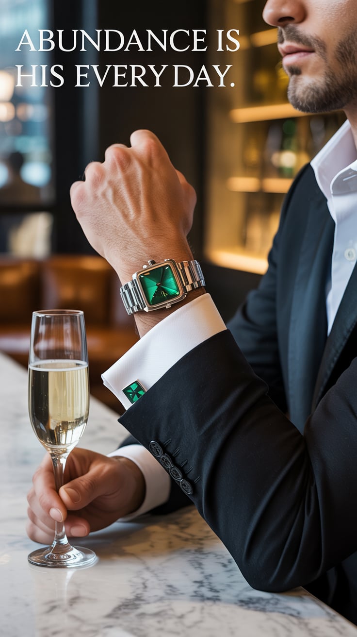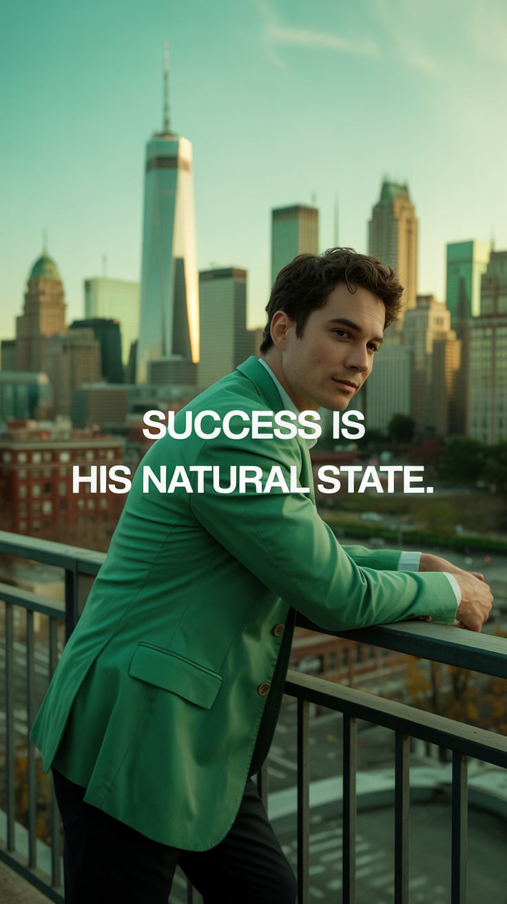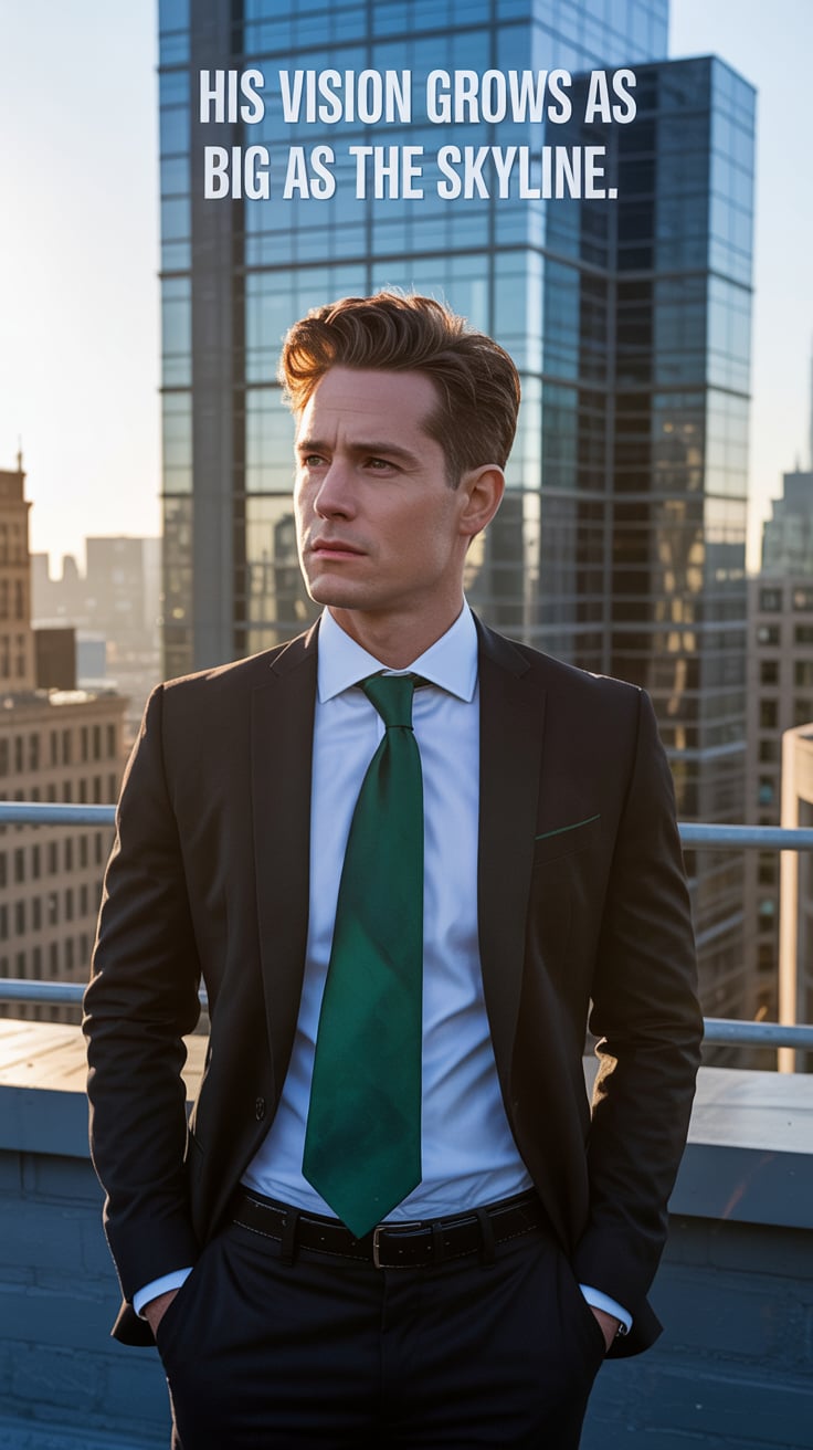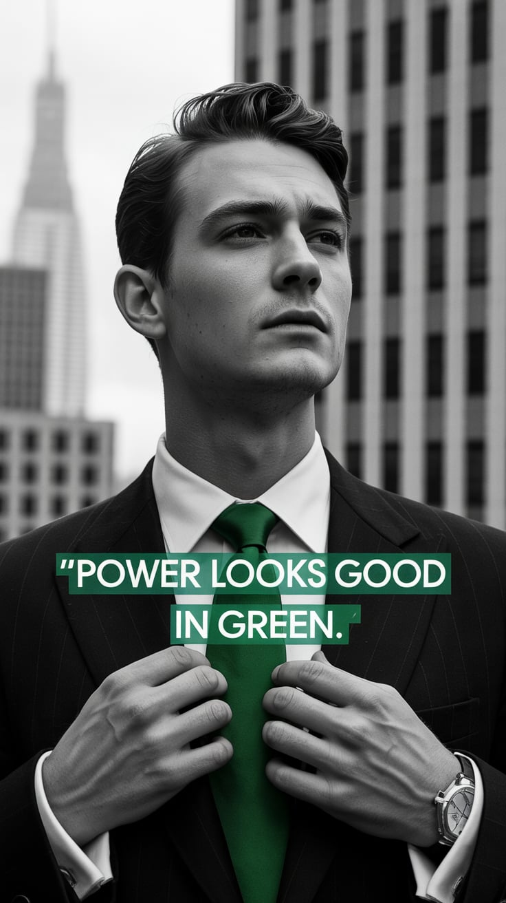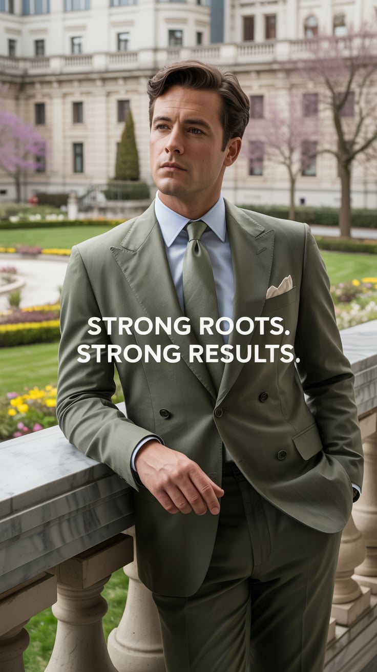 Cinematic editorial of a (skin tone) man in a sage green tie and tailored suit, leaning casually aga...