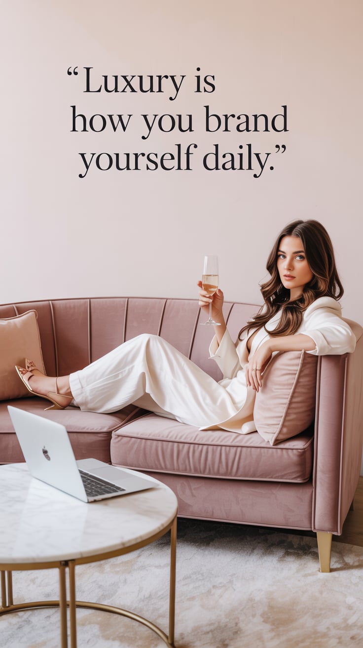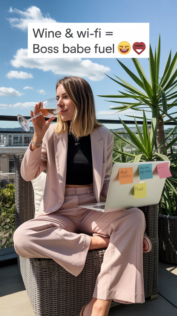 Luxury editorial portrait of a (skin tone) woman in a pastel suit, sipping champagne on a rooftop te...