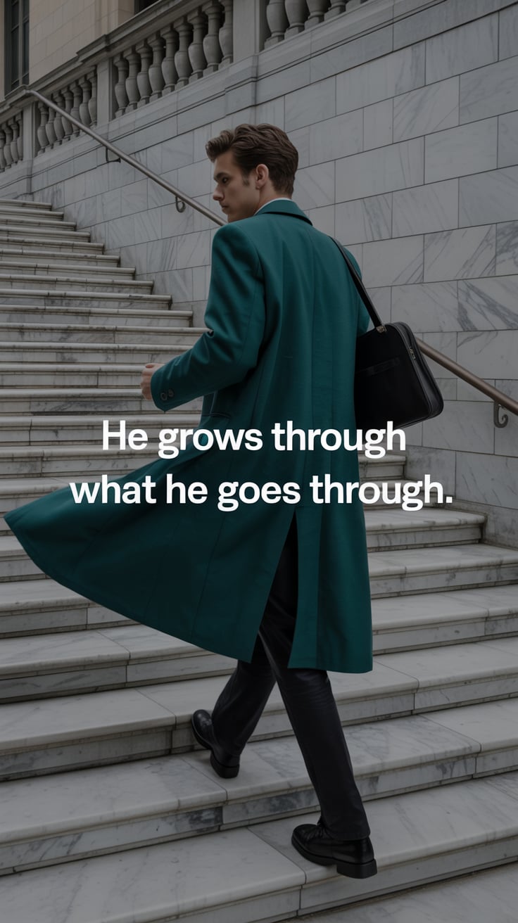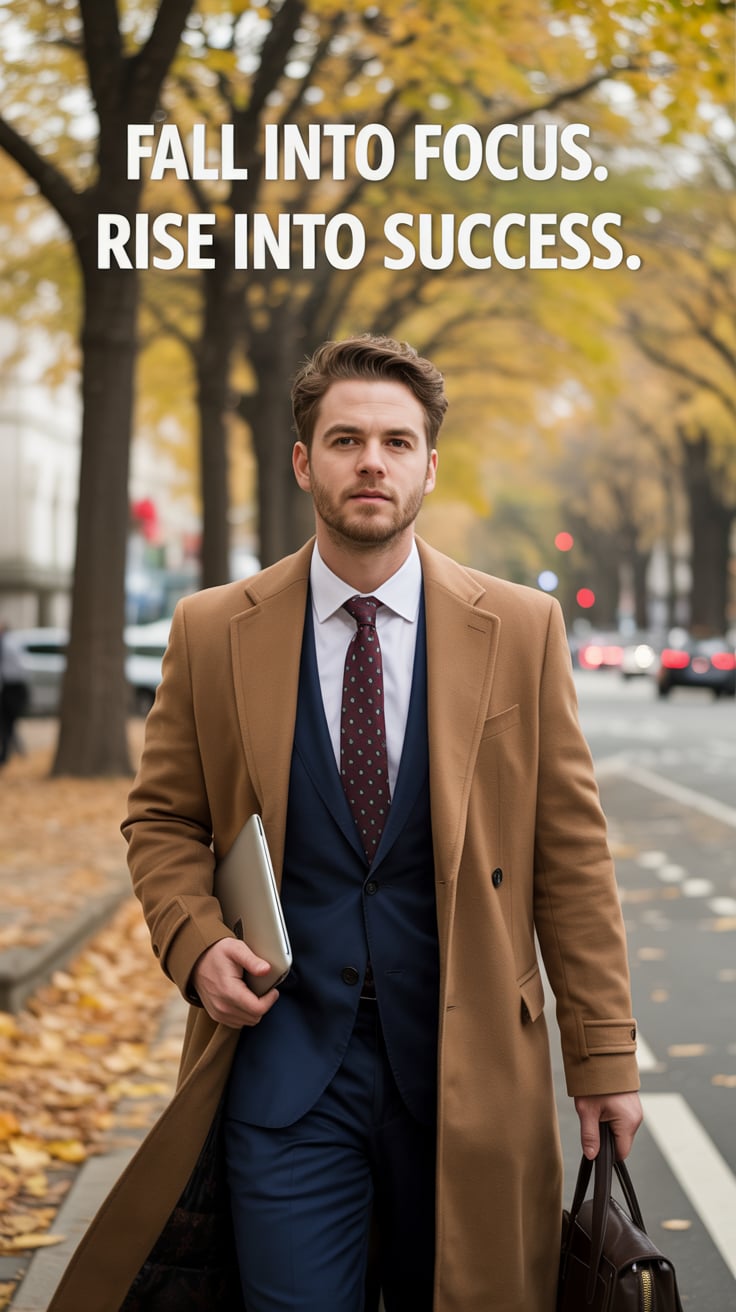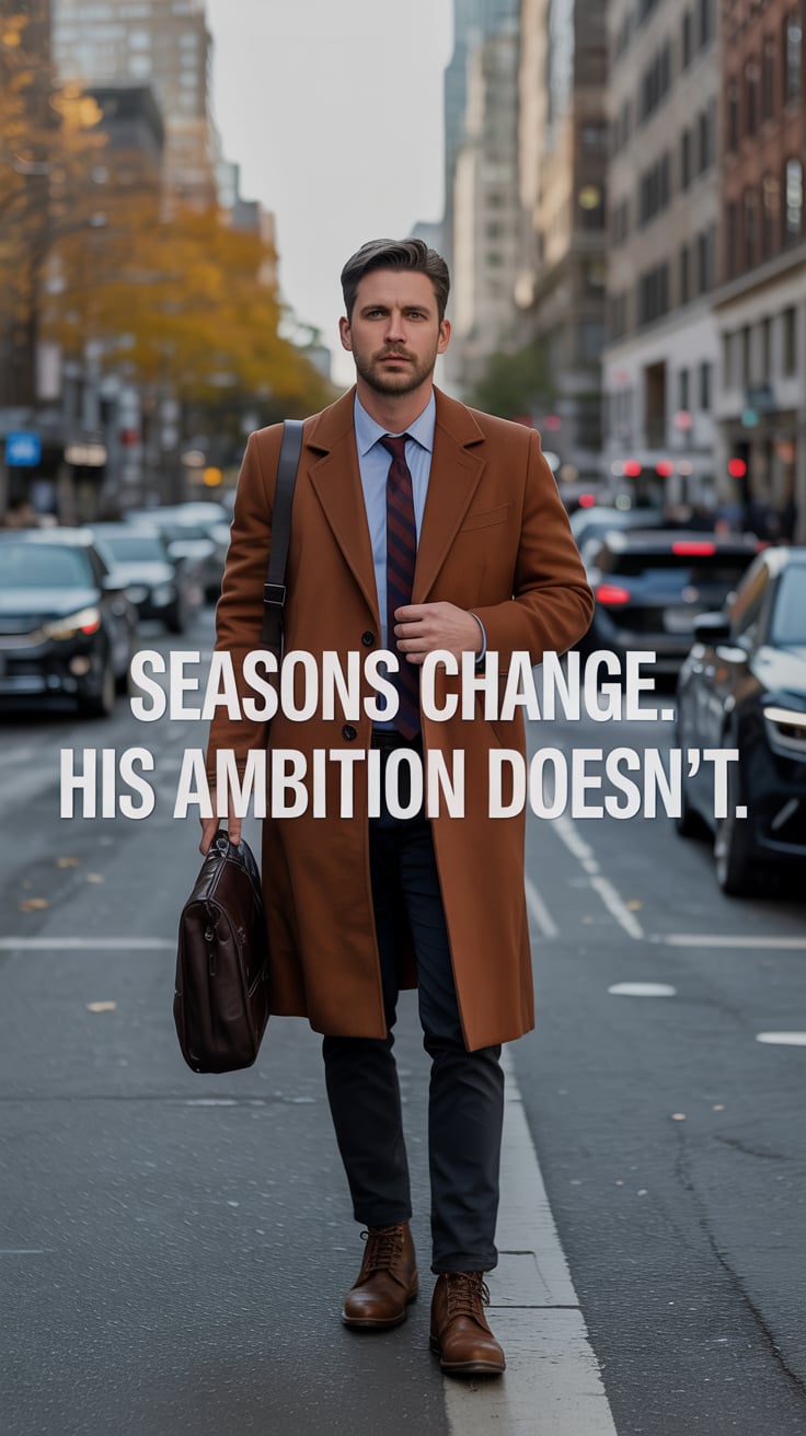 An editorial portrait of a (skin tone) male in a tailored camel coat and scarf, walking through a tr...
