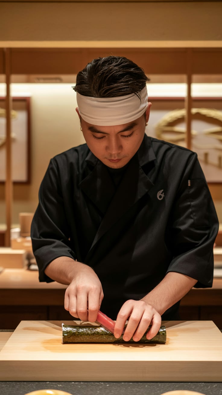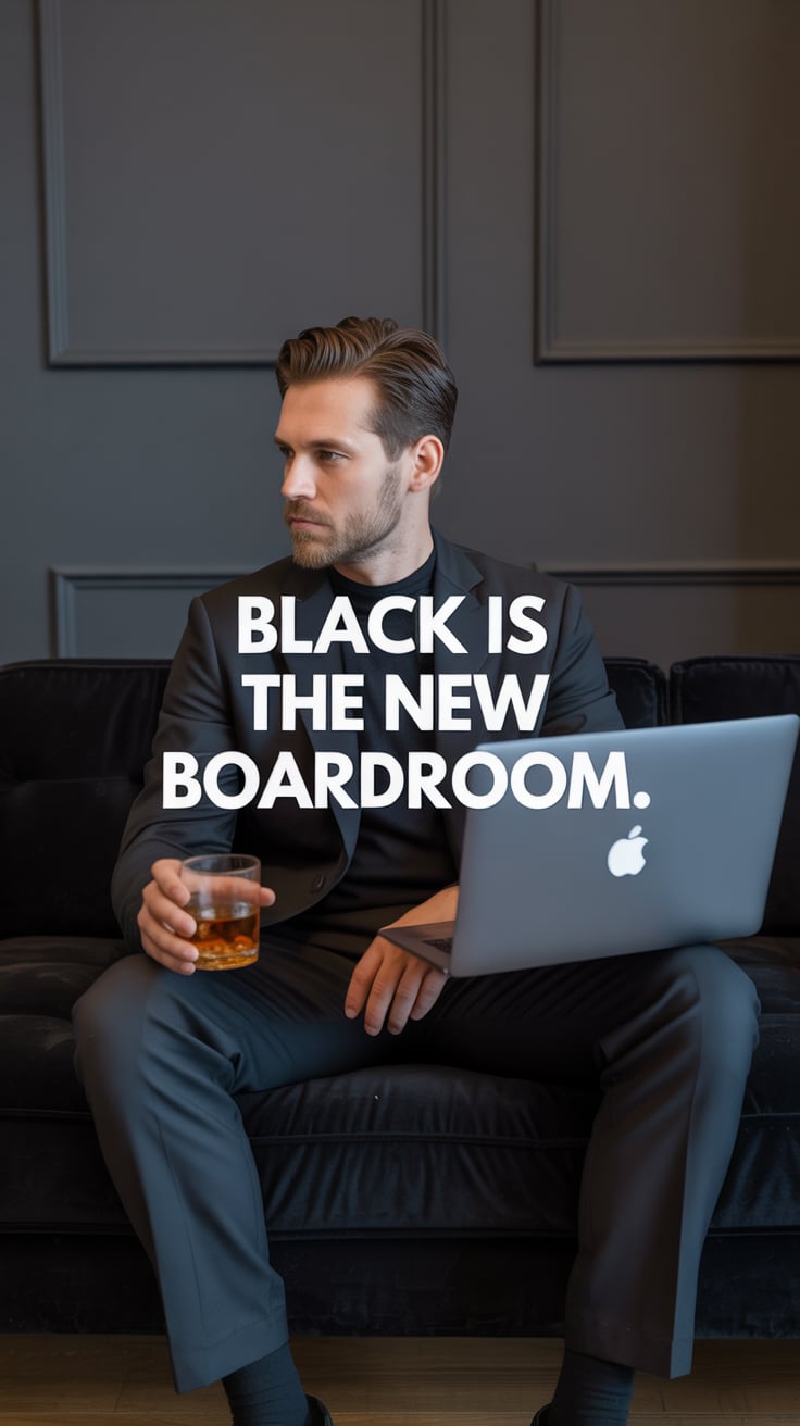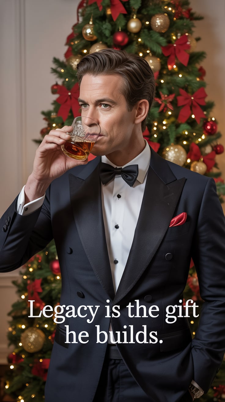 An editorial portrait of a (skin tone) male in a tailored black tuxedo with a red pocket square, sip...