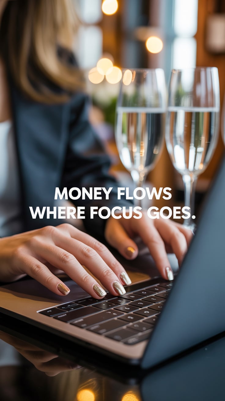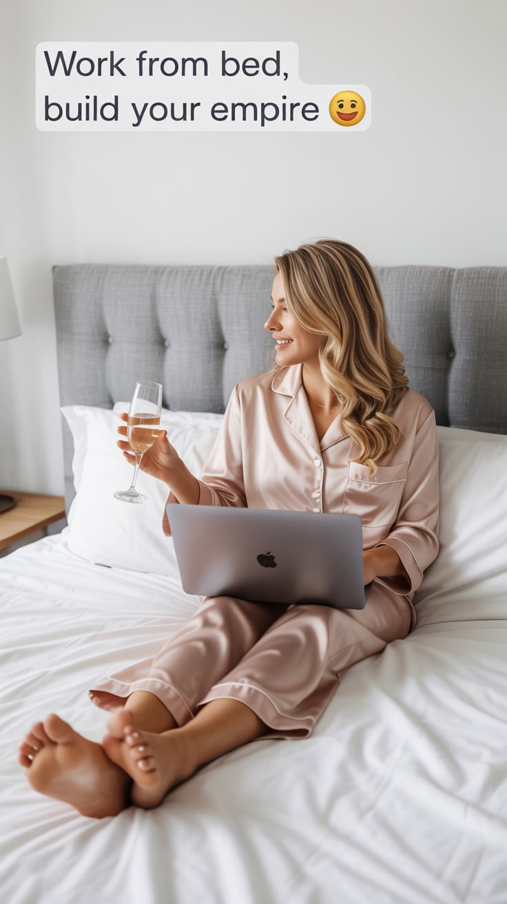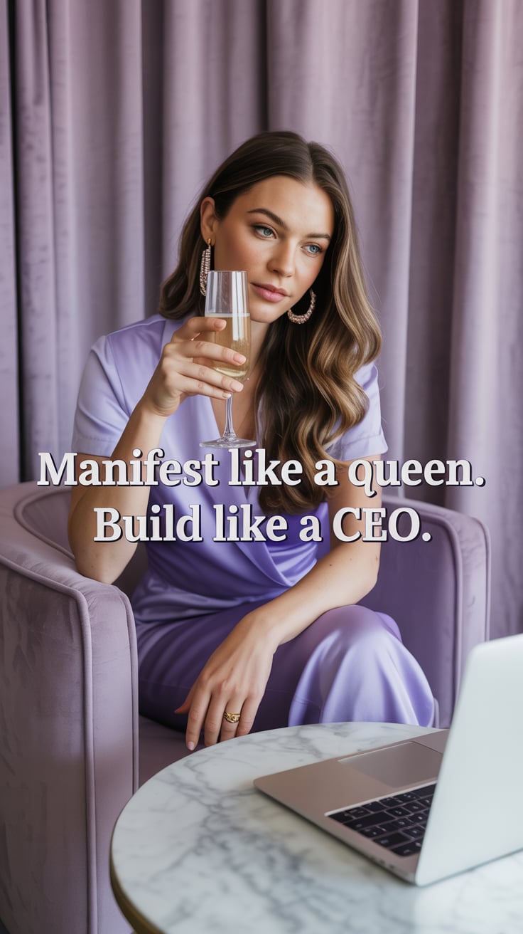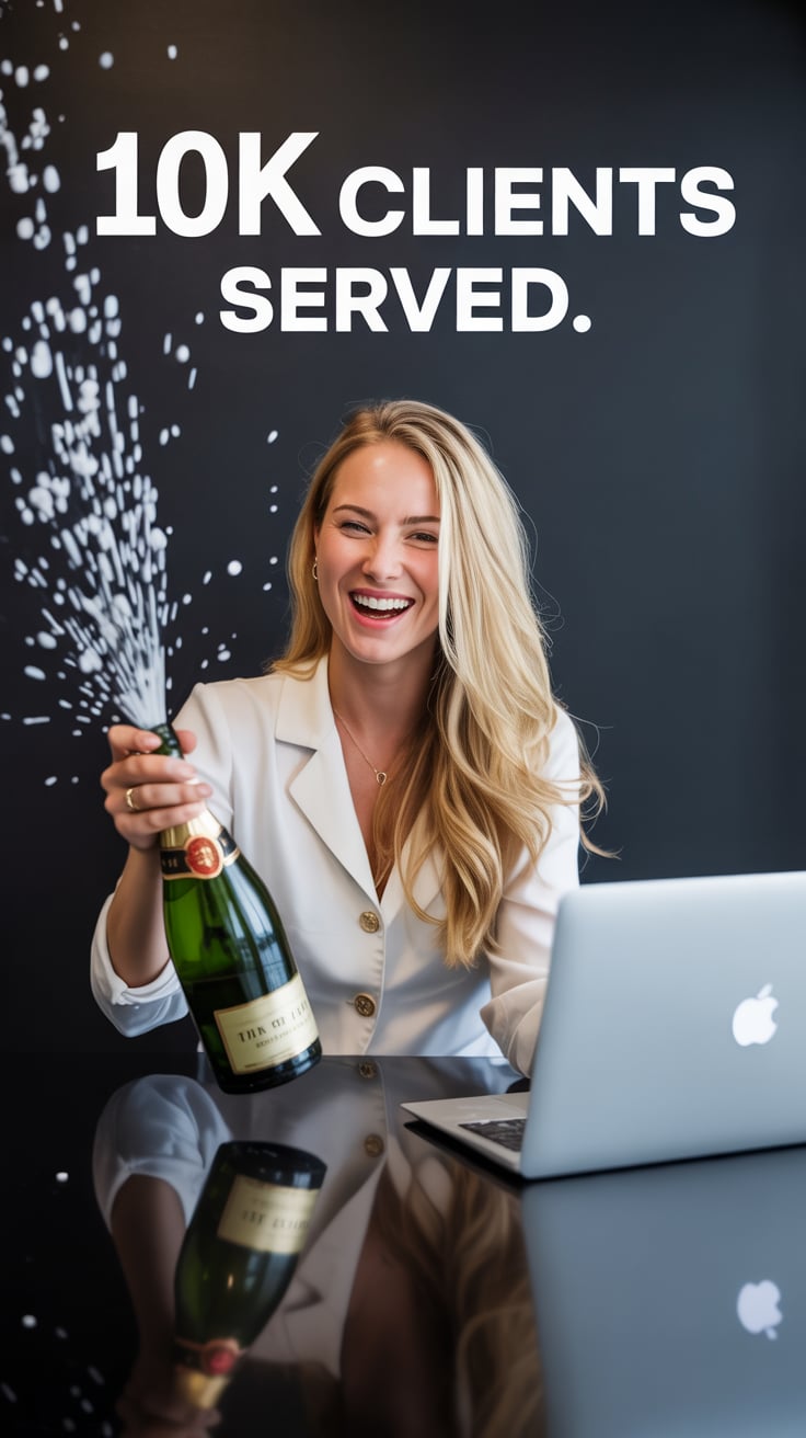 An editorial portrait of a (skin tone) female popping champagne with a glowing laptop beside her. Ov...