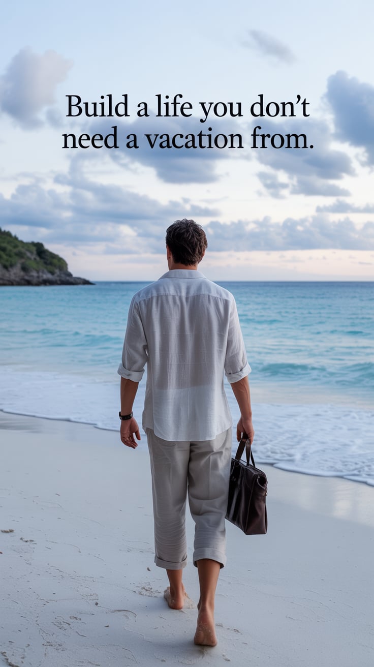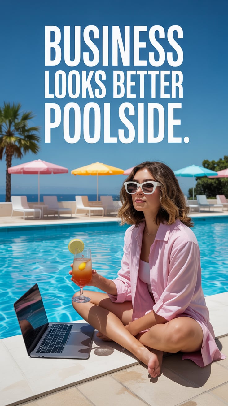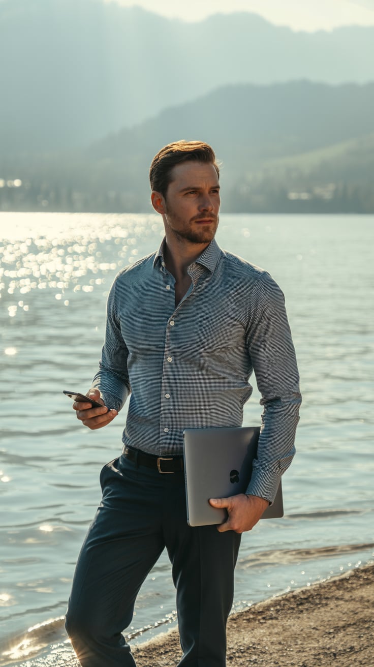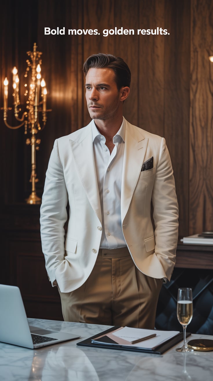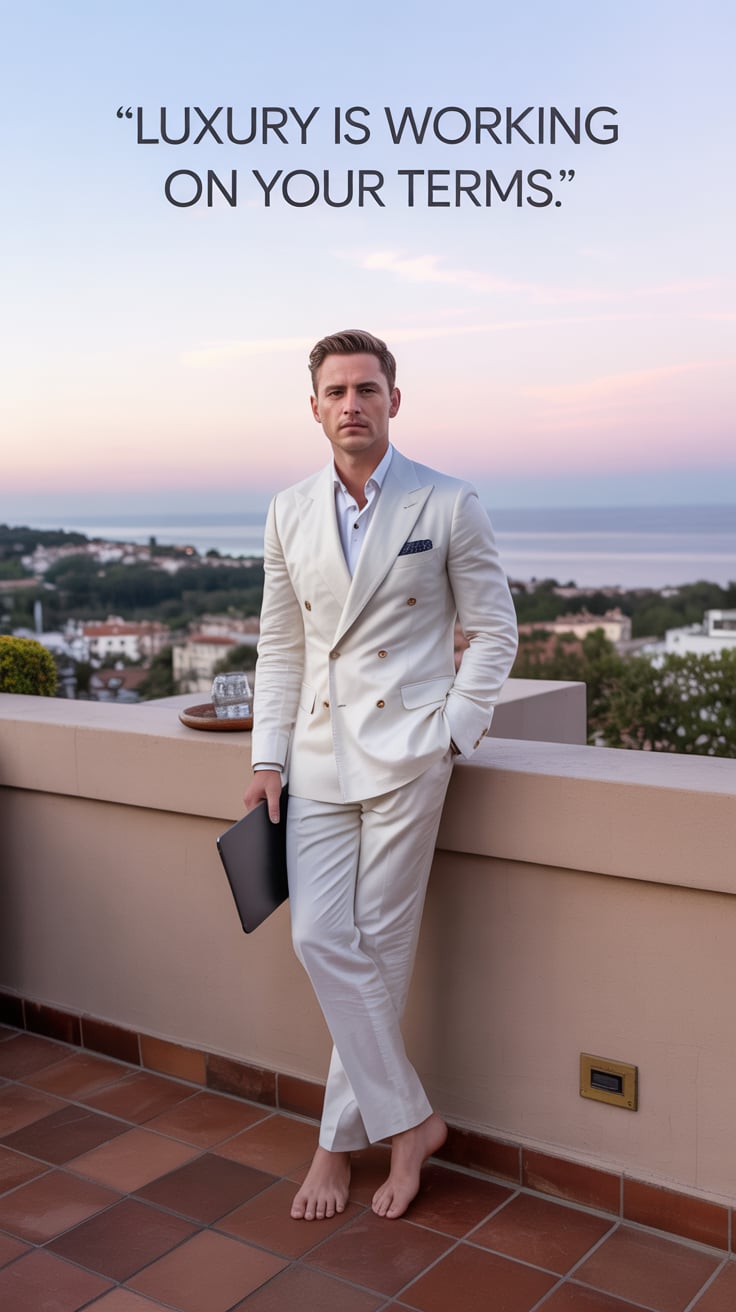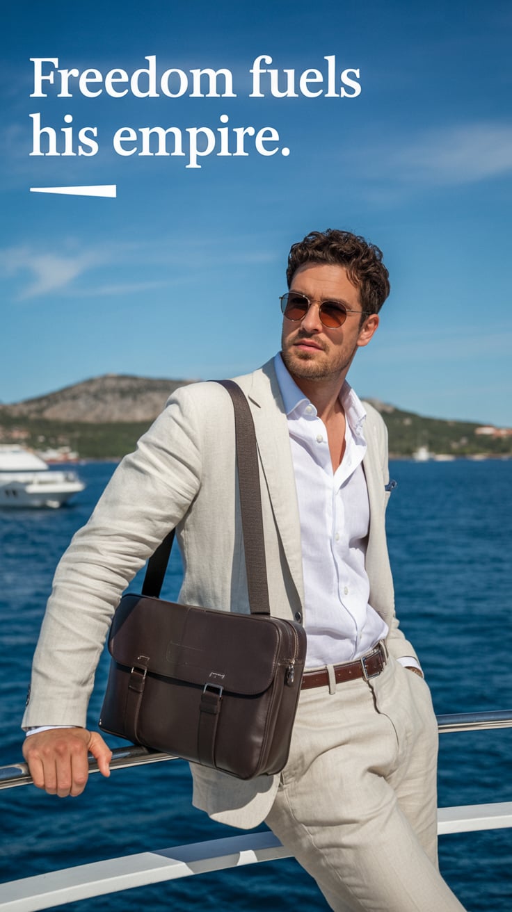 A luxury lifestyle photo of a (skin tone) male in a linen suit leaning on a yacht railing, laptop ba...