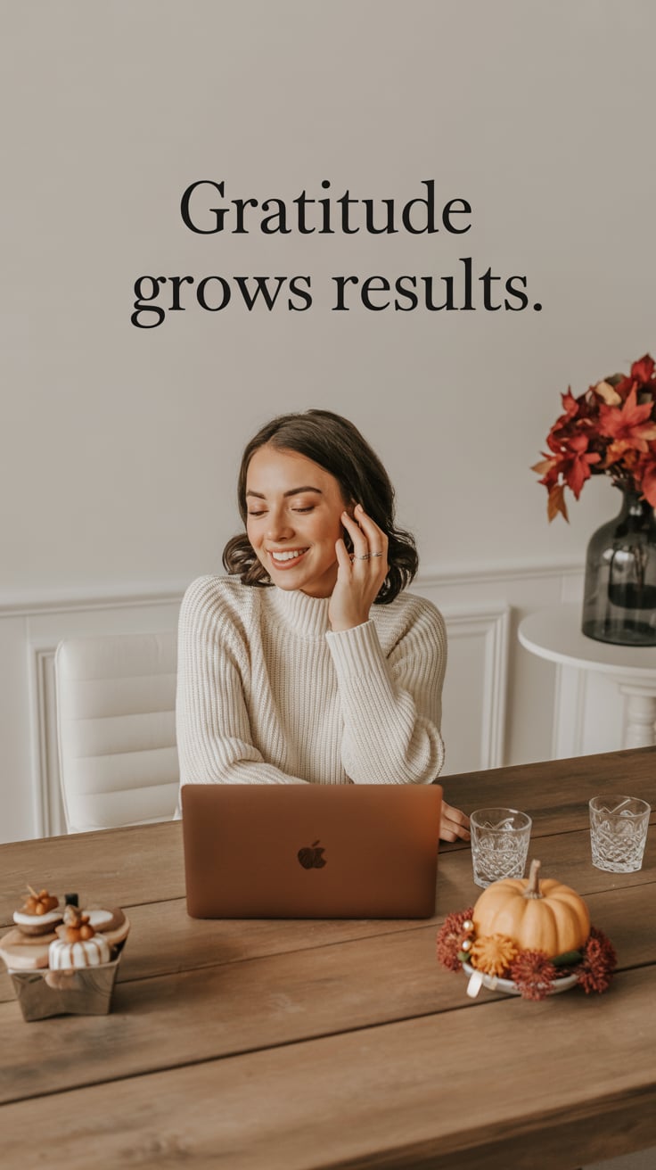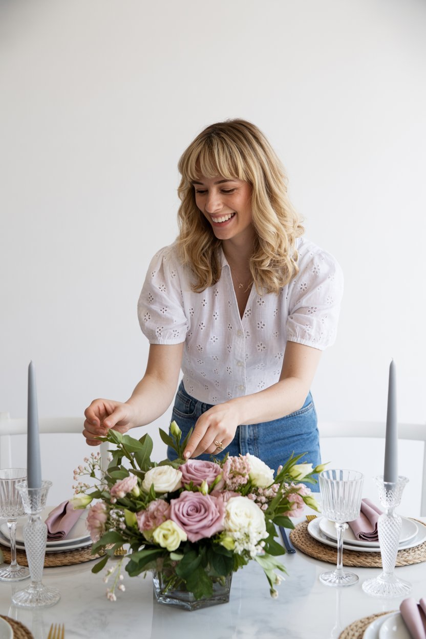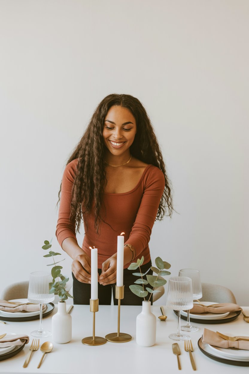 Thanksgiving theme: Lifestyle editorial of a (skin tone) woman in a chic cream sweater at a rustic w...