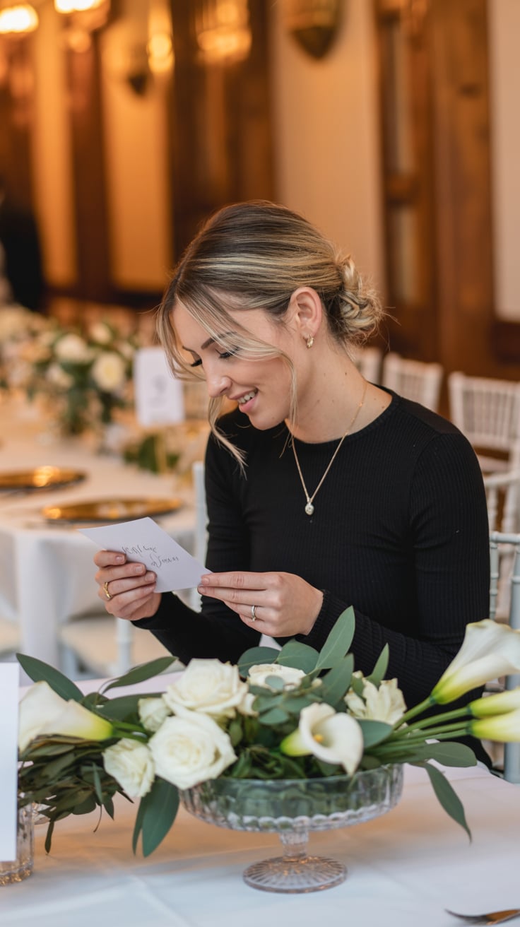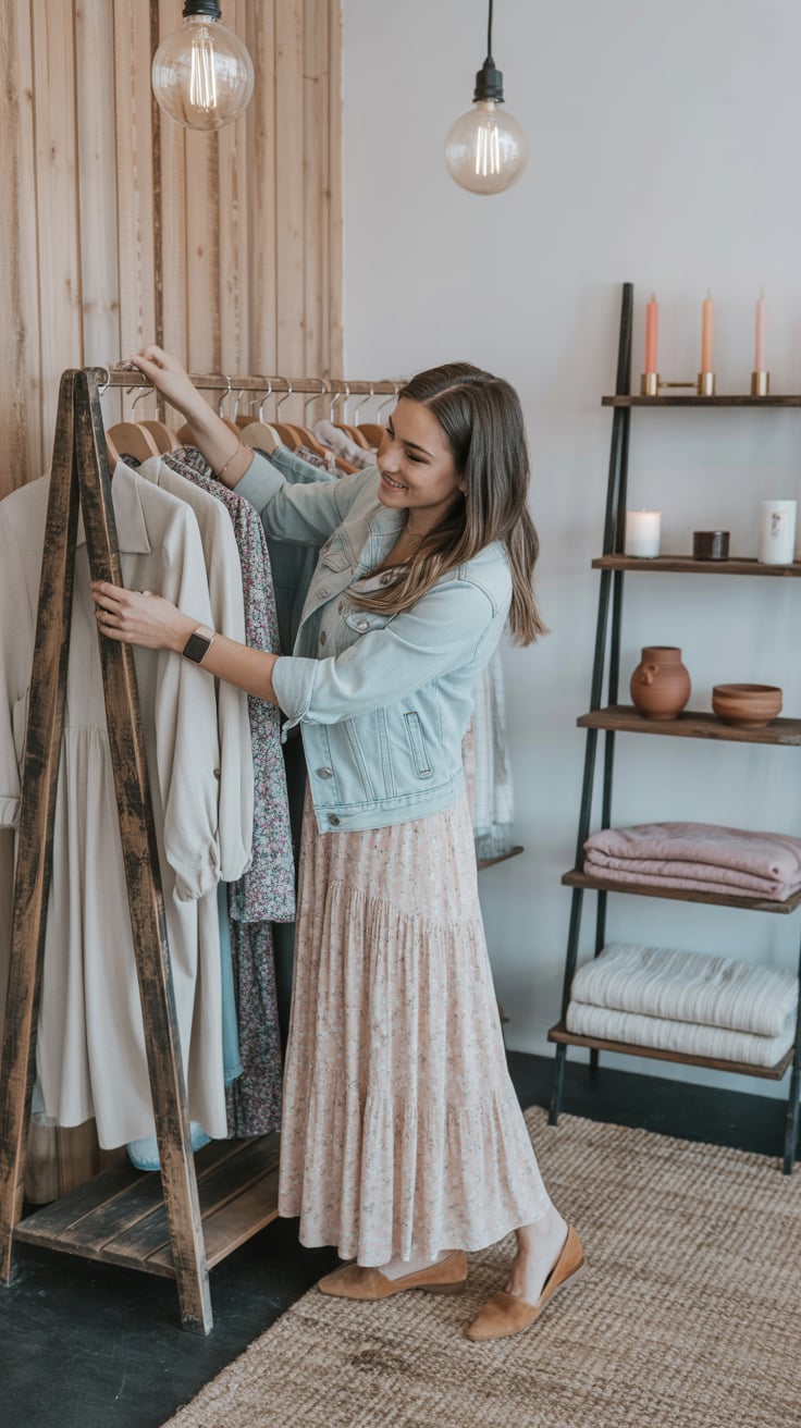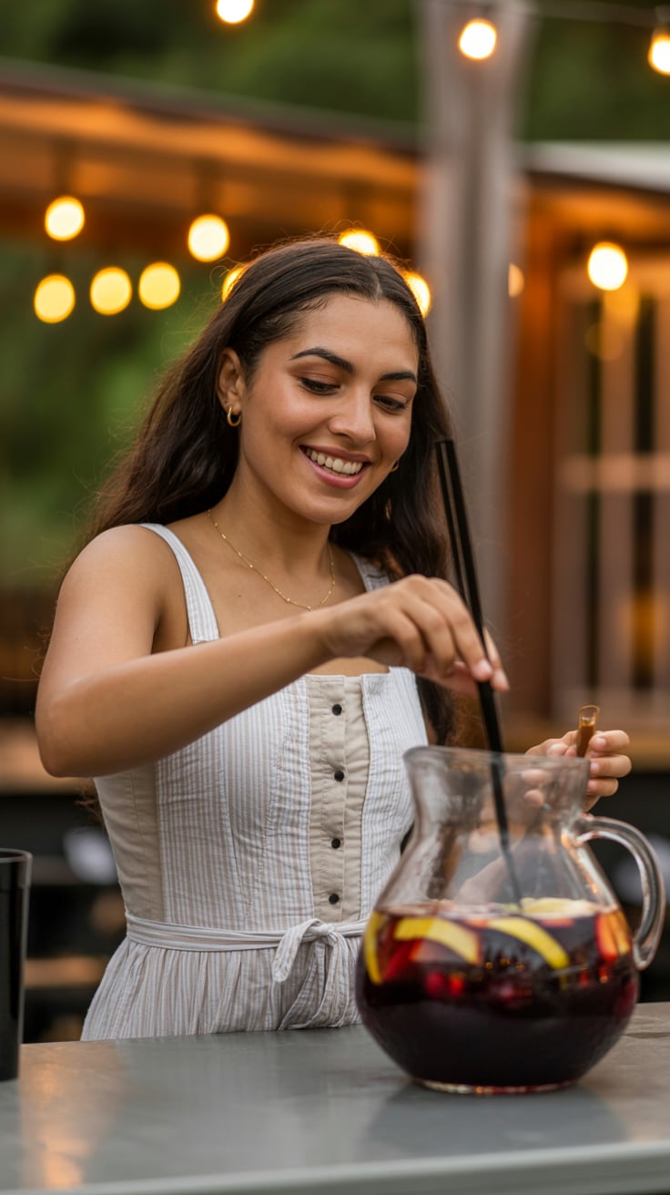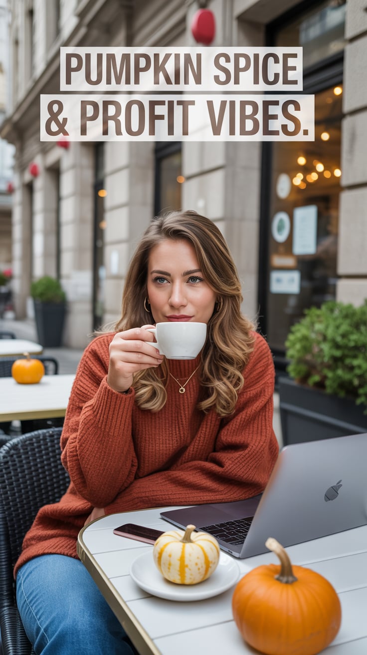 Thanksgiving theme: Lifestyle editorial of a (skin tone) woman in a chic cream sweater at a rustic w...