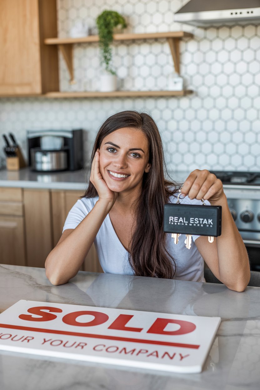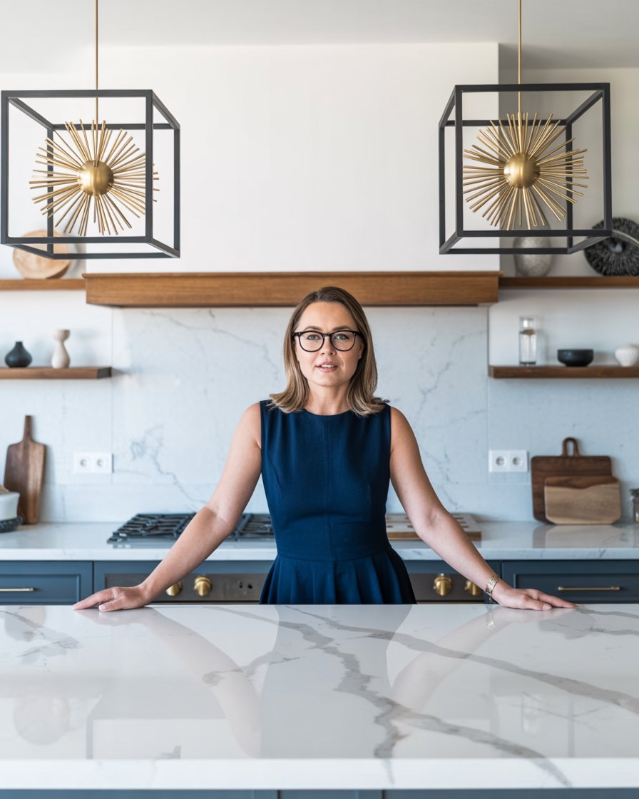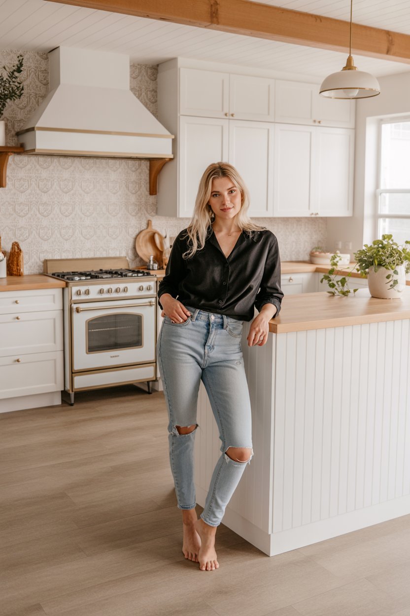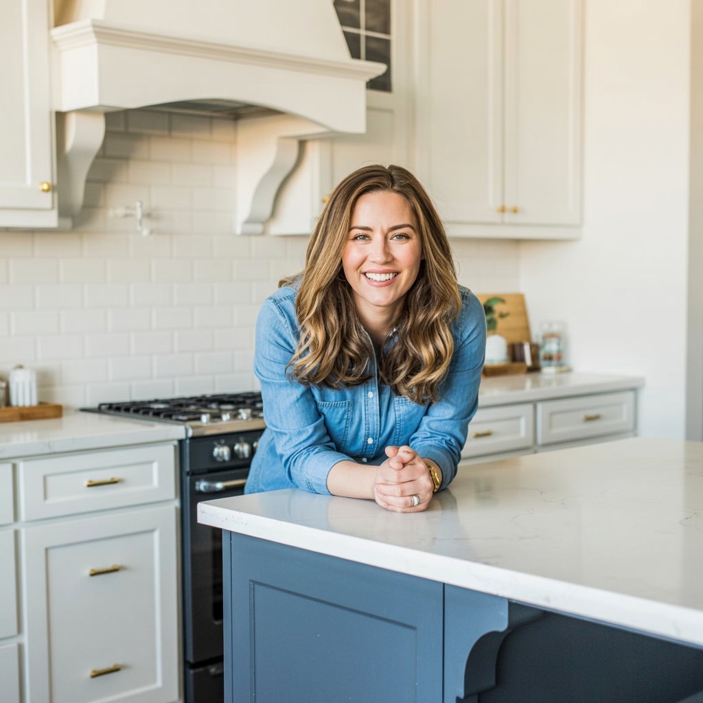 Modern farmhouse kitchen interior. A (gender/subject) sits casually on a white quartz kitchen island...