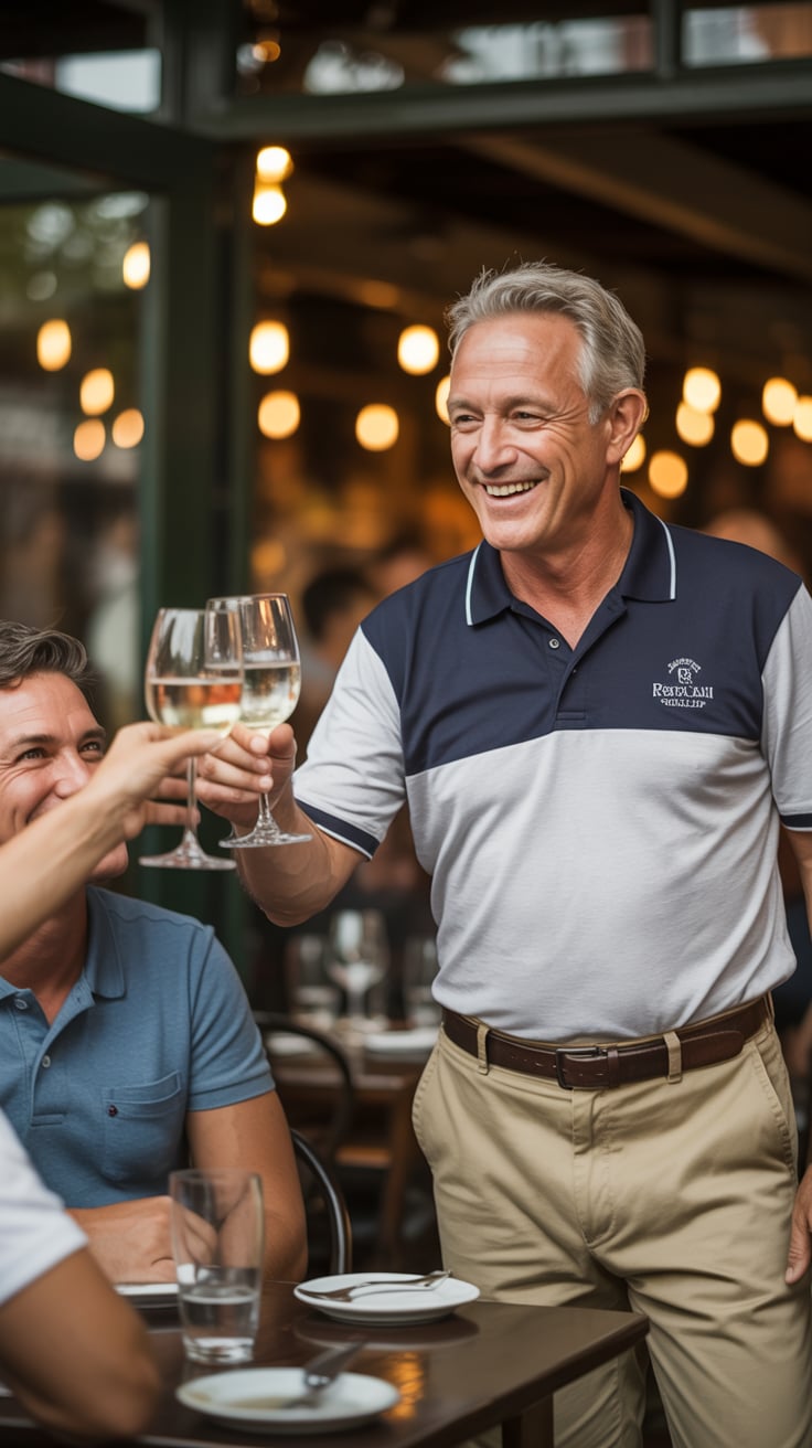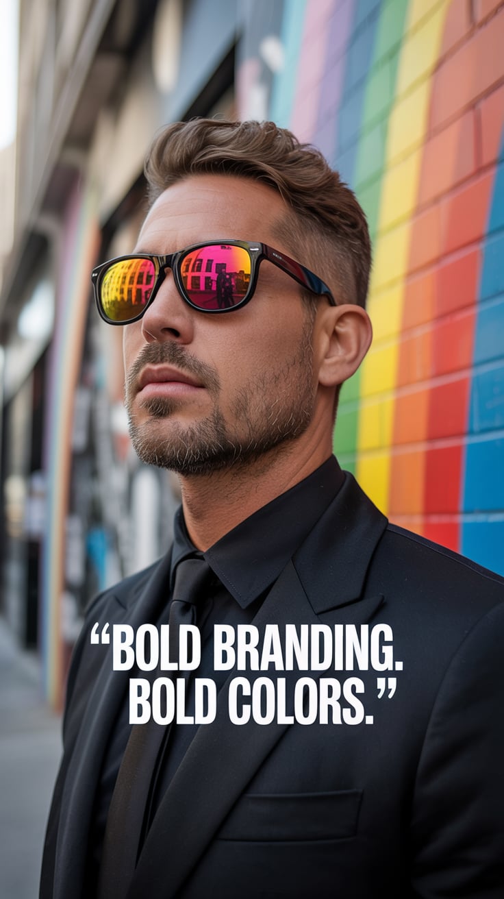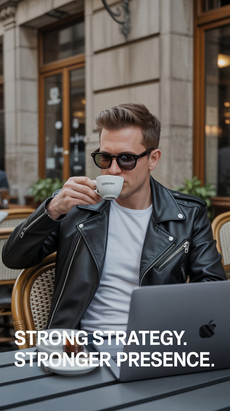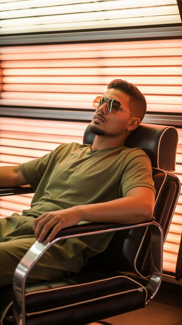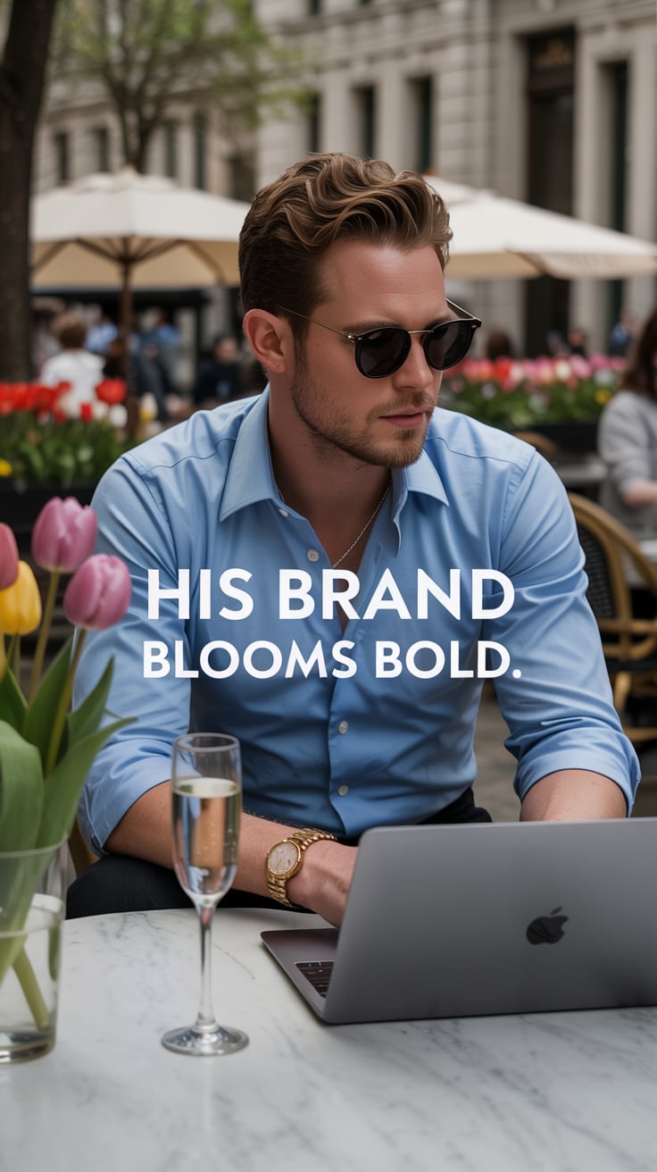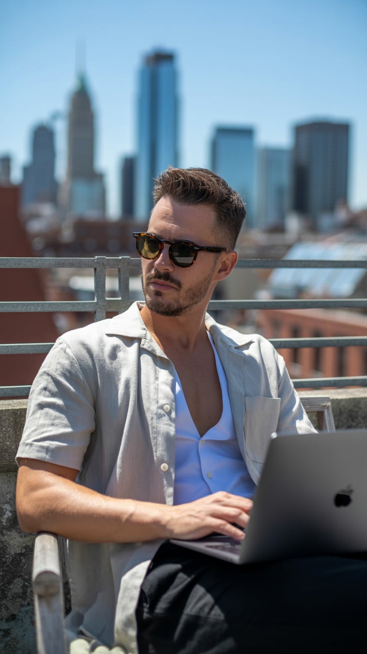High-fashion shot of a (skin tone) man in rolled sleeves and sunglasses, seated outdoors at a café w...