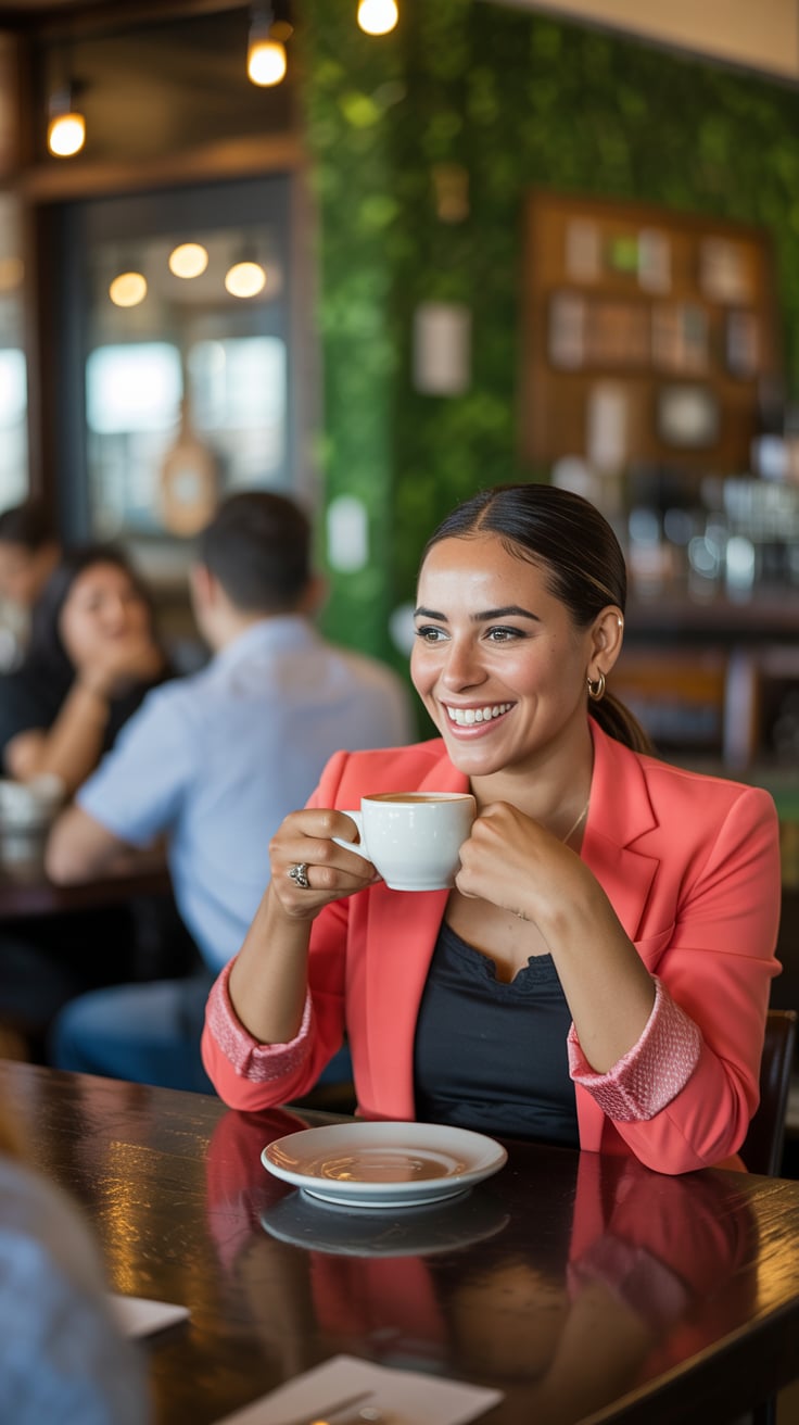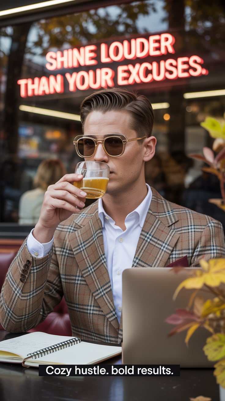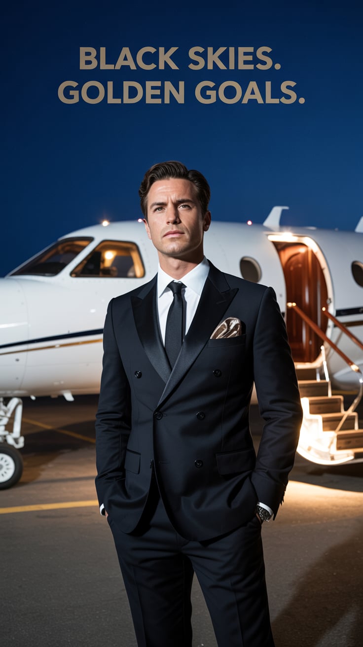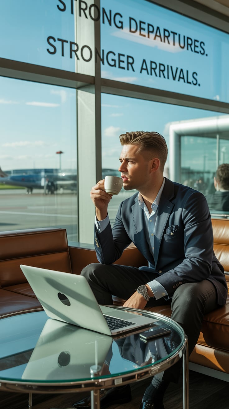 A dreamy airport lounge photo of a (skin tone) male in a tailored blazer, sipping espresso with a la...