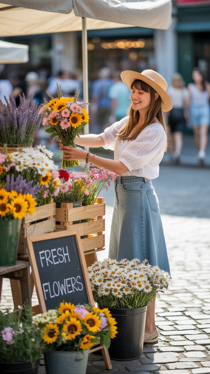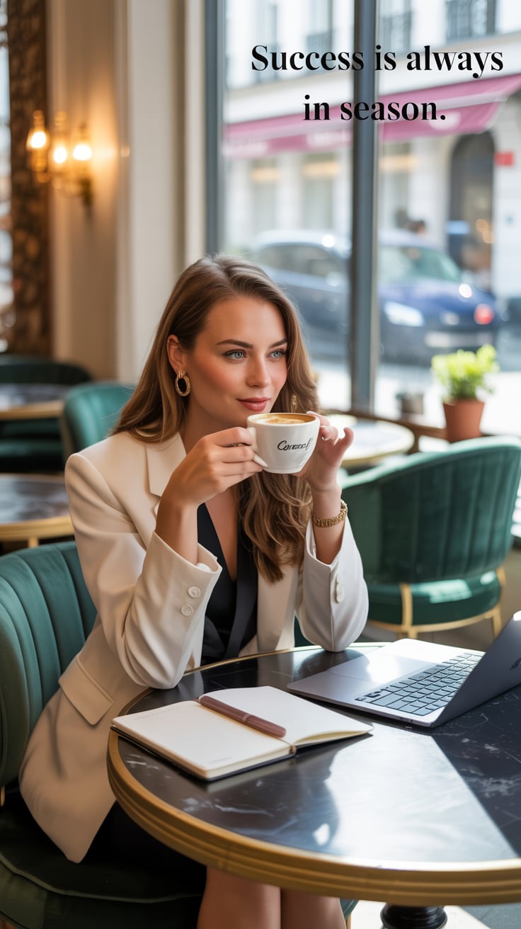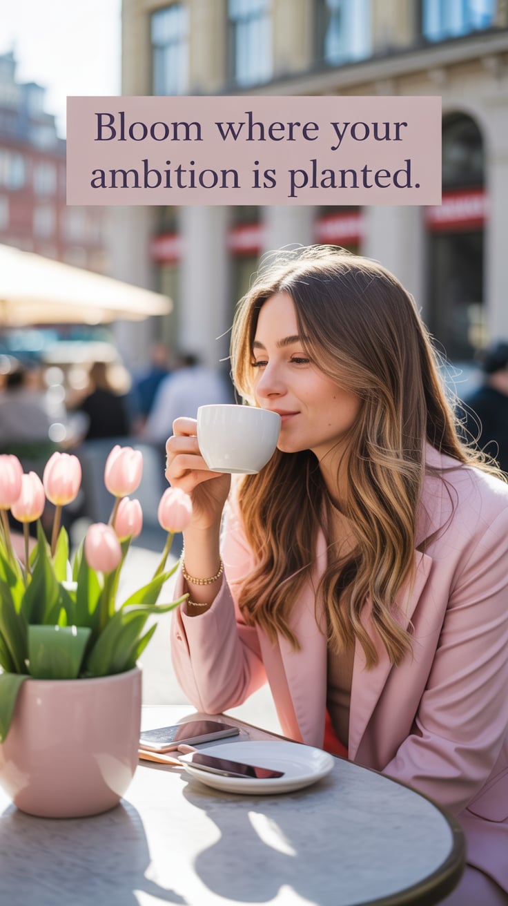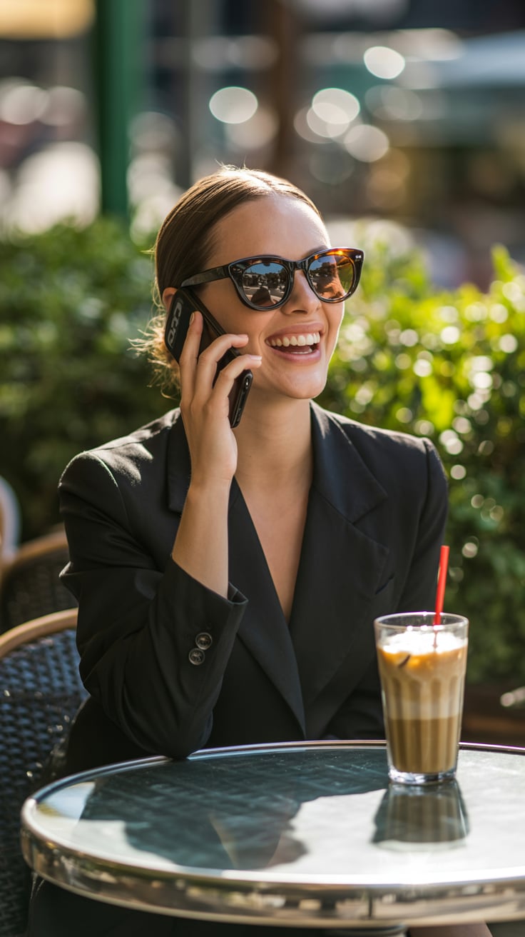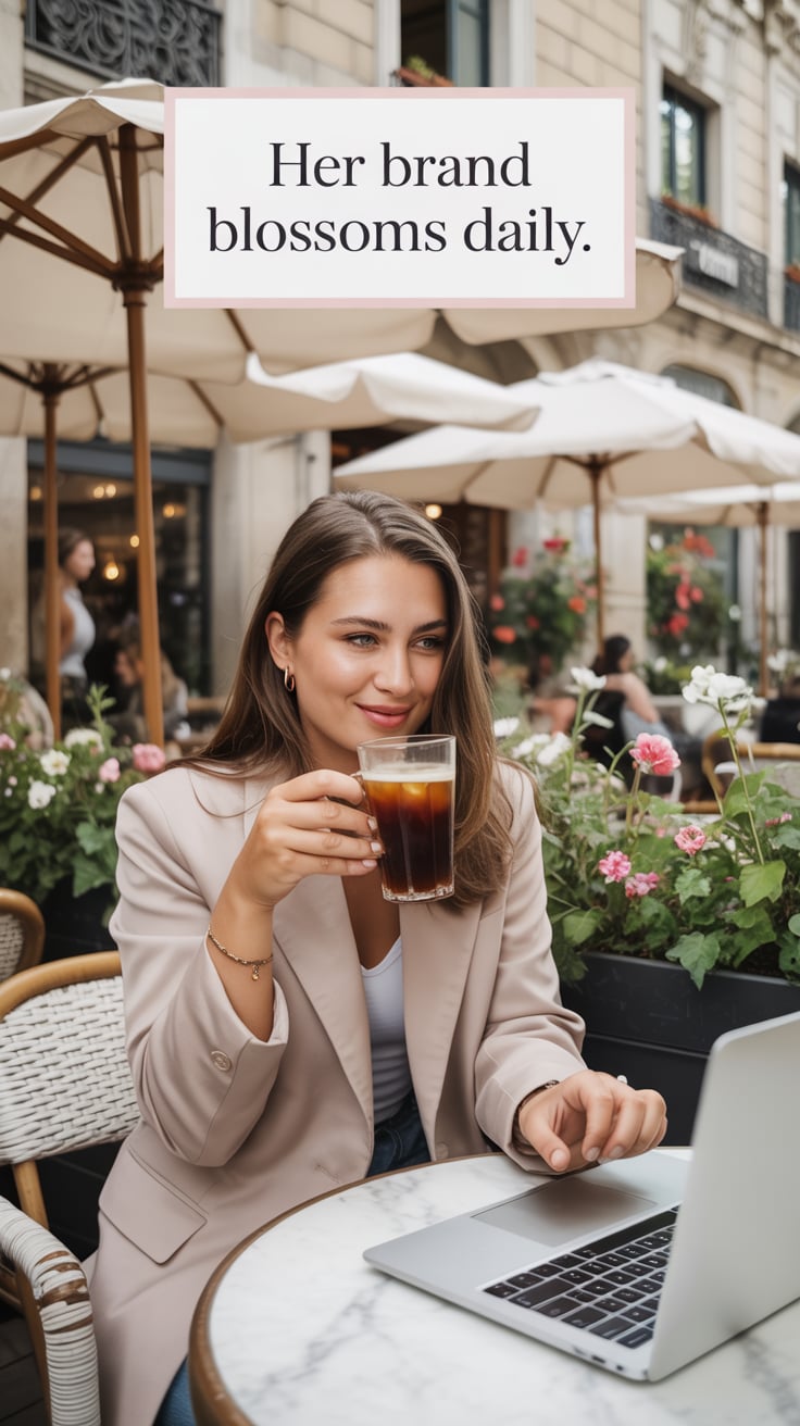 Luxury lifestyle image of a (skin tone) woman sipping iced coffee at a café terrace surrounded by fl...
