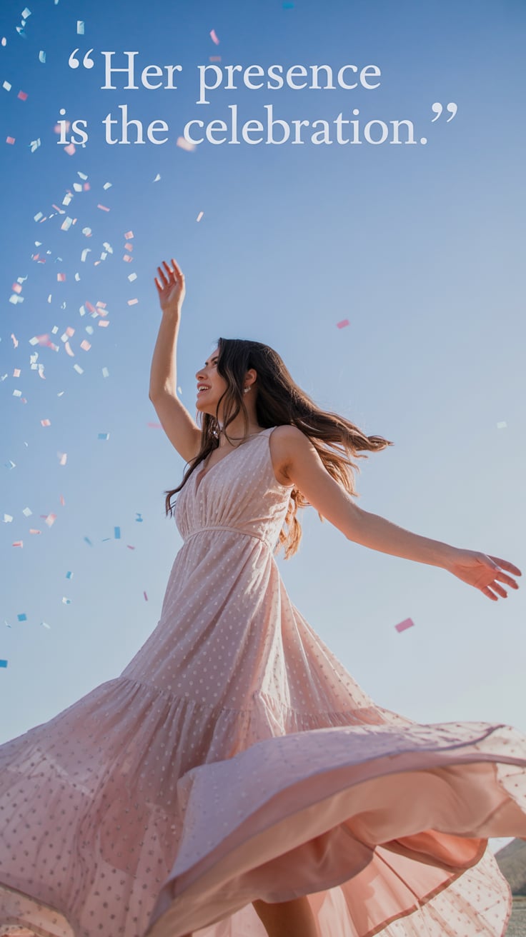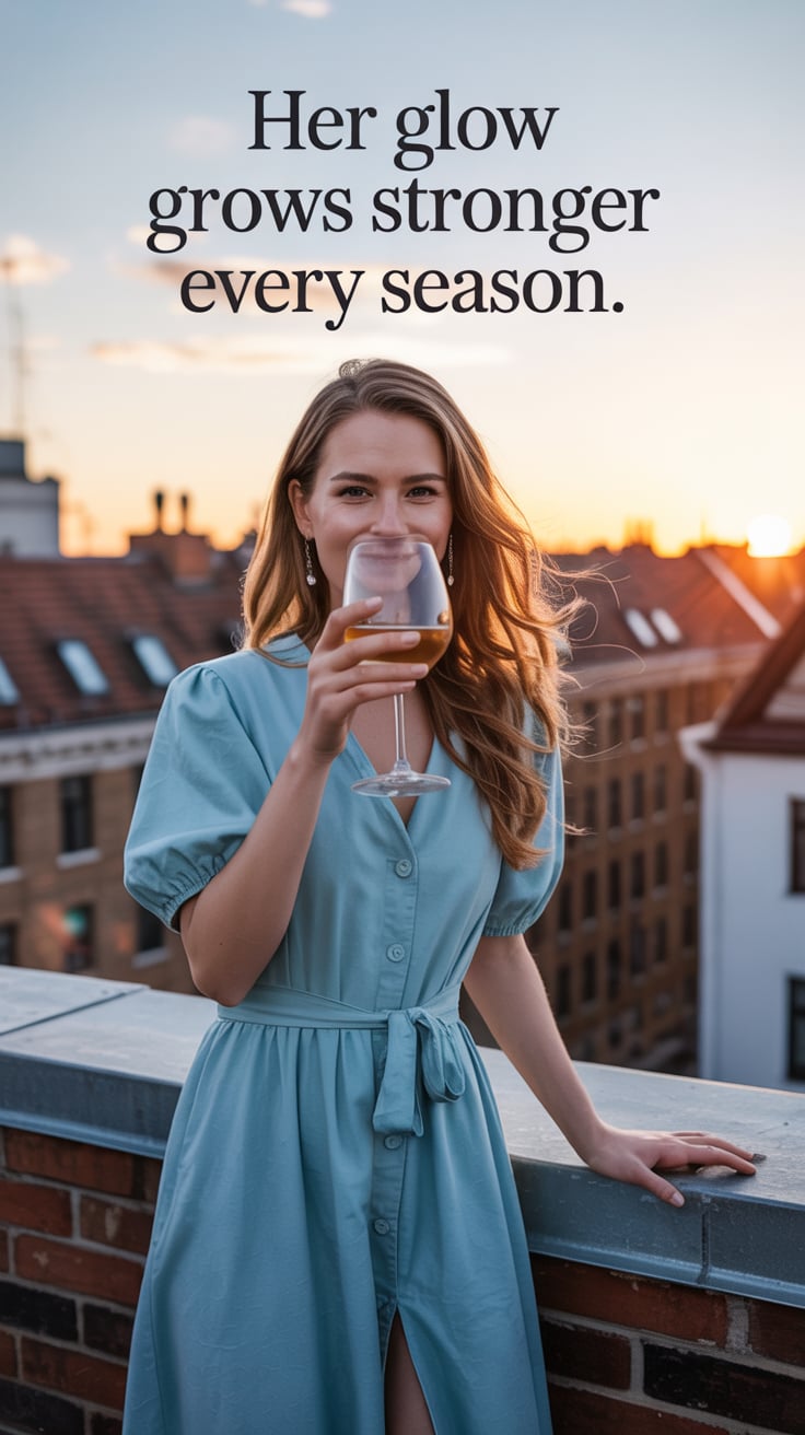 Cinematic rooftop photo of a (skin tone) woman in a pastel blue dress, sipping wine as golden spring...