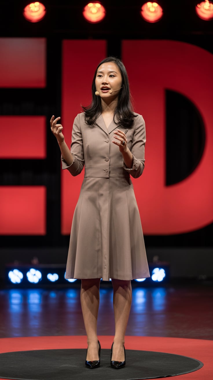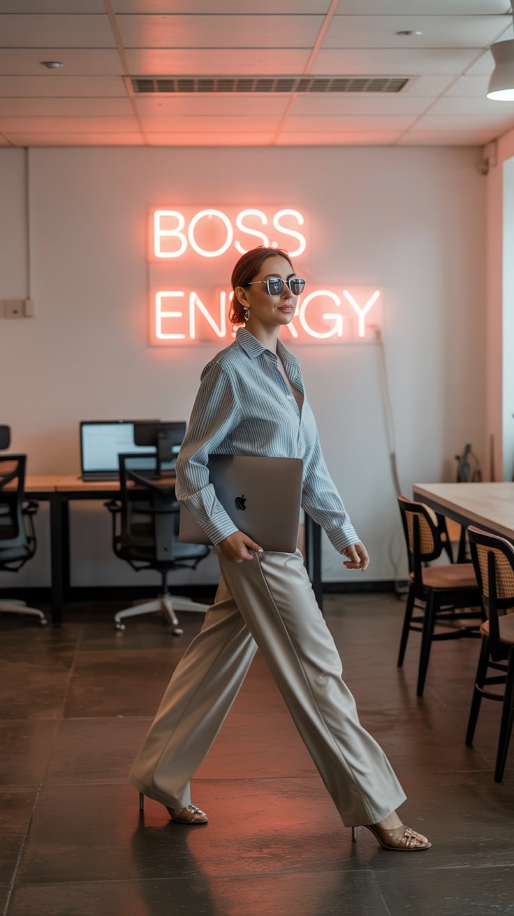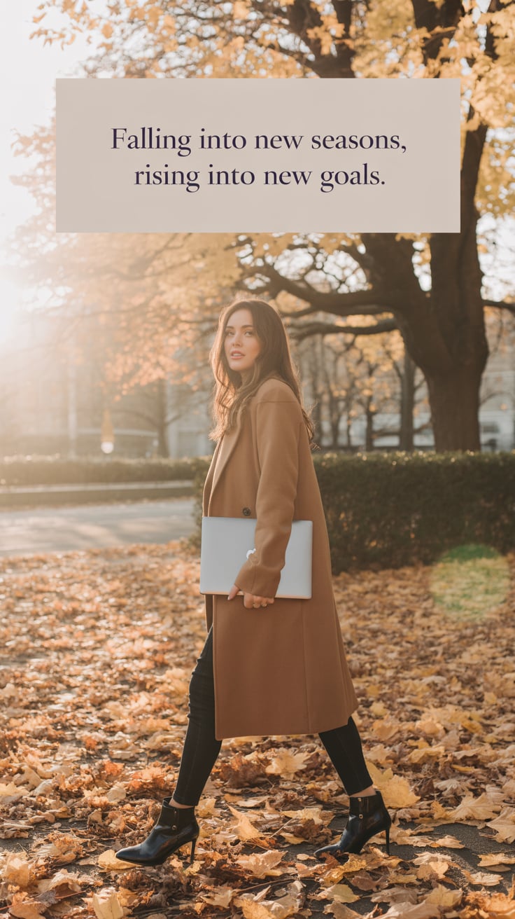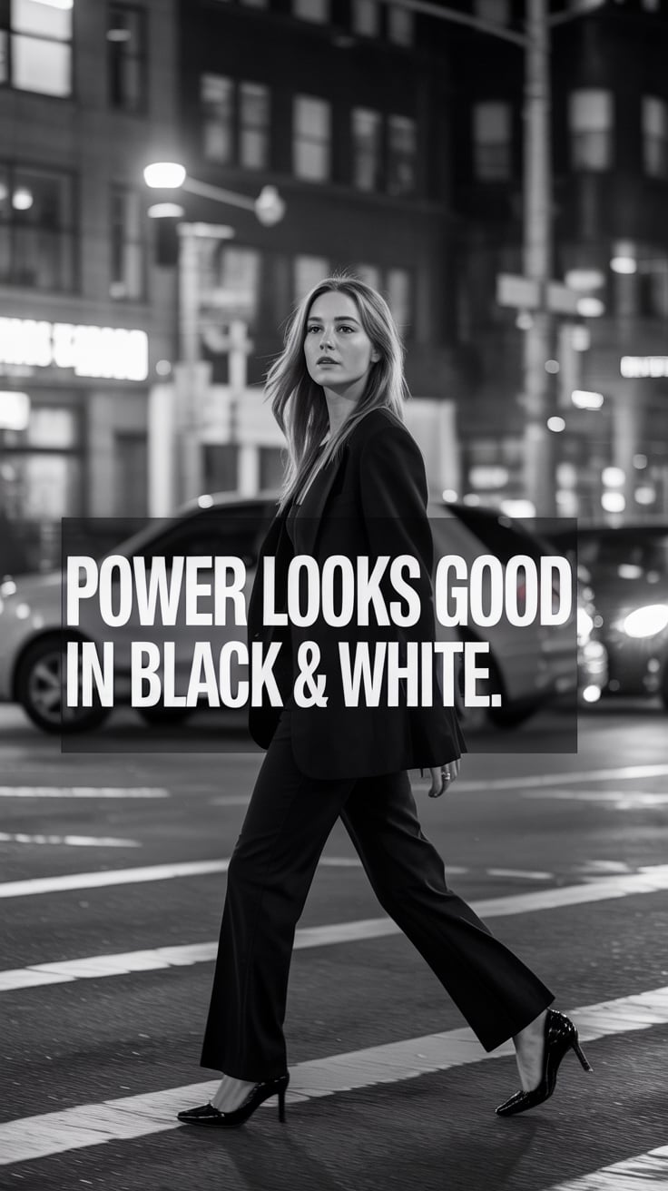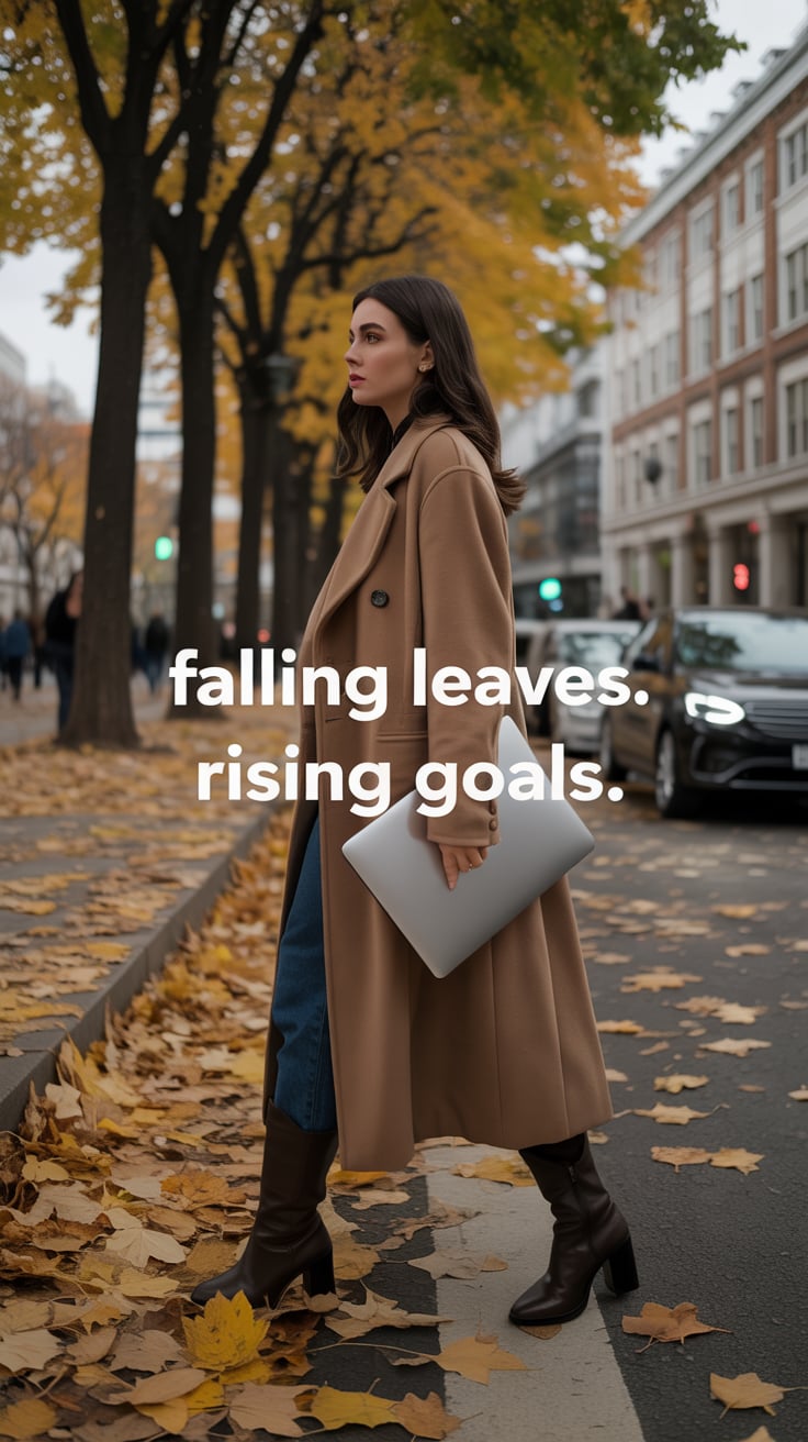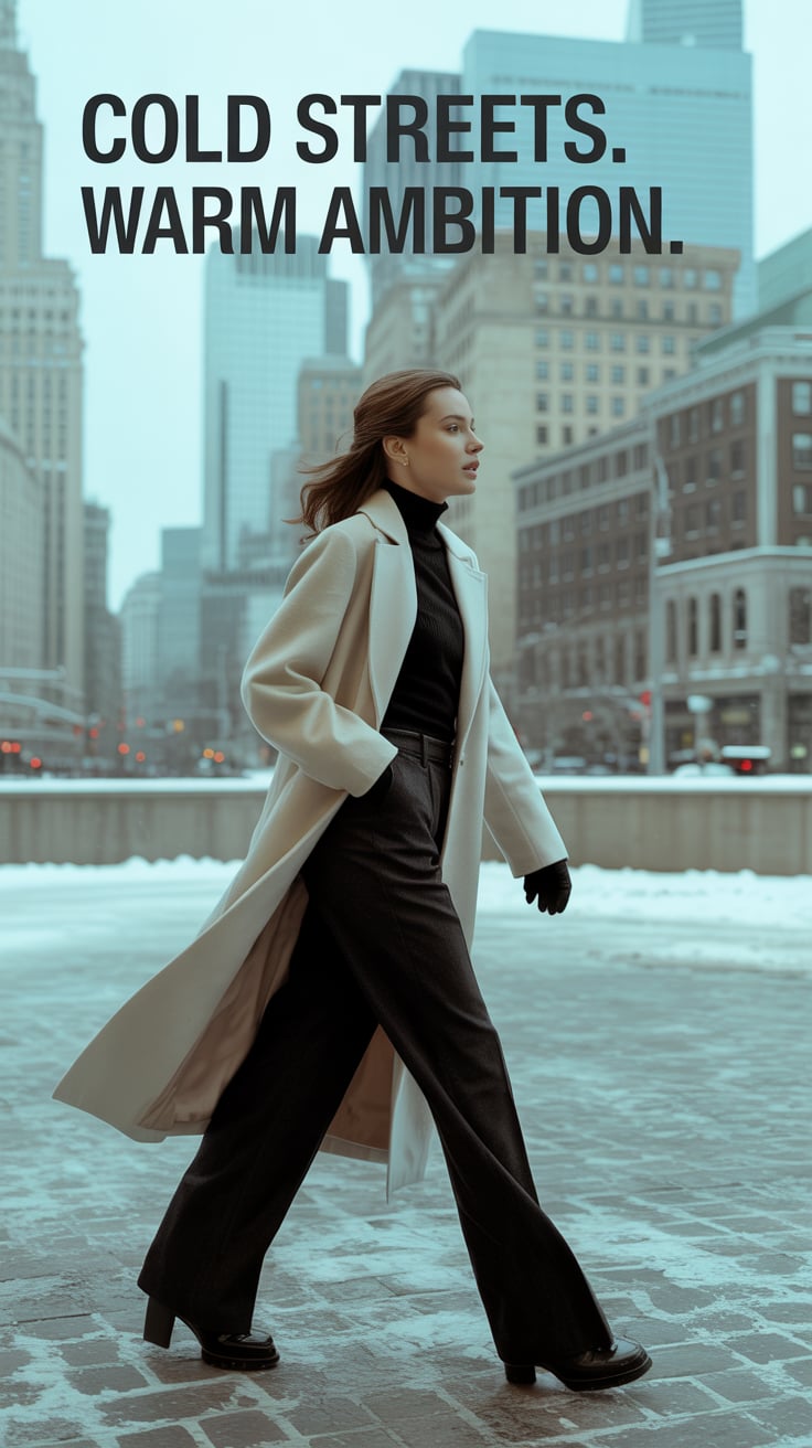 A cinematic photo of a (skin tone) female in black wool trousers and a cream coat, walking confident...