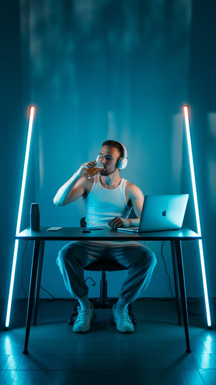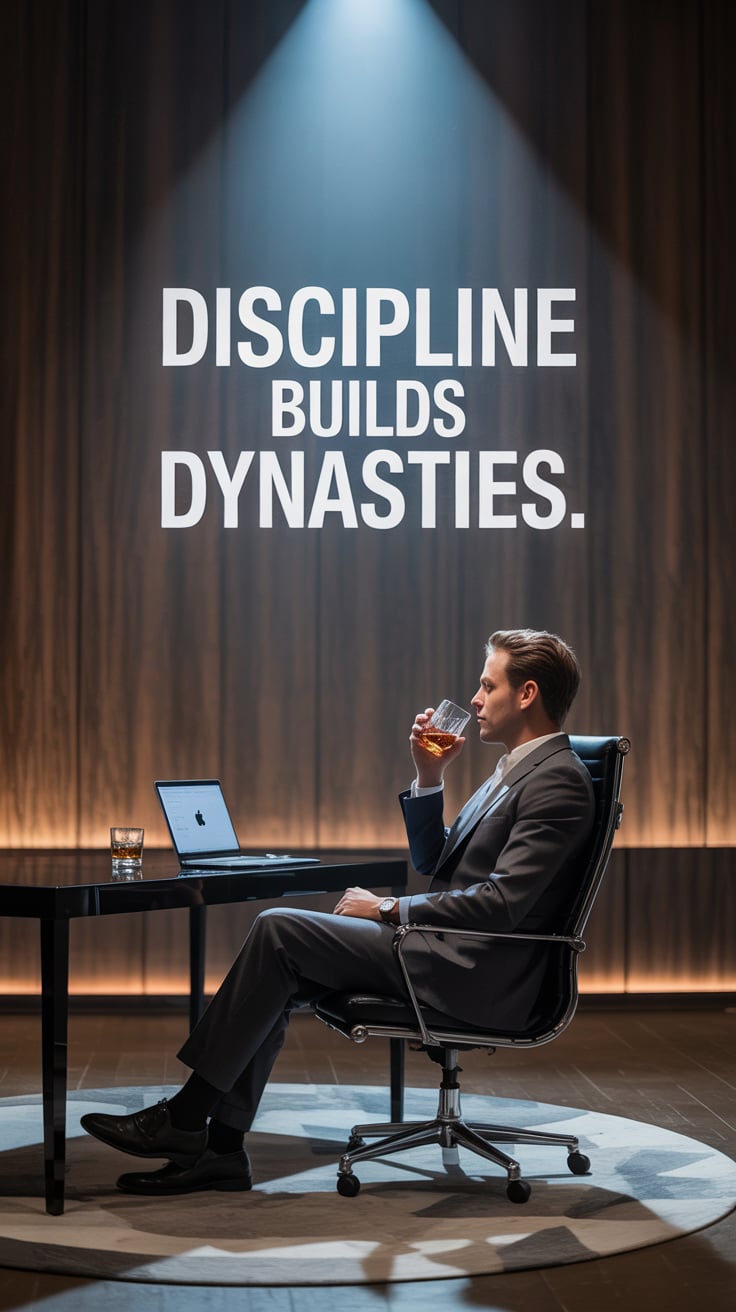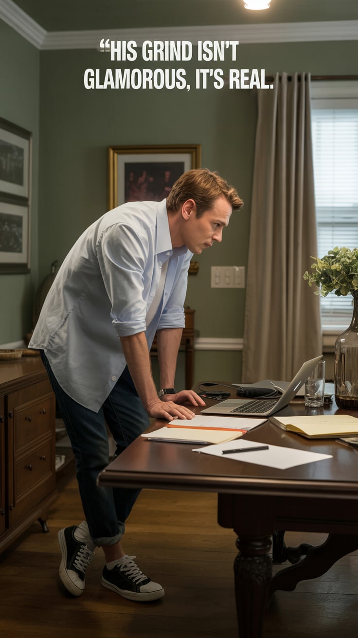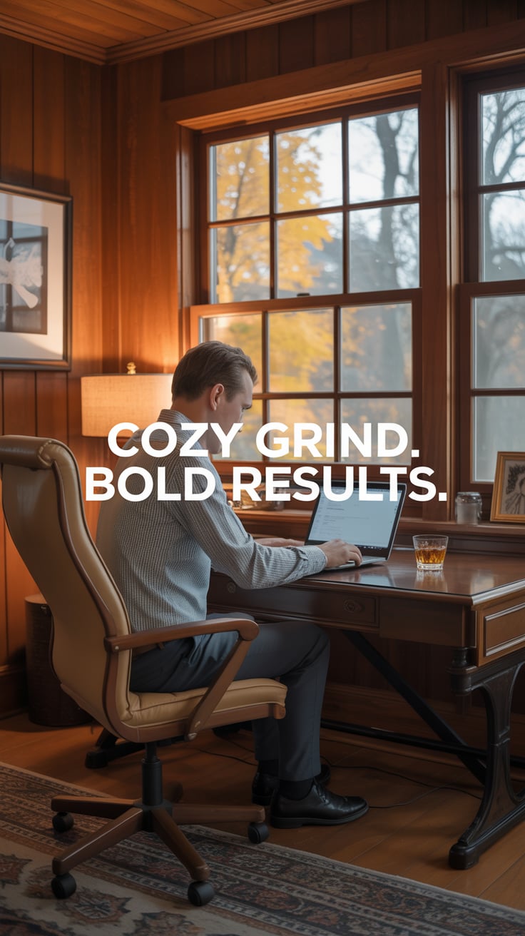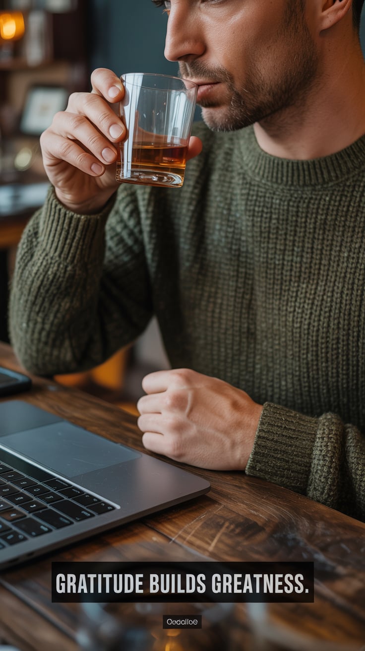 Editorial close-up of a (skin tone) male at a rustic wood desk, sipping whiskey, laptop open, amber ...
