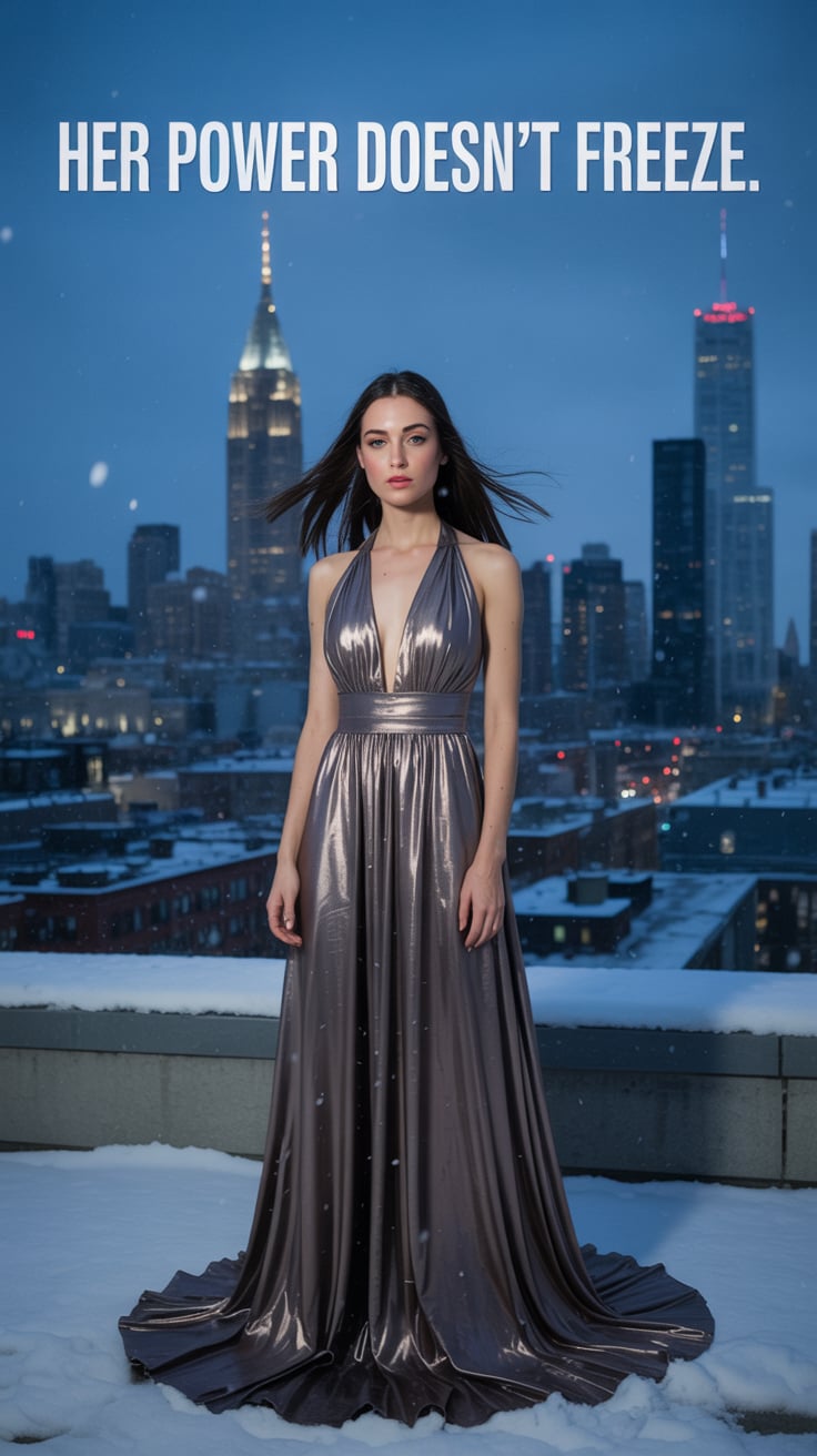 A high-fashion rooftop portrait of a (skin tone) female in a floor-length metallic gown, snow fallin...
