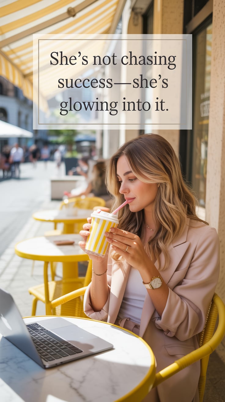 Dreamy lifestyle photo of a (skin tone) woman in a soft yellow sundress, seated at a bistro table wi...
