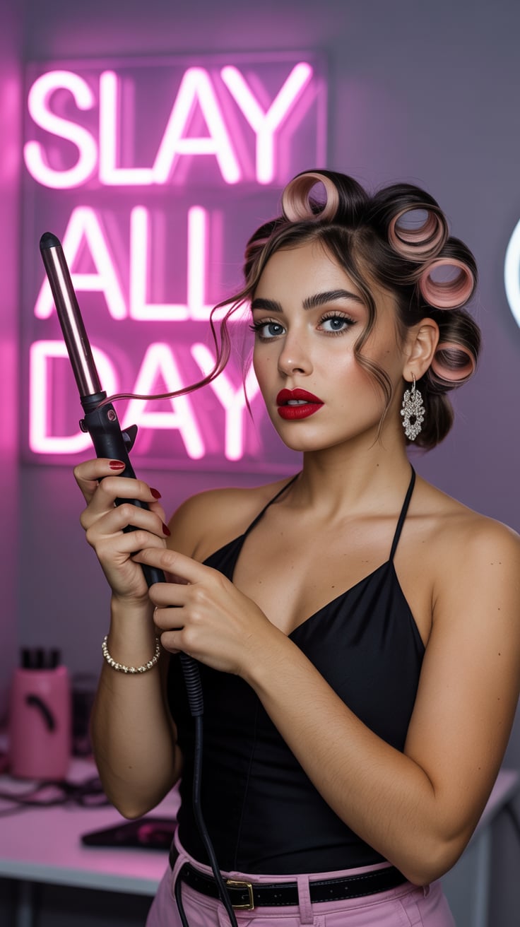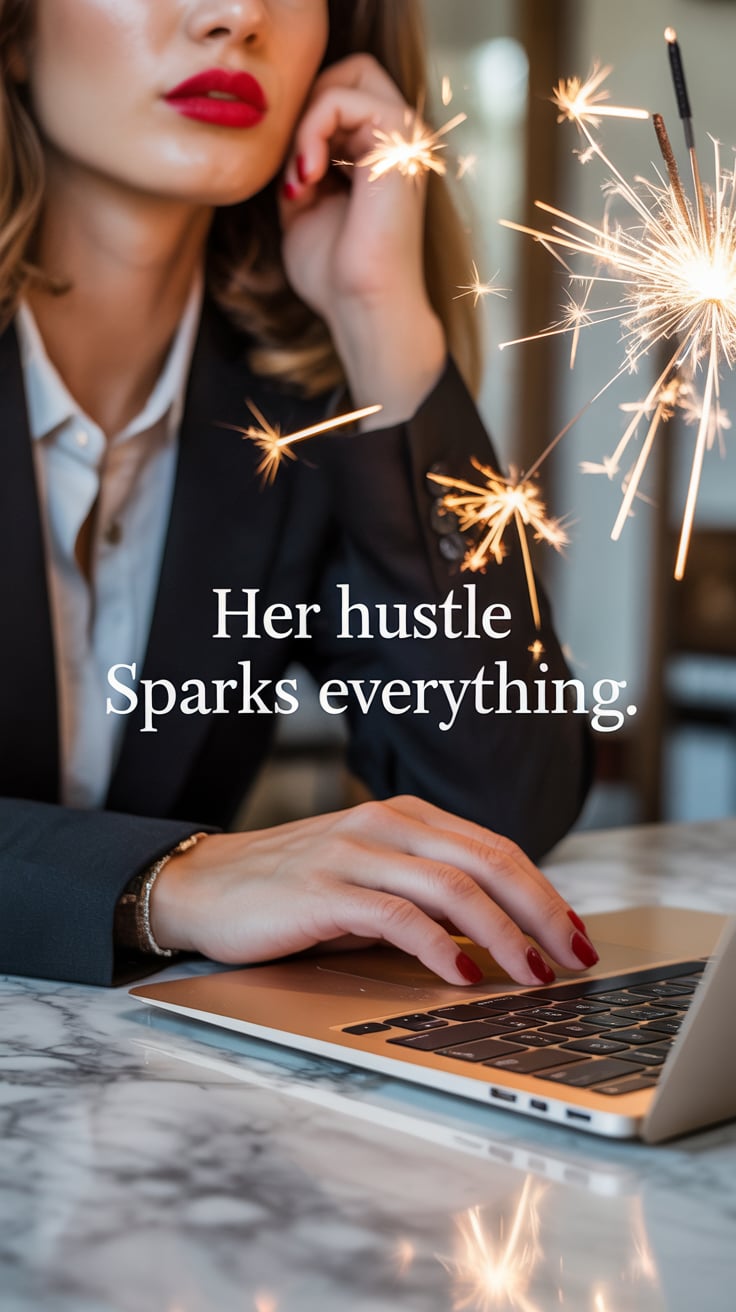 Fashion-inspired close-up of a (skin tone) female with bold red lipstick, laptop on a marble counter...