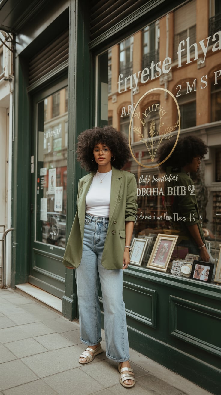 A fashion portrait of a (skin color) (gender/subject) standing on a (city sidewalk / cobblestone str...