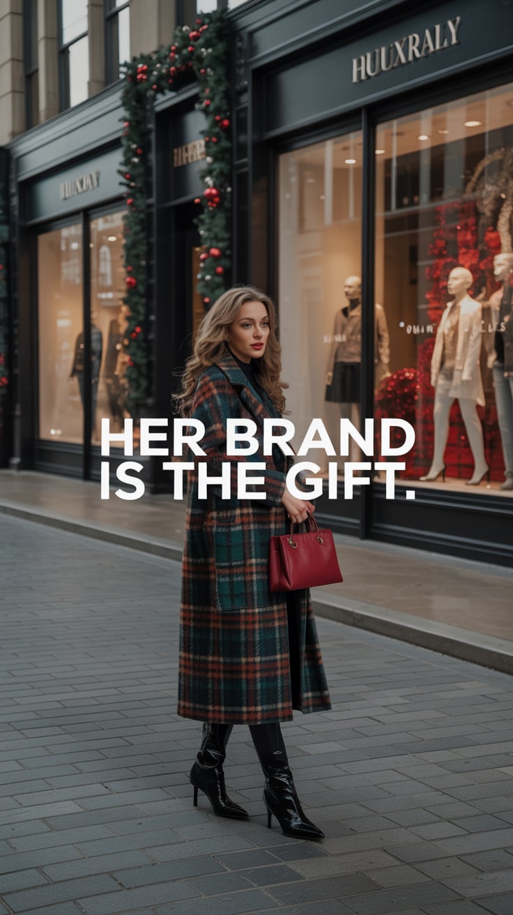 A cinematic city-street shot of a (skin tone) female in a plaid coat and heeled boots, standing befo...