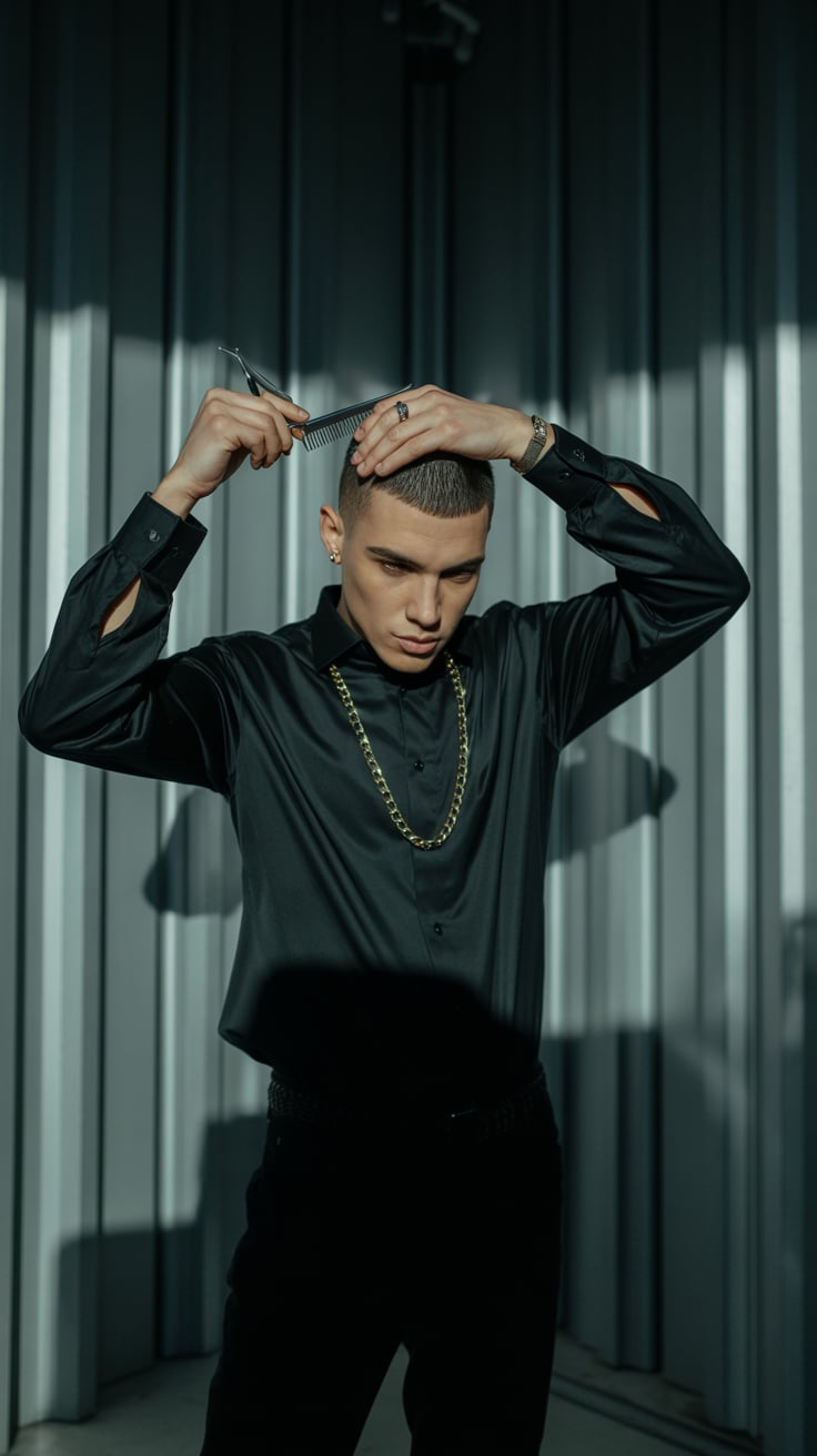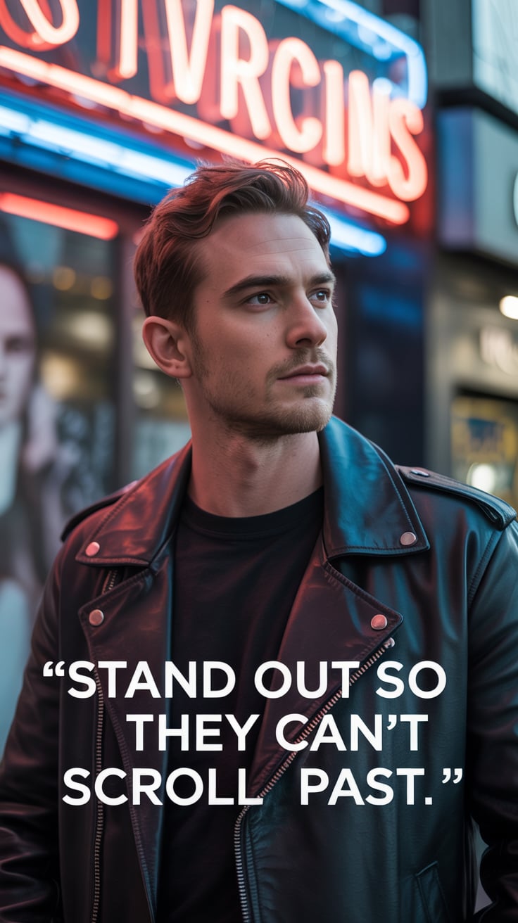 A fashion shot of a (skin color) (gender/subject) posing against a (stone wall / concrete wall / bri...