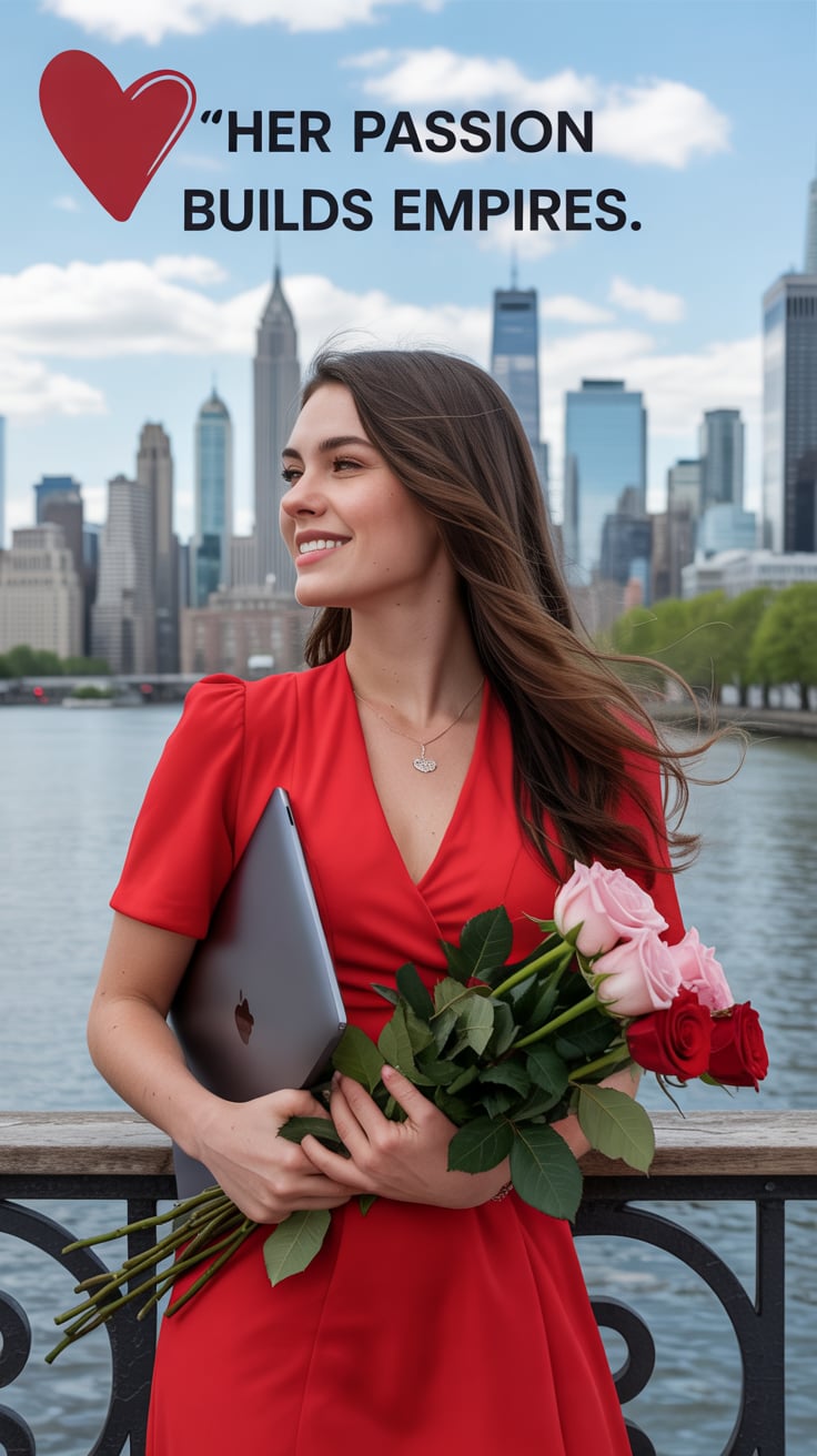 Editorial portrait of a (skin tone) female in a silky red gown, holding a laptop and bouquet of rose...