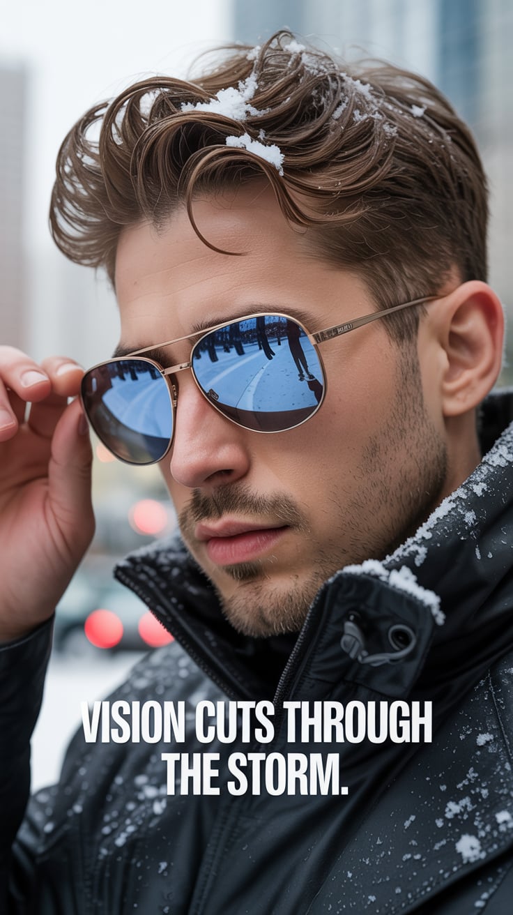An editorial close-up of a (skin tone) male adjusting metallic sunglasses as snowflakes catch in his...