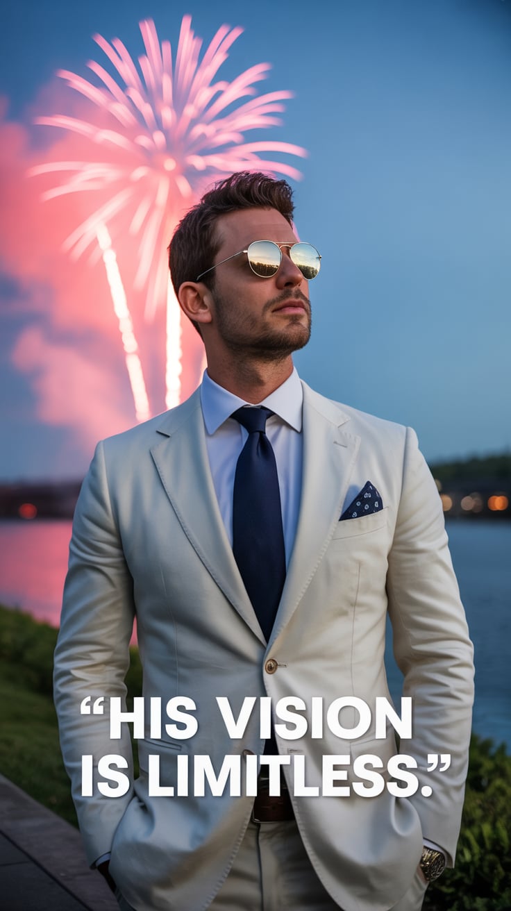 Editorial portrait of a (skin tone) male in a crisp white suit with a navy tie, sunglasses reflectin...