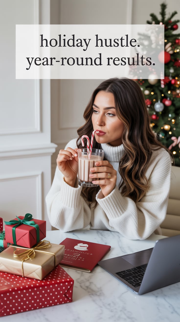 A luxury lifestyle scene of a (skin tone) female at a marble table with wrapped presents, laptop ope...