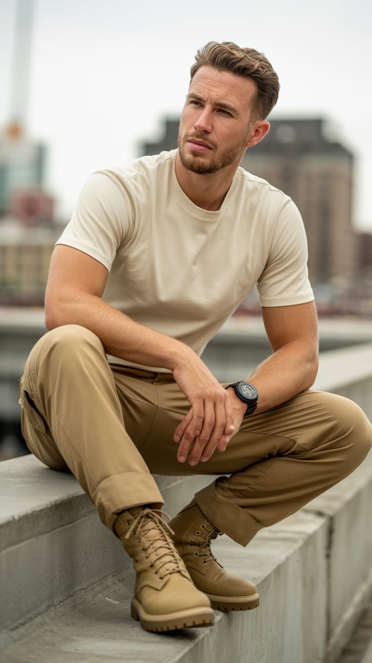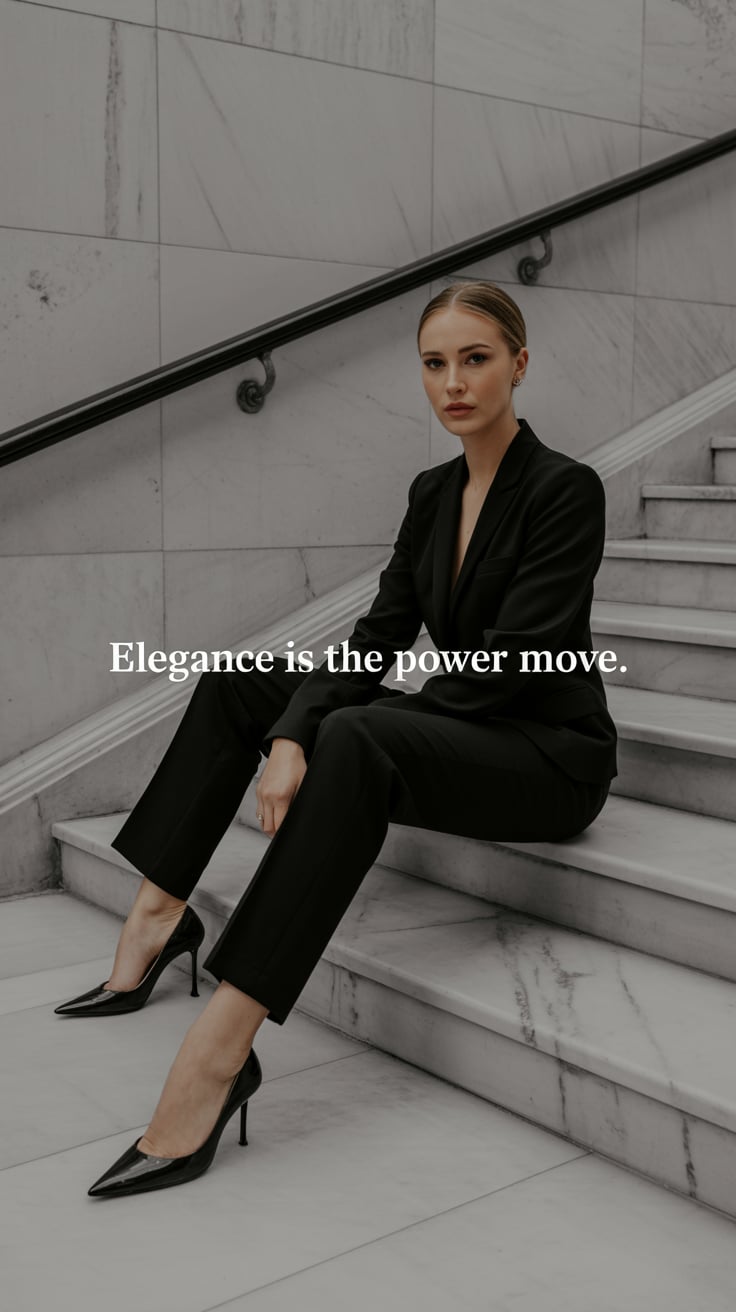 A professional fashion photography shot of a (gender/subject) sitting on concrete steps against a we...