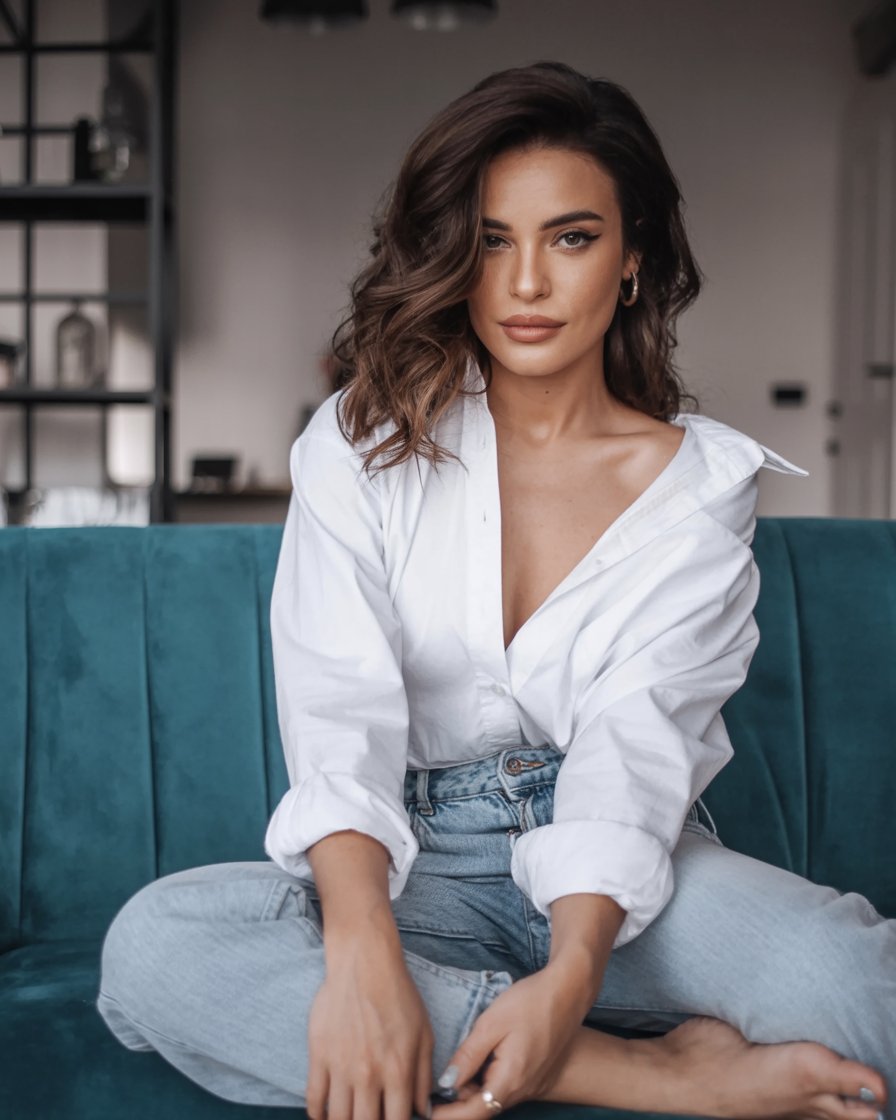 You just "plug in" the specifics you want → e.g., "a light-skinned woman, long brunette hair, loose curls, wearing a white blouse and jeans, sitting cross-legged on a sofa."
