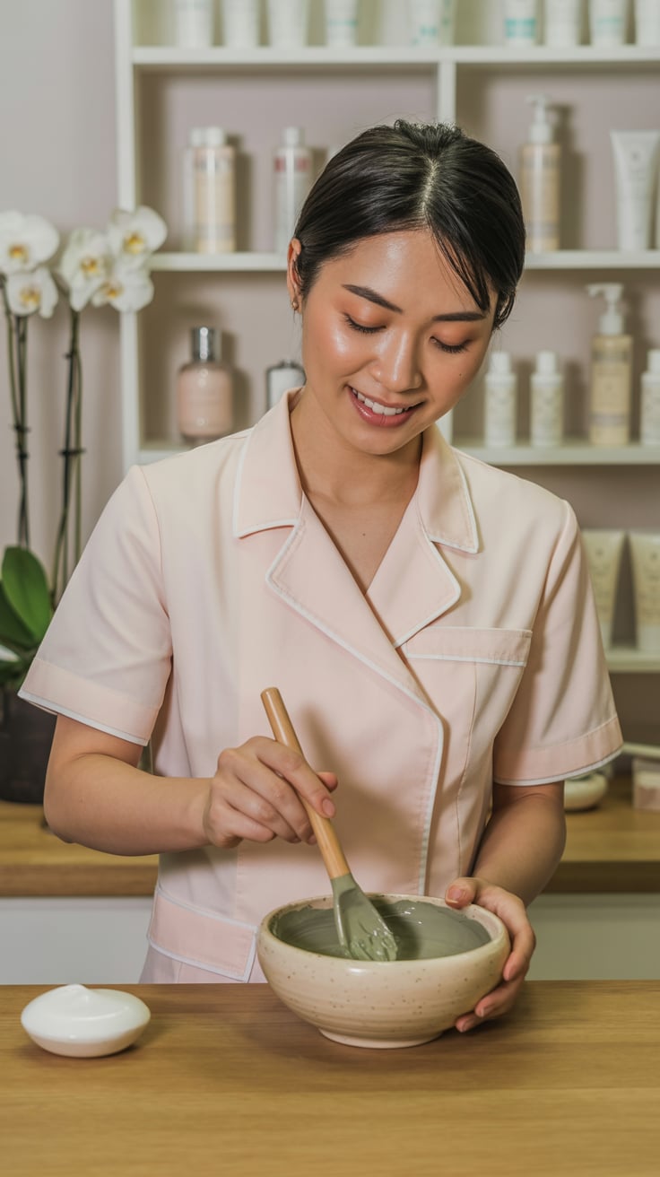 A professional studio portrait against a plain light-gray backdrop. A (skin color) (age range) (gend...