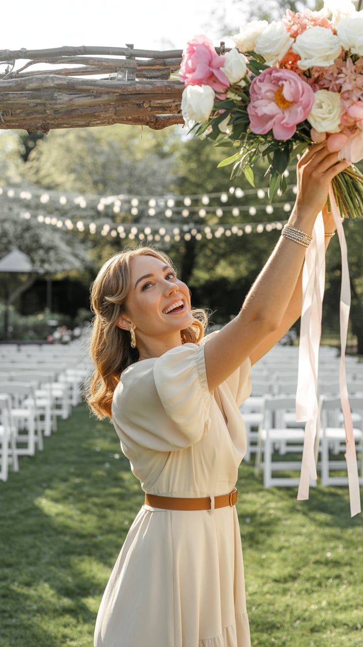 A cinematic lifestyle photo of a (skin tone) female holding a champagne glass at an outdoor fall wed...