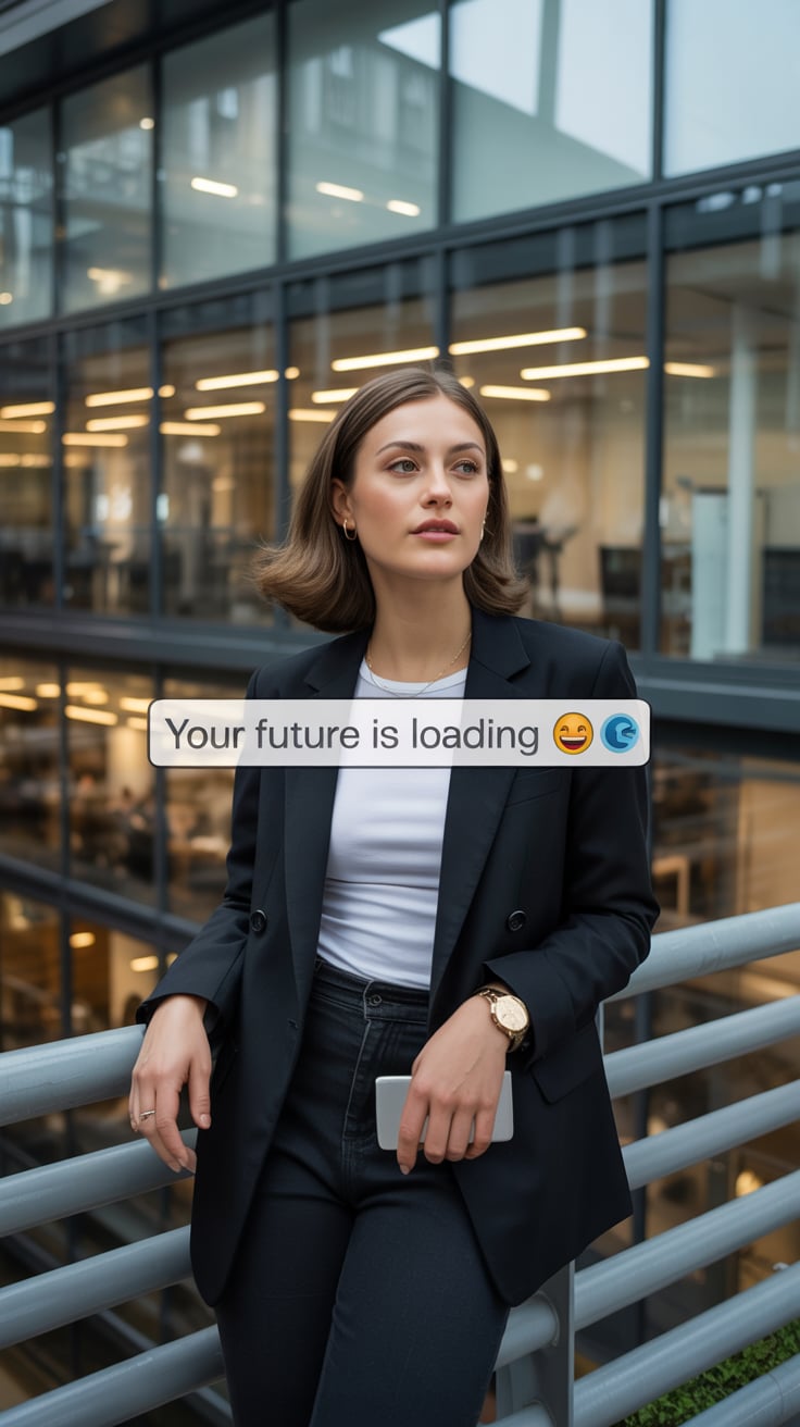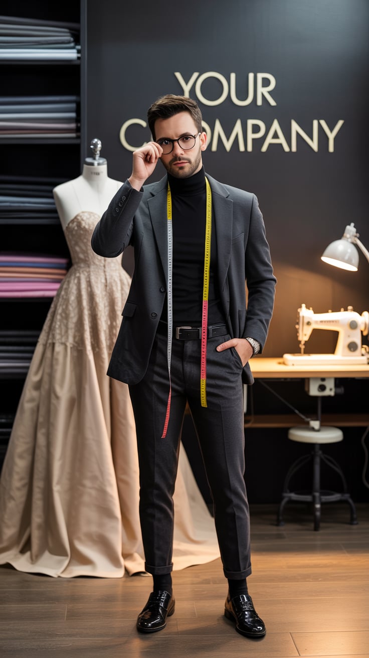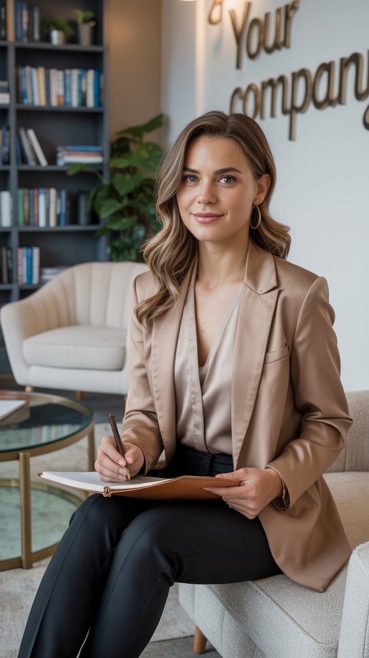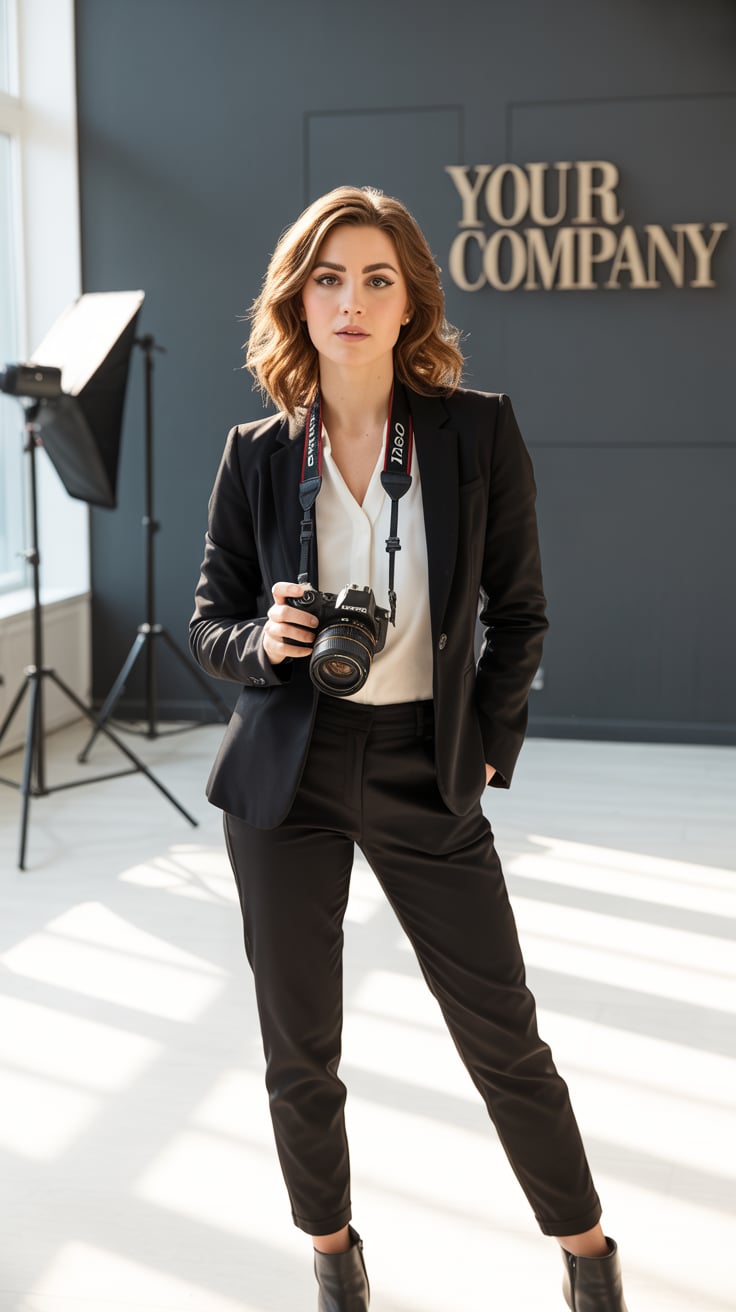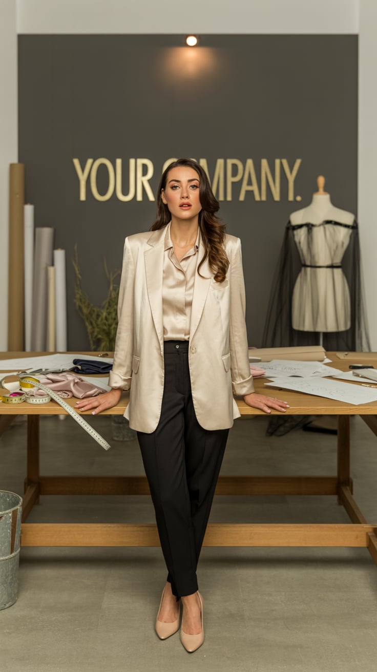 A professional business portrait in a modern industrial setting. A (gender/subject) wearing a (top: ...