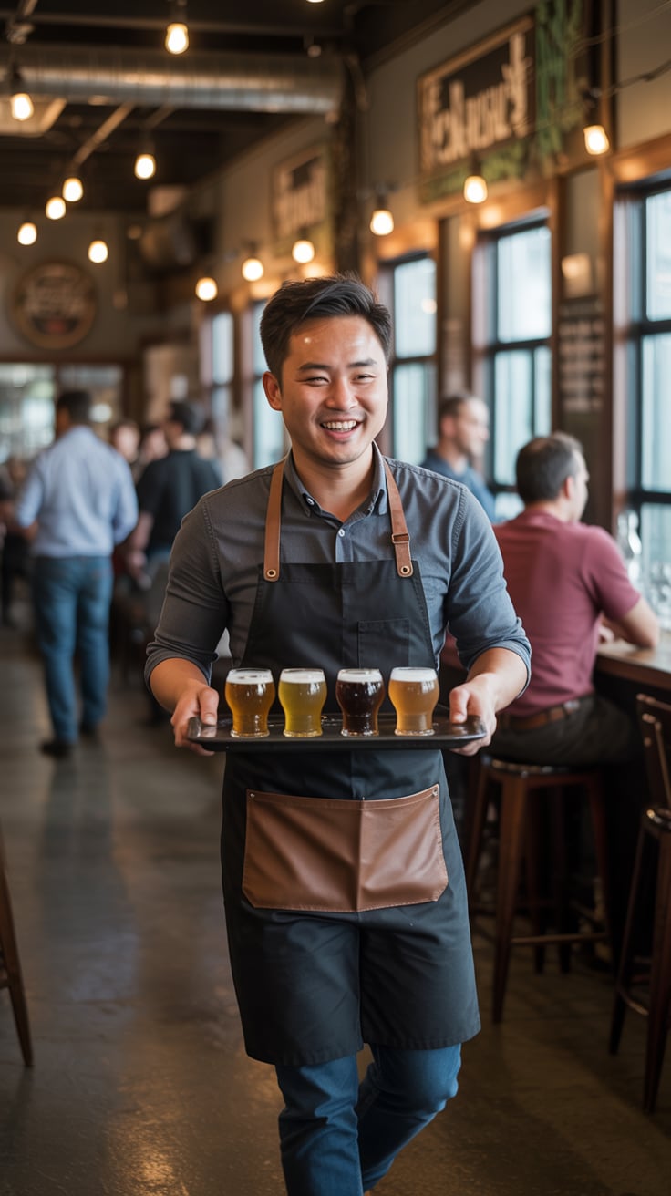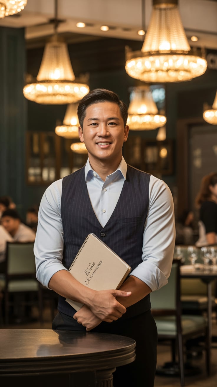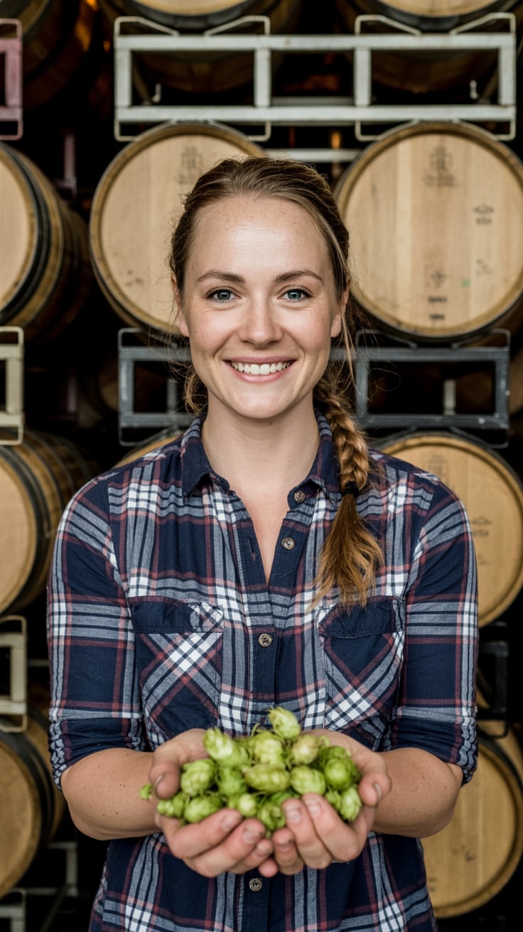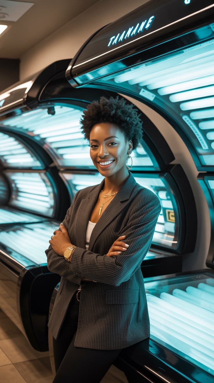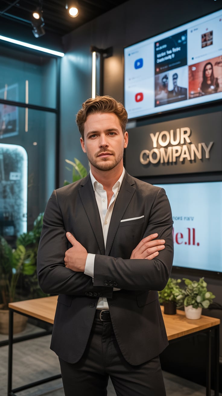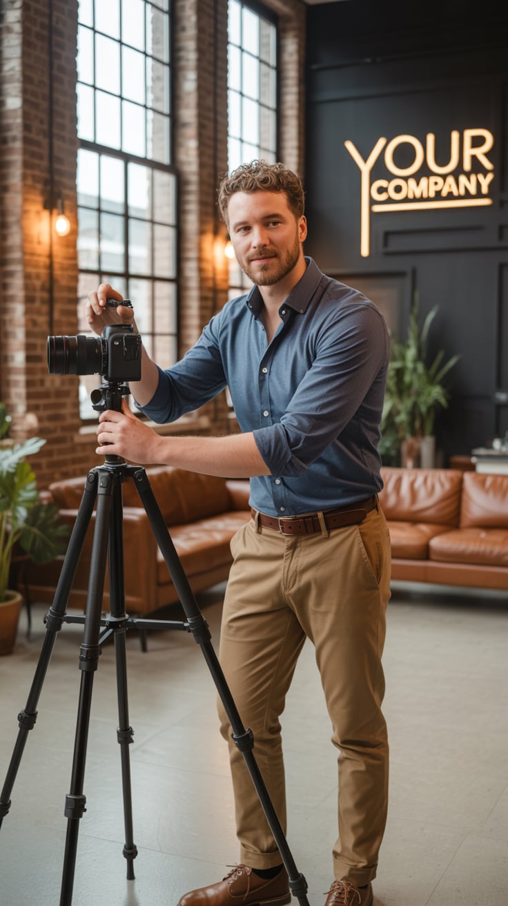A professional business portrait in a modern industrial setting. A (gender/subject) wearing a (top: ...
