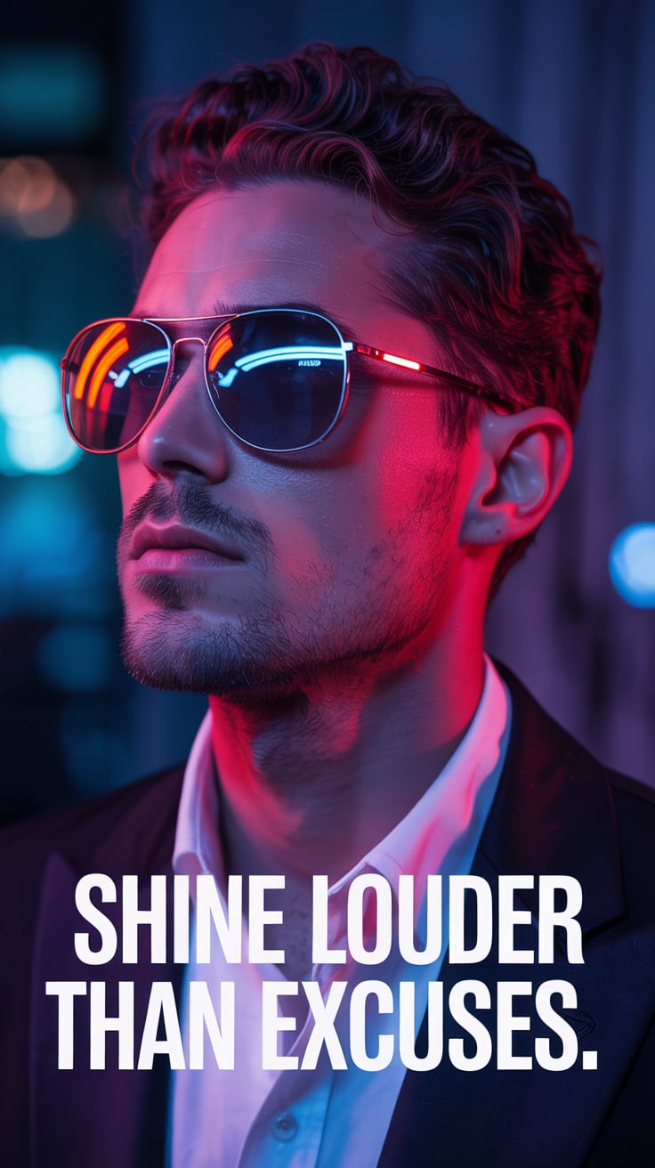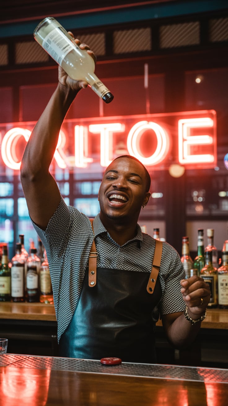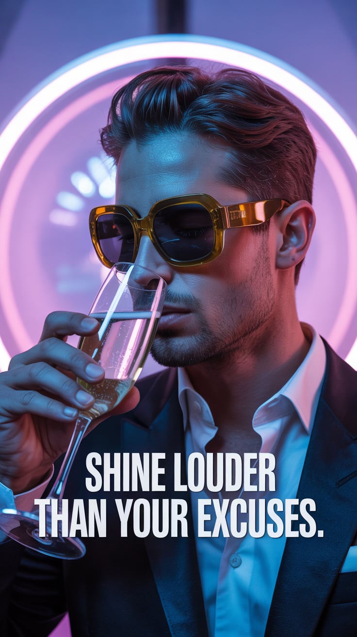Luxury rooftop shot of a (skin tone) male in a black velvet blazer, sipping whiskey under neon orang...